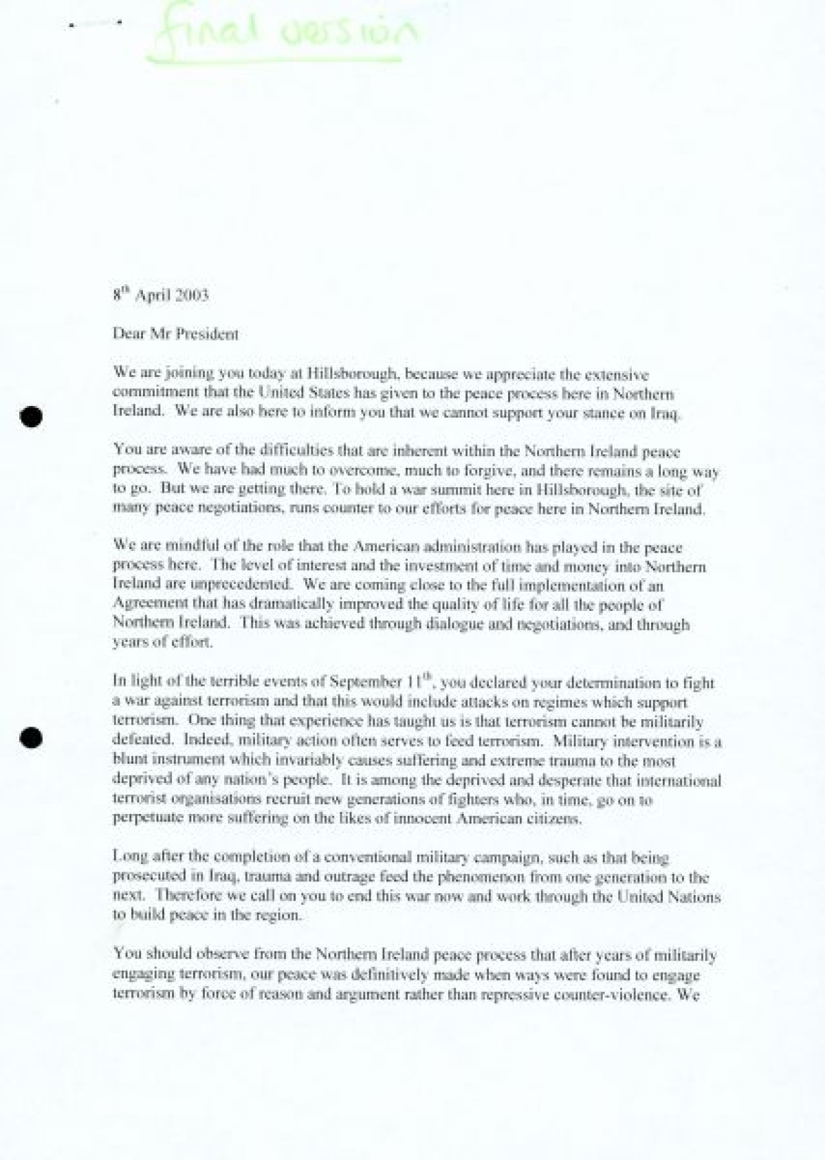 Northern Ireland Women's Coalition addressed to former President of the United States, George Bush, protesting the war in Iraq and highlighting the role of dialogue and collaboration as opposed to military intervention during the peace process in Northern Ireland.