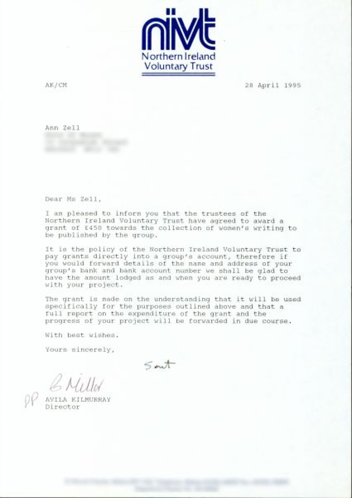 Northern Ireland Voluntary Trust regarding funding approval to publish a collection of women's writing from the