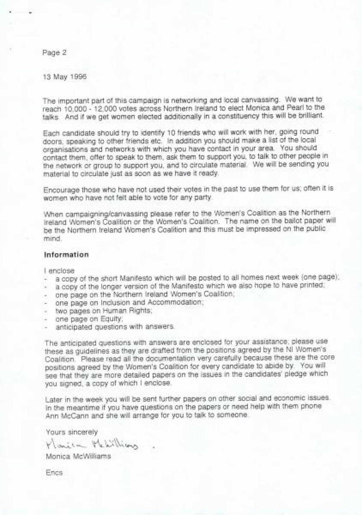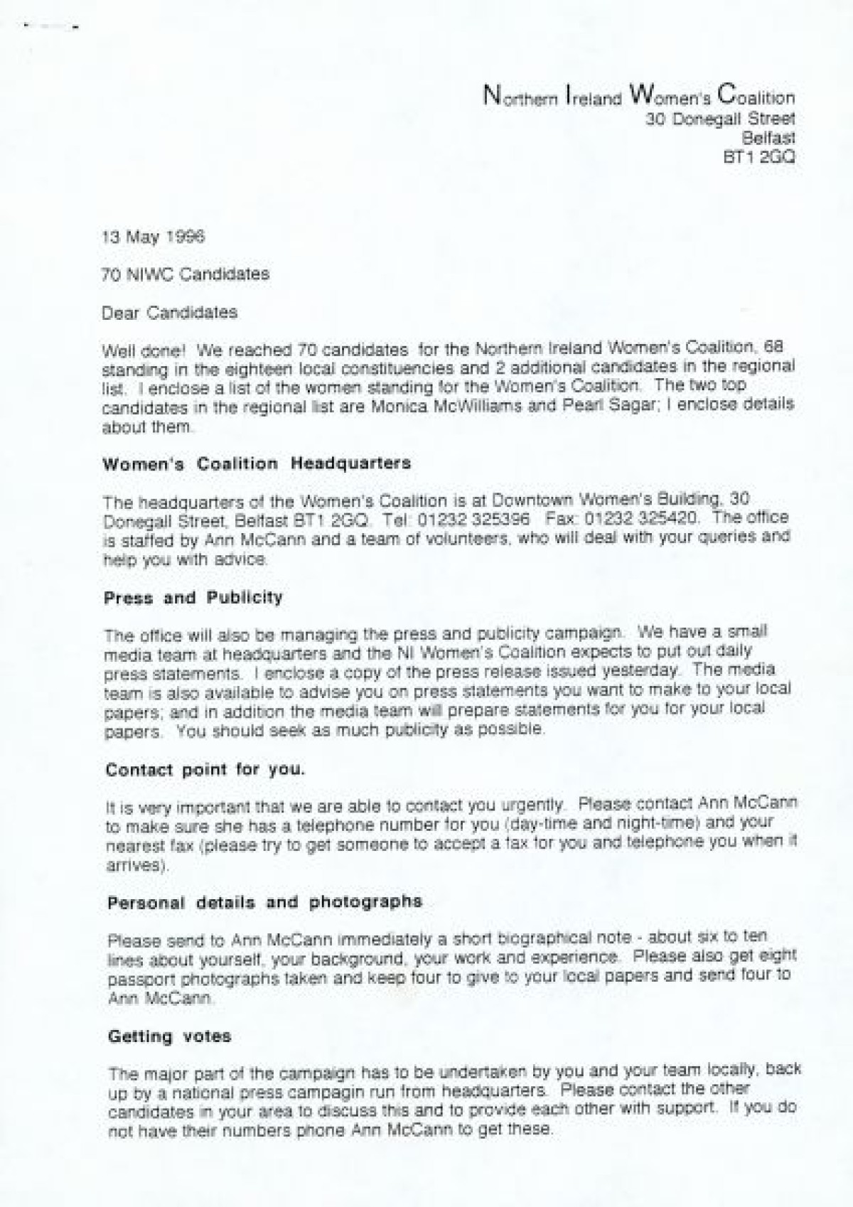 Women's Coalition headquarters, press and publicity, contact points, personal details and photographs, getting votes, identifying friends, and further information.