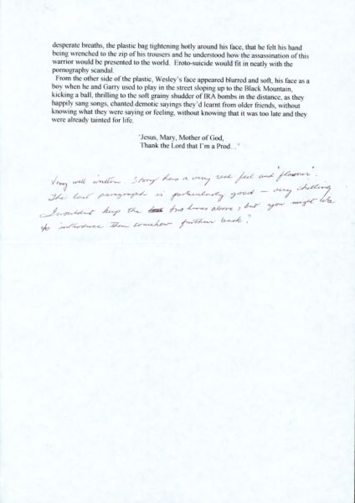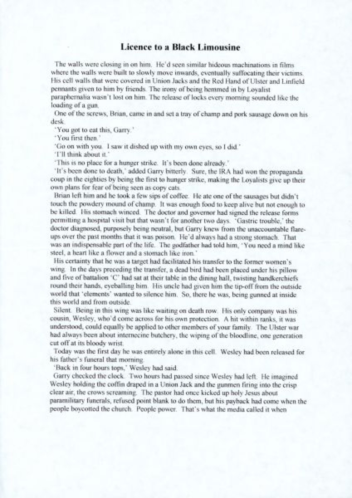 Short story by Rosemary Jenkinson titled, "License to a Black Limousine," with a handwritten annotation on the final page commending the writing.