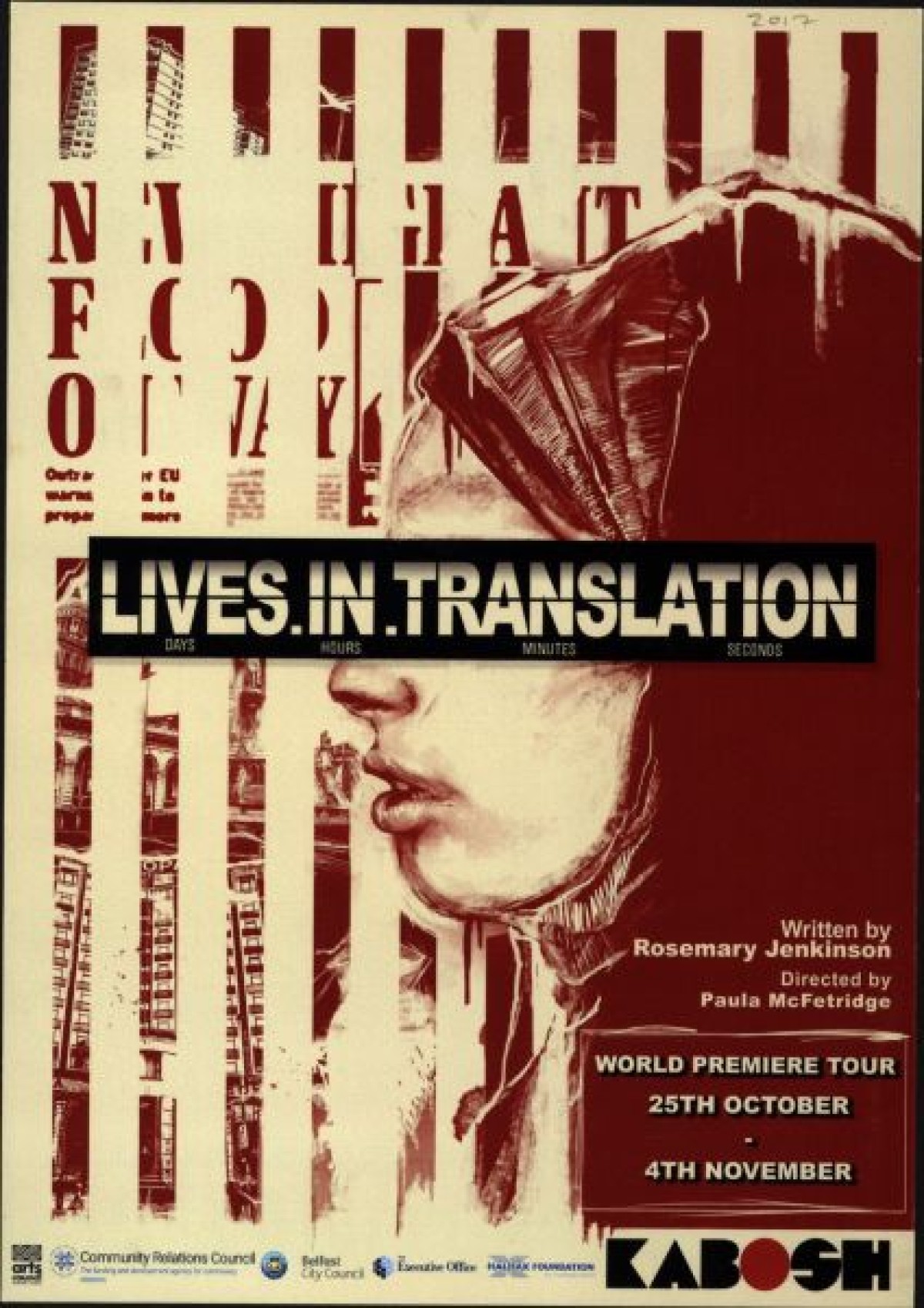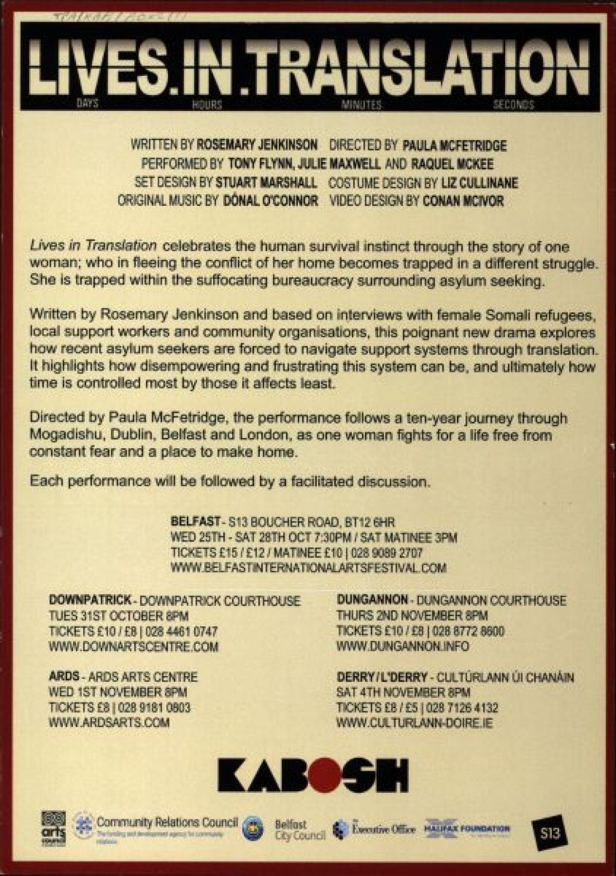 Flyer for 'Lives in Translation,' a play based on interviews with Somali female refugees, by playwright Rosemary Jenkinson. Produced by