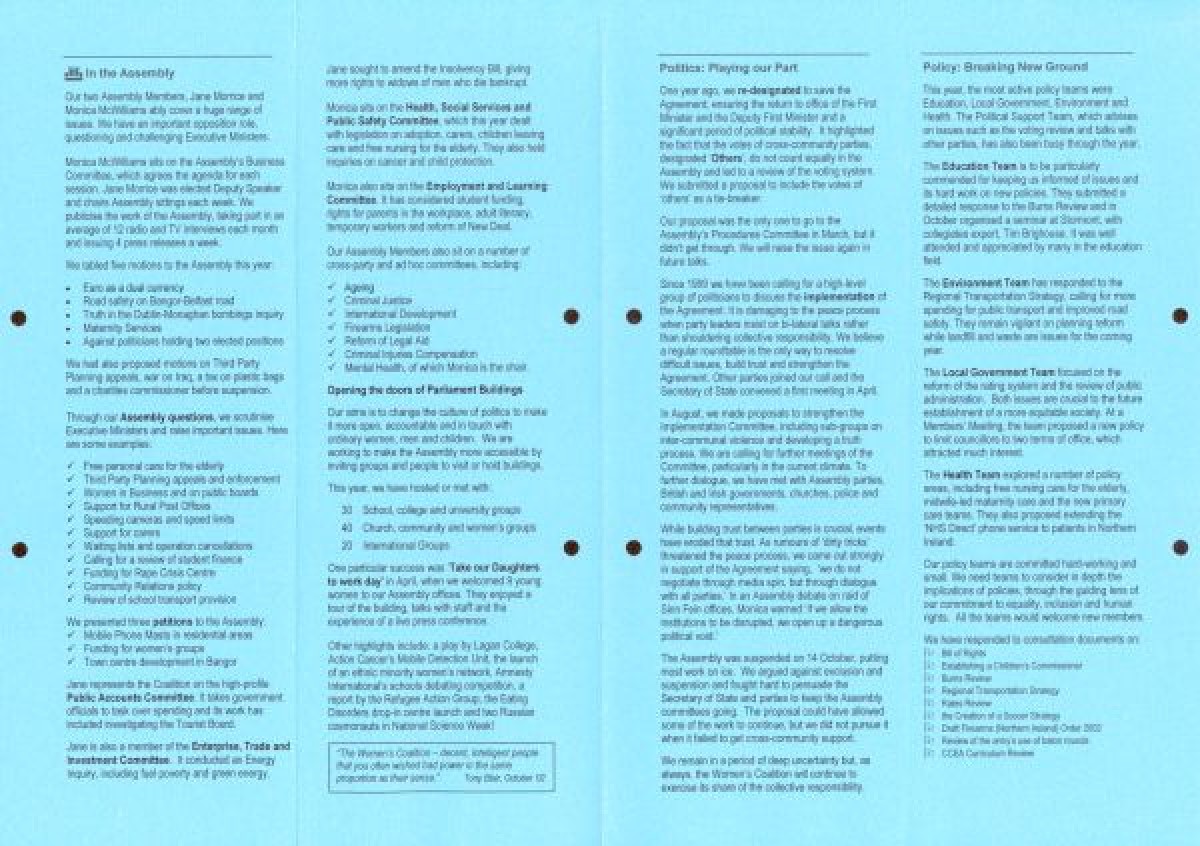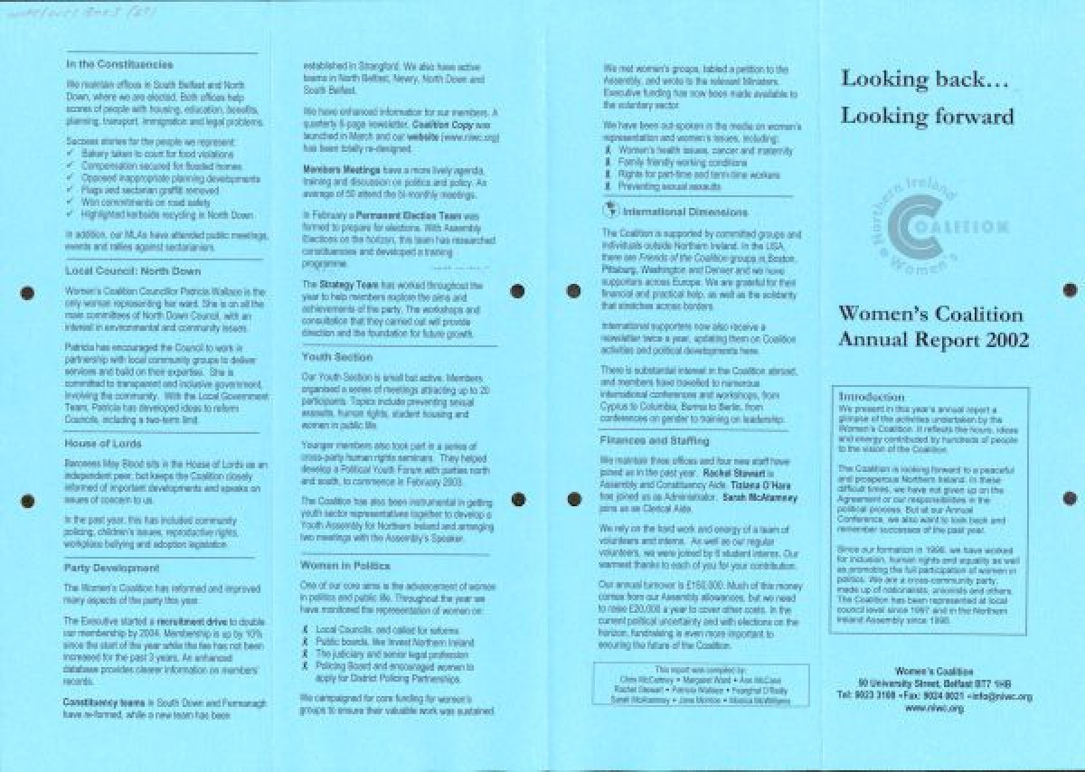 Northern Ireland Women's Coalition Annual Report compiled by Chris McCartney, Margaret Ward, Ann McCann, Rachel Stewart, Patricia Wallace, Fearghal O'Reilly, Sarah McAtamney, Jane Morrice, Monica McWilliams. Contains summary of Assembly activities, policy development, activities in constituencies and local council, hosting schools, churches, community groups, women's groups and international groups at Stormont, and re-designation to ensure political stability and save the peace agreement.