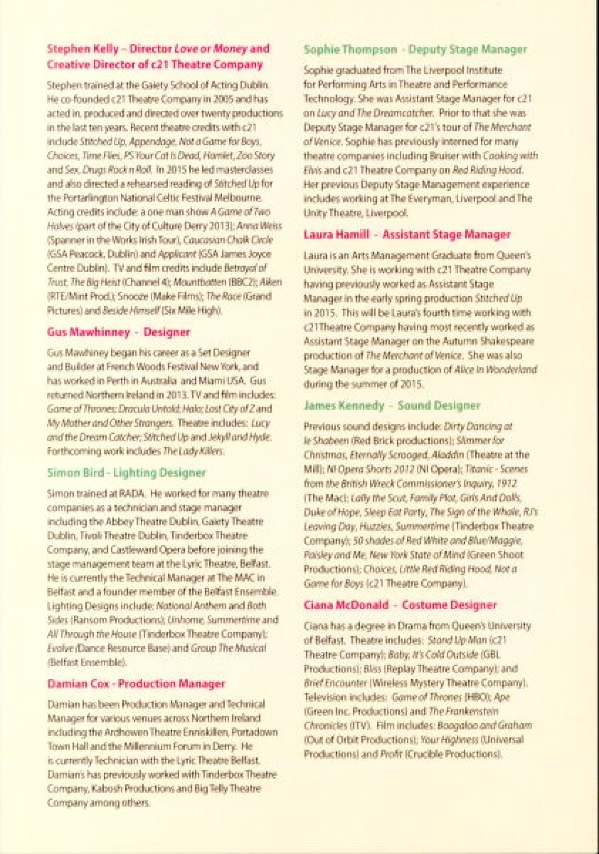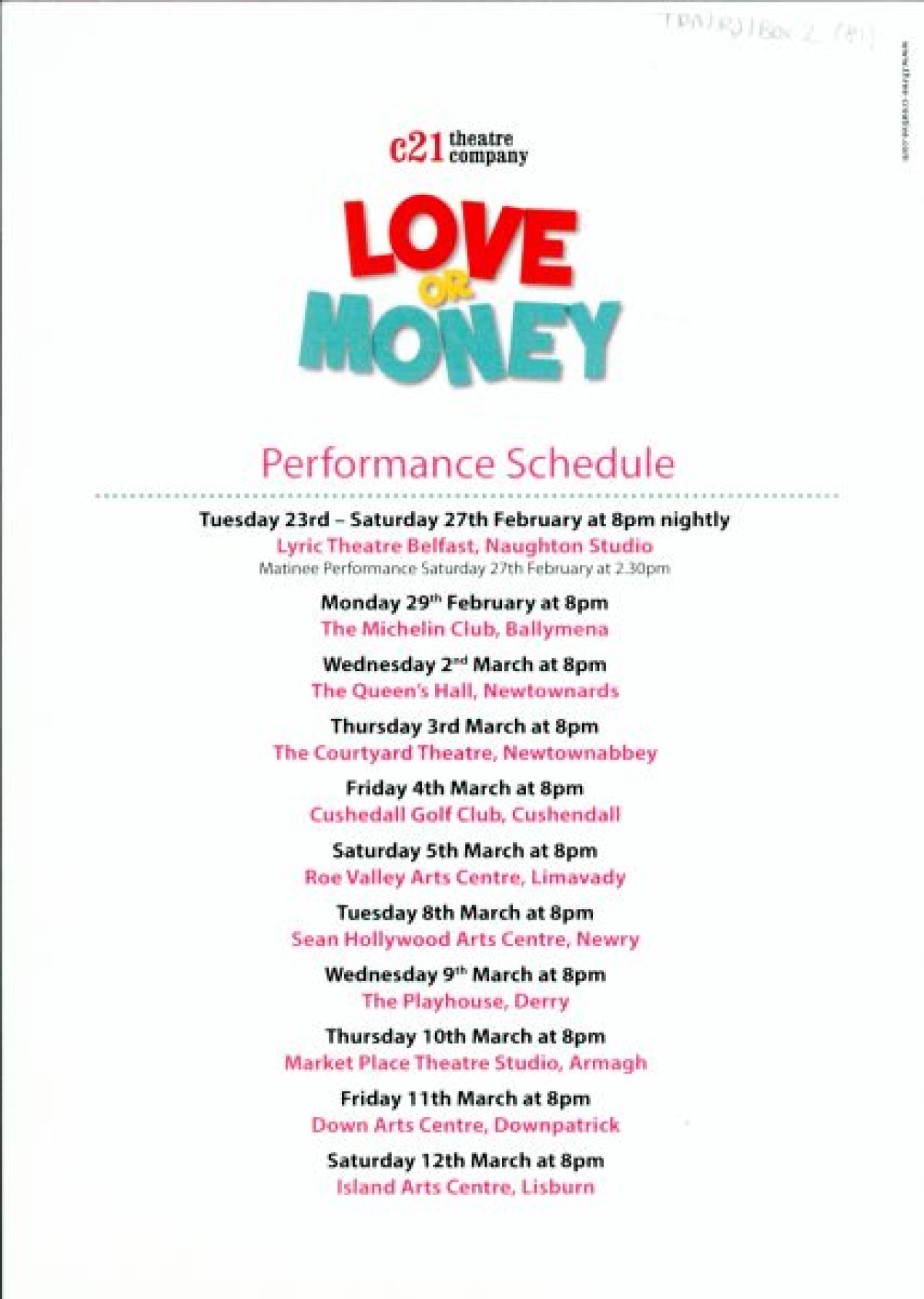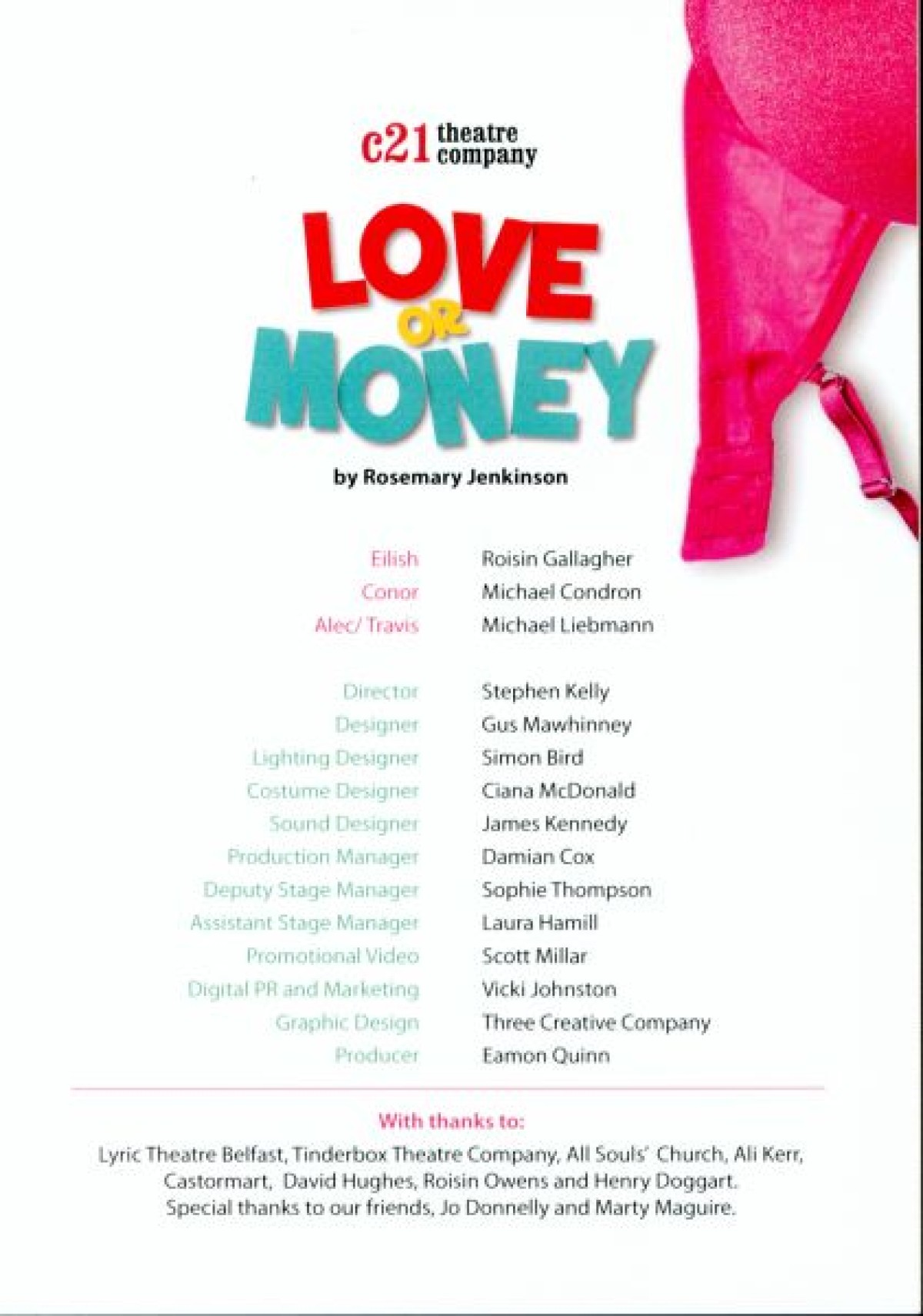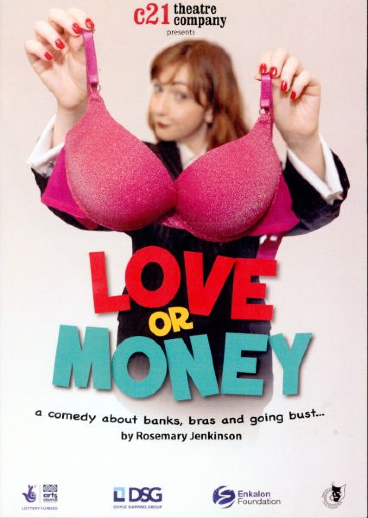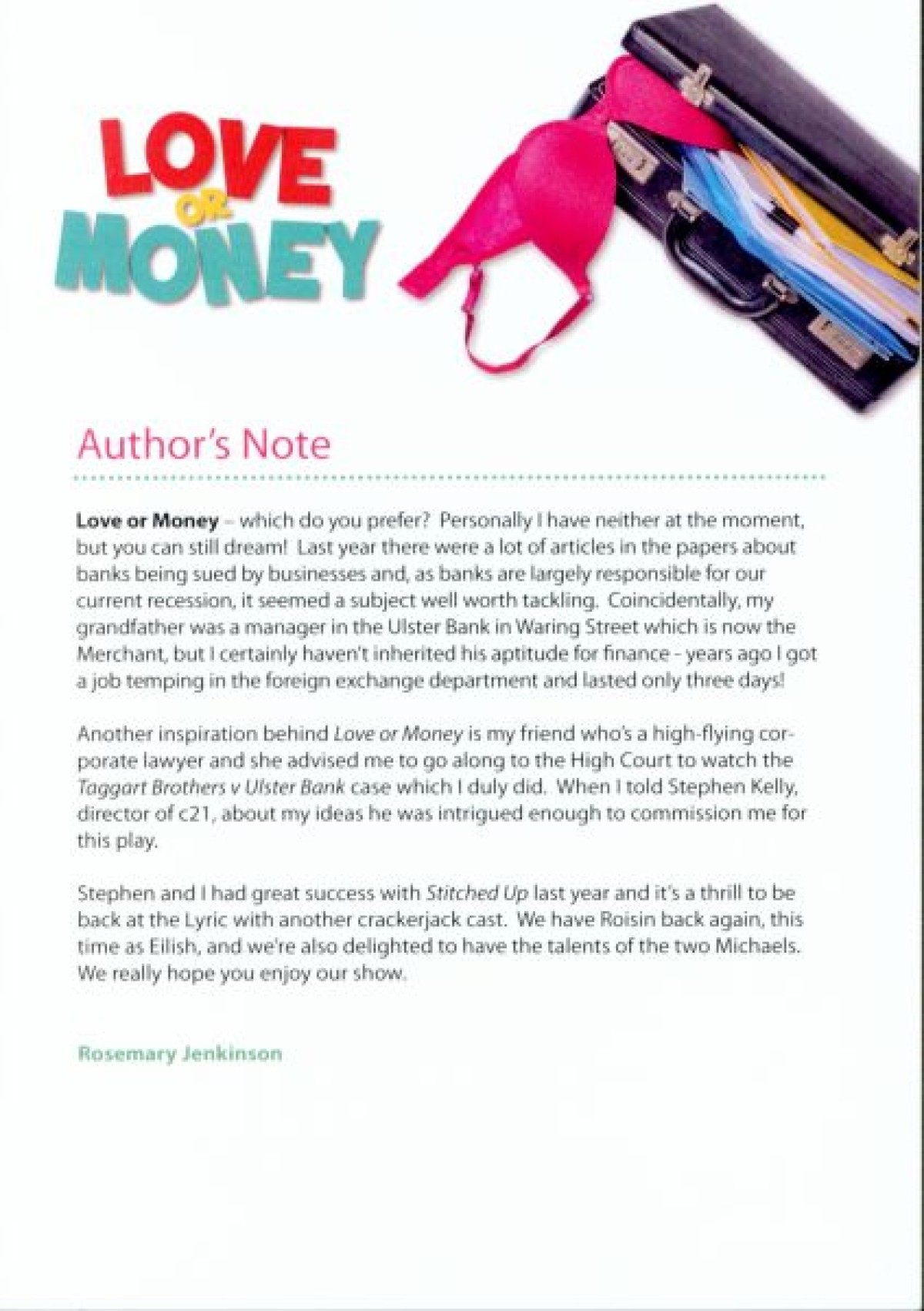 Programme for "Love or Money," a comedy play about banks, bras, and going bust, written by Rosemary Jenkinson. Contains an Author's note about her inspiration from newspaper articles during the recession and the