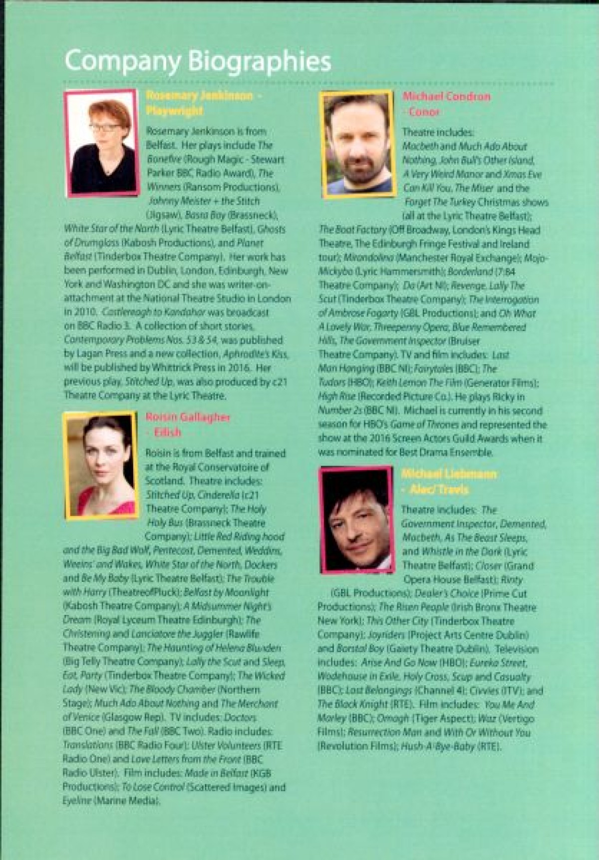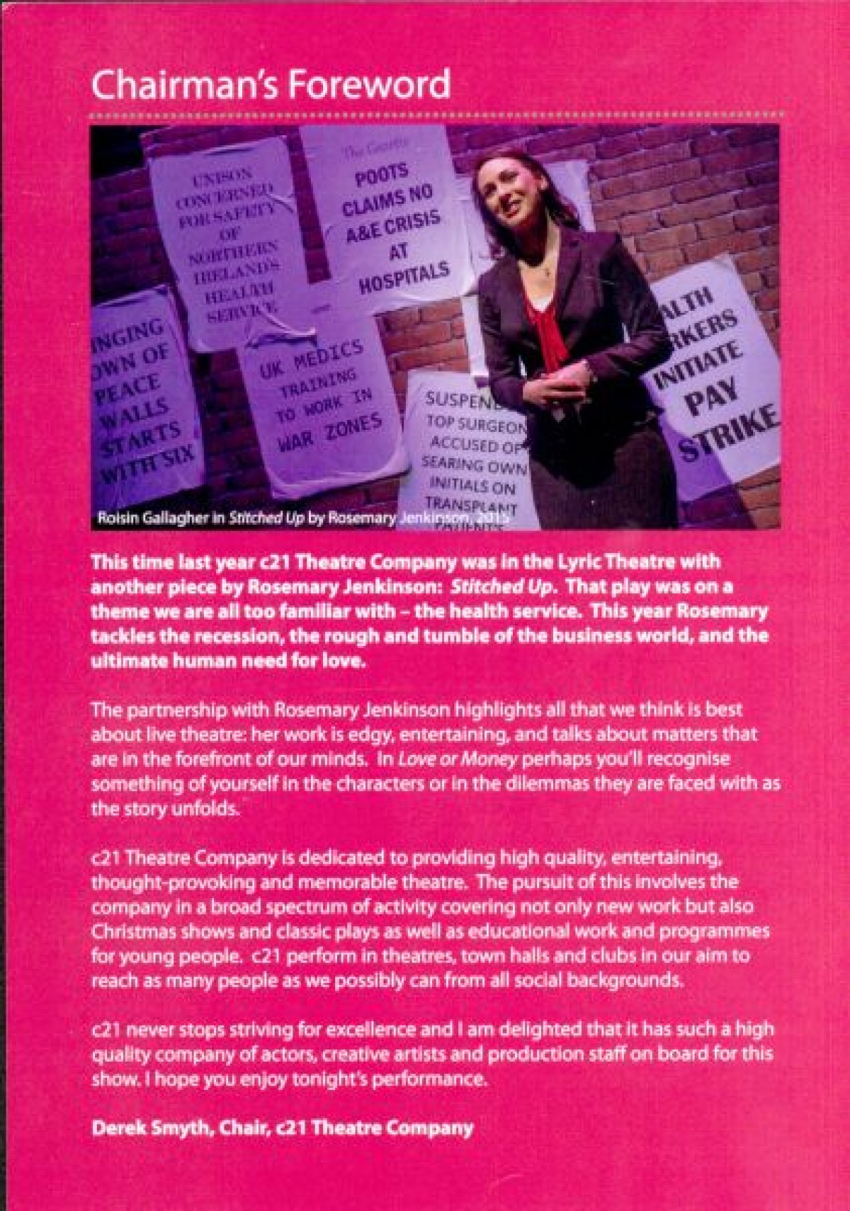 Ulster Bank High Court case. Also includes a chairman's foreward featuring a photograph of Roisin Gallagher in a production of "Stitched Up"; Cast and Production list; c21 Theatre Company biography profiles; and performance schedule.