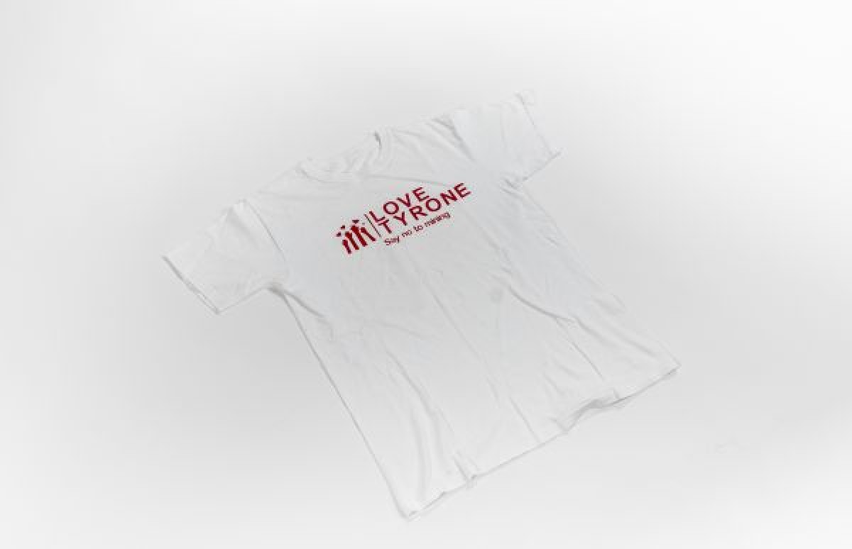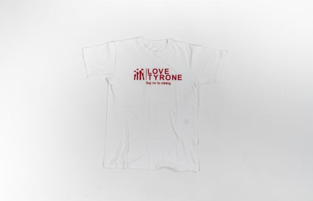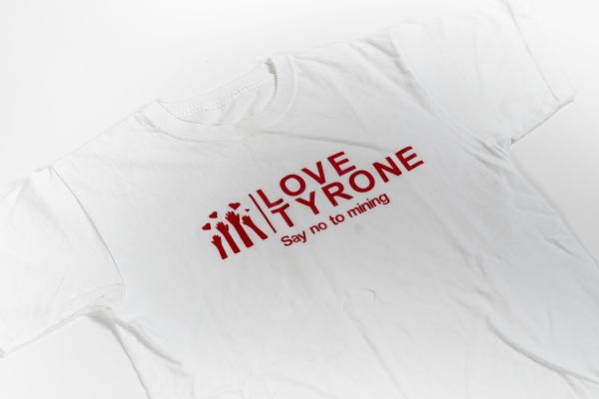 White t-shirt with red logo featuring an image of hands and hearts. Text reads, 'Love Tyrone. Say no to mining.' The t-shirt was produced by