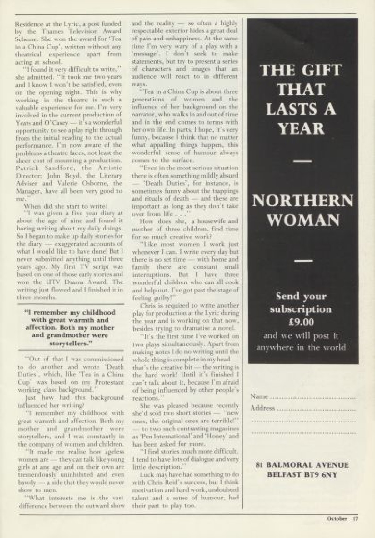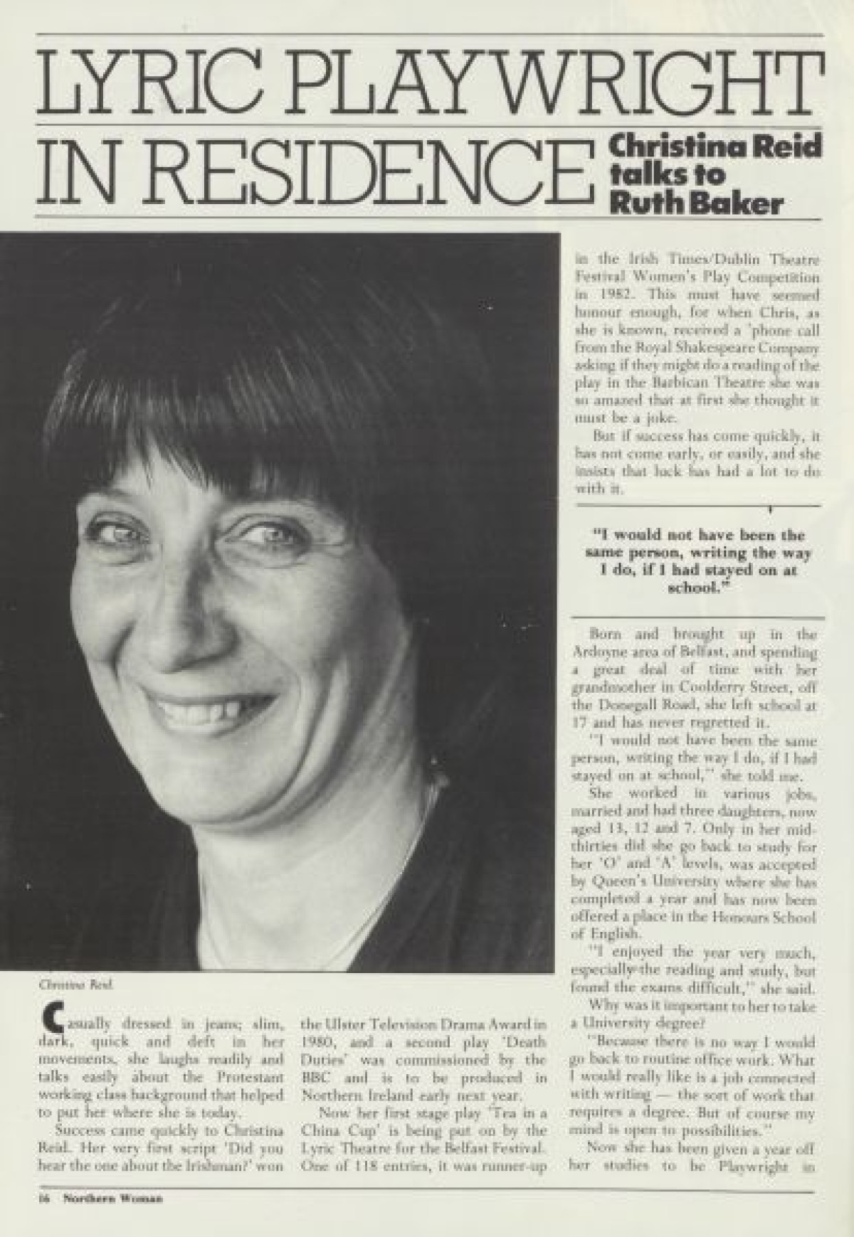 Lyric Playwright in Residence: Christina Reid talks to Ruth Baker