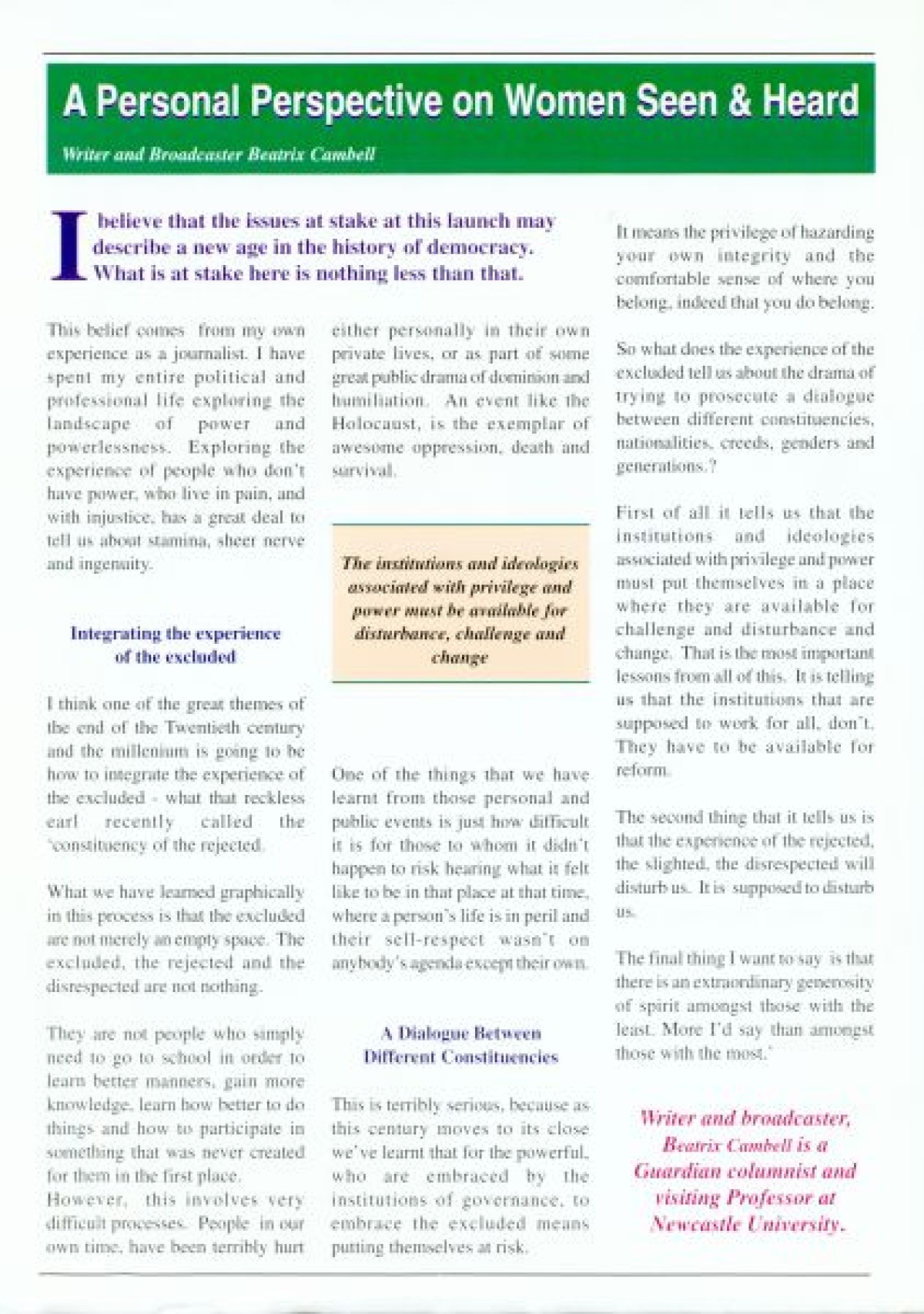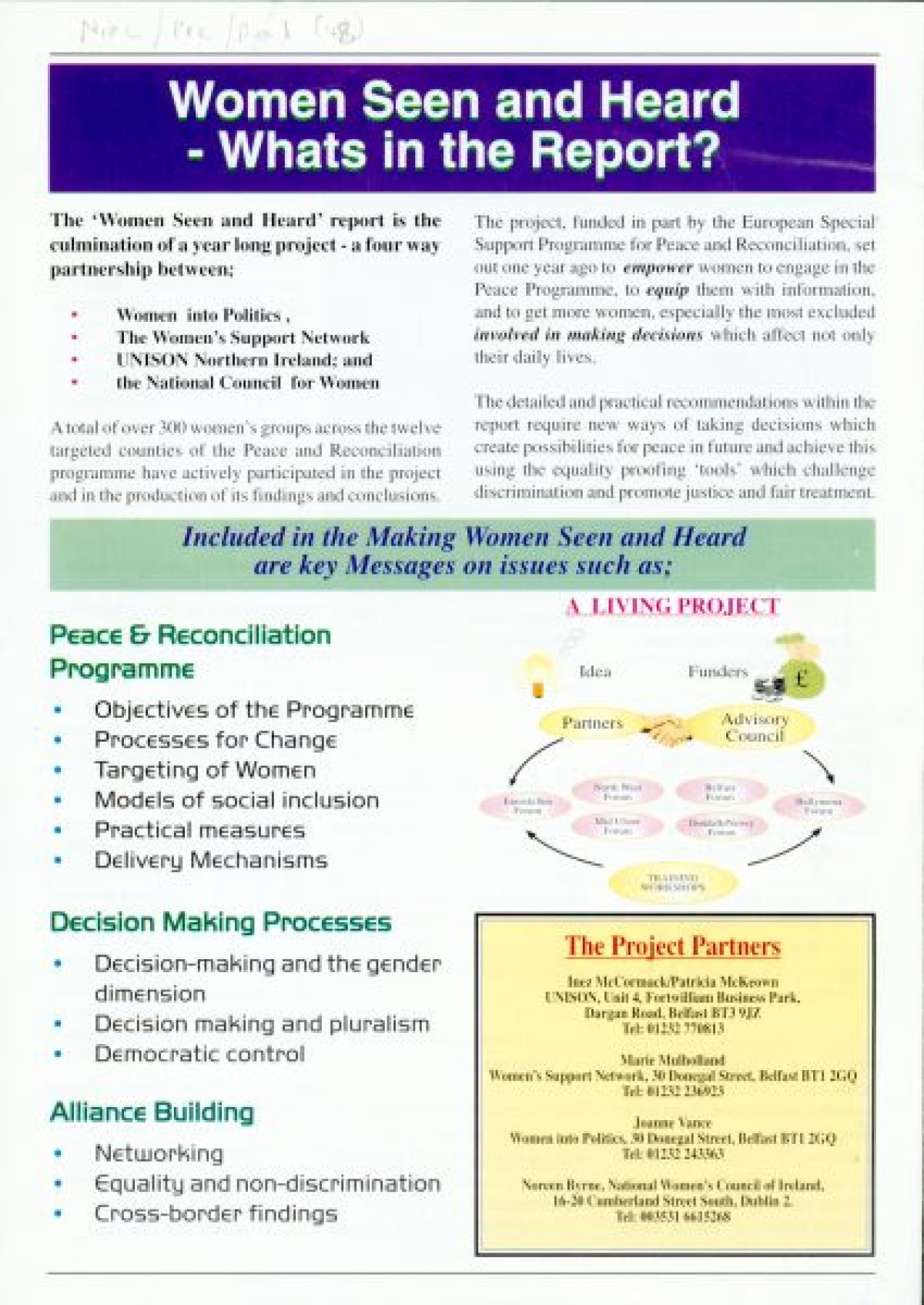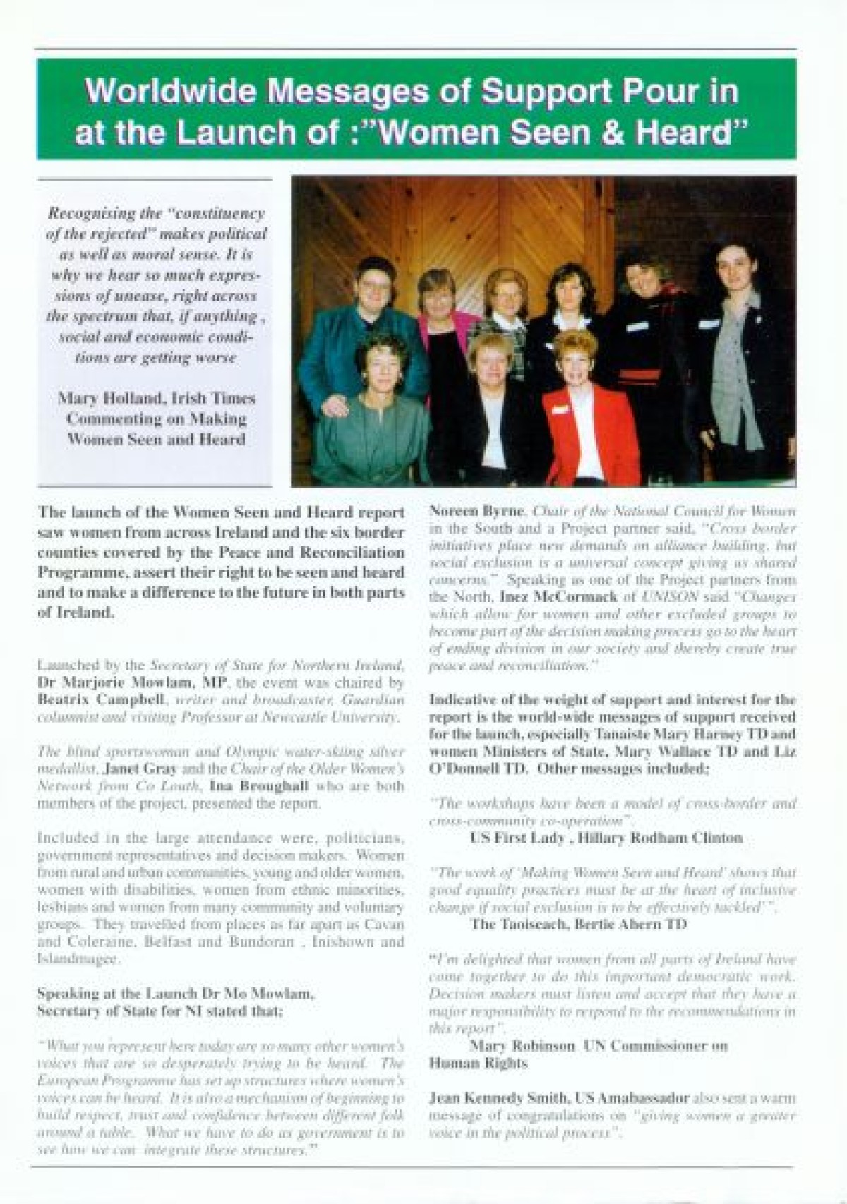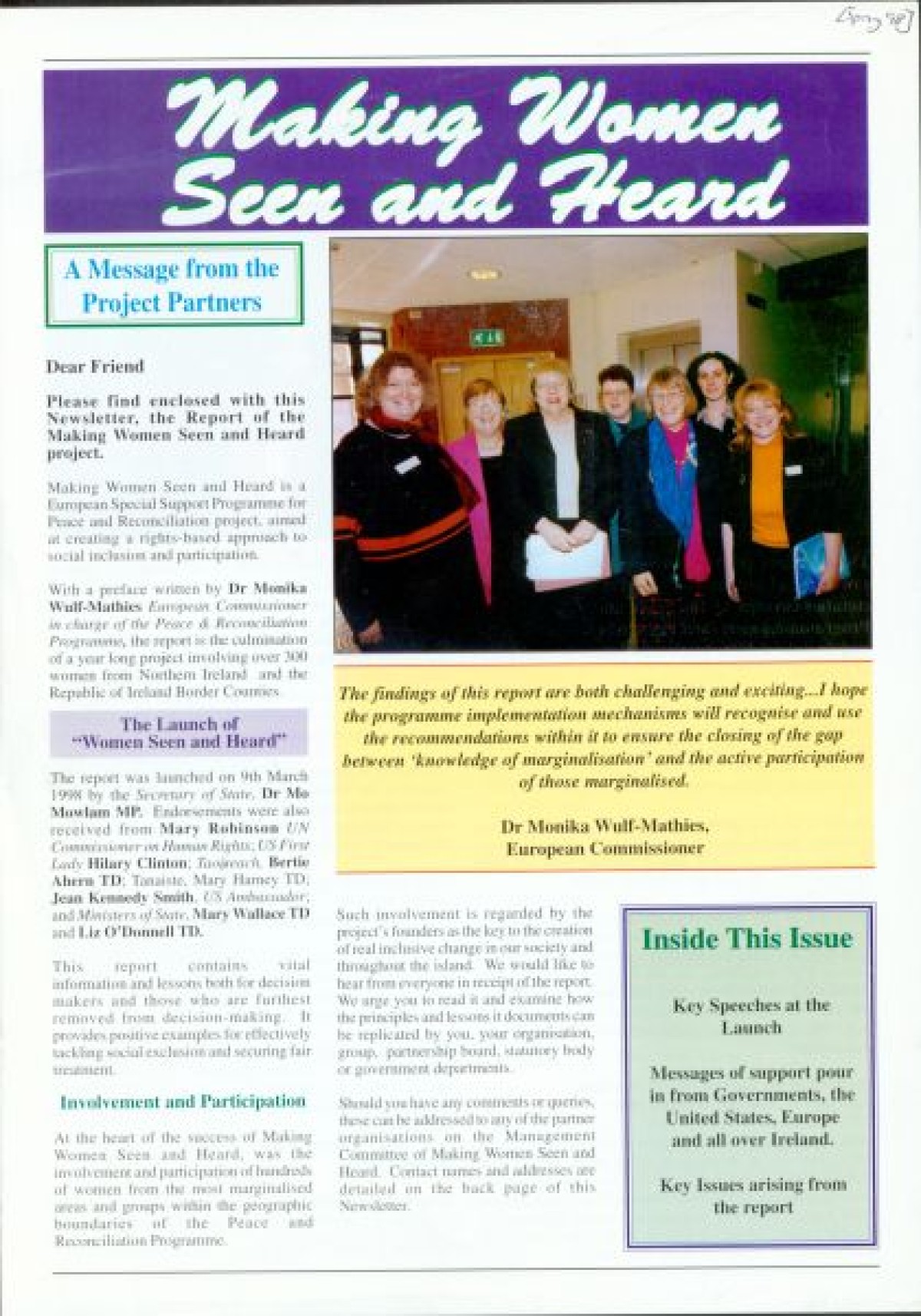 Bulletin relating to the European Special Support Programme for Peace and Reconciliation project, titled Making Women Seen and Heard. Produced in Spring 1998. Contents include key speeches and colour photographs from the launch; a "Personal Perspective" on the project, by writer and broadcaster Beatrix Campbell; Outline of the contents of the report; and messages of support from leaders, including Mary Robinson, Hillary Clinton, Jean Kennedy Smith, Inez McCormack, Dr Mo Mowlam, Janet Gray, Ina Broughall, Beatrix Campbell, Noreen Byrne and Bertie Ahern.