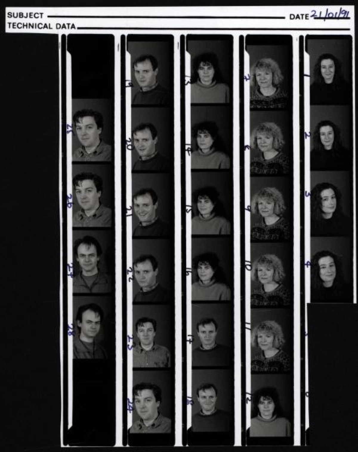 Charabanc Theatre Company production; "Me and my Friend." Includes black and white photo contact sheets, containing head shots of playwright Gillian Plowman, and actors Guy Barriscale, Mark O'Reegan, Michael Ford, Lynne Parker, Carol Scanlan (Moore), and Eleanor Methven.