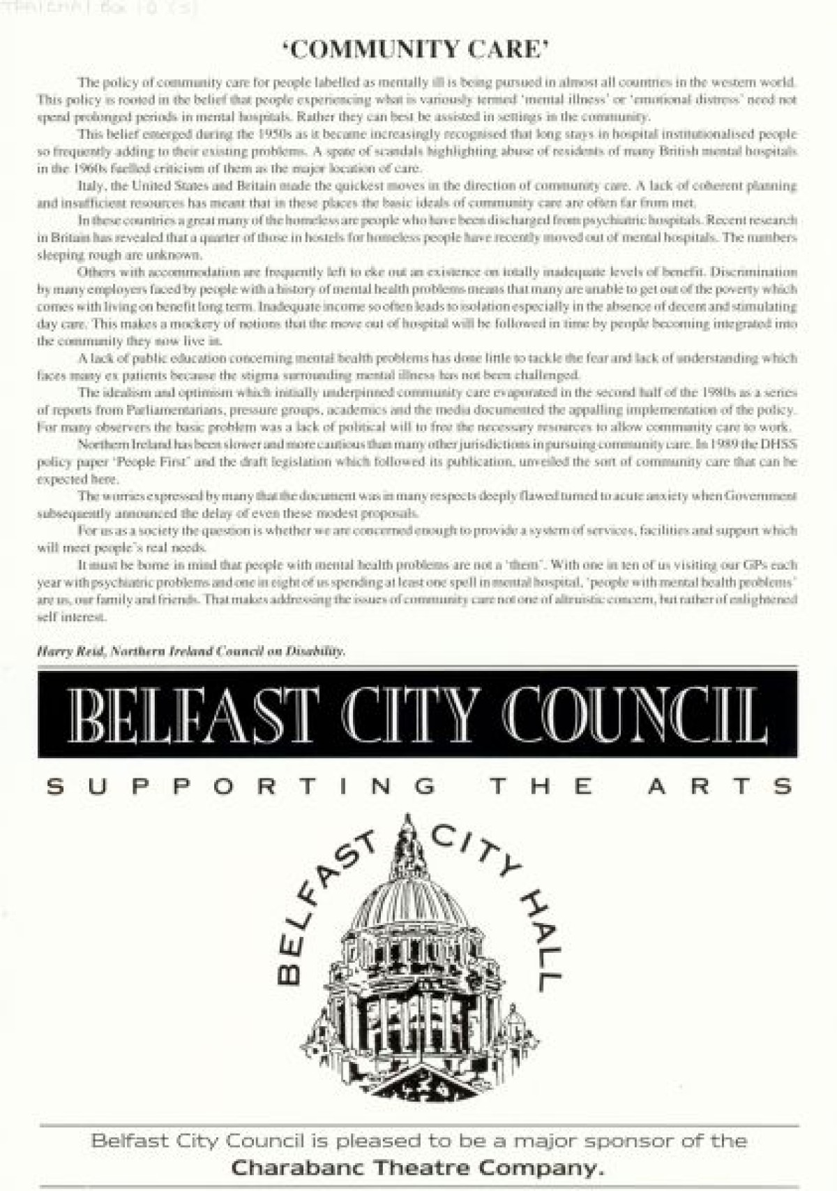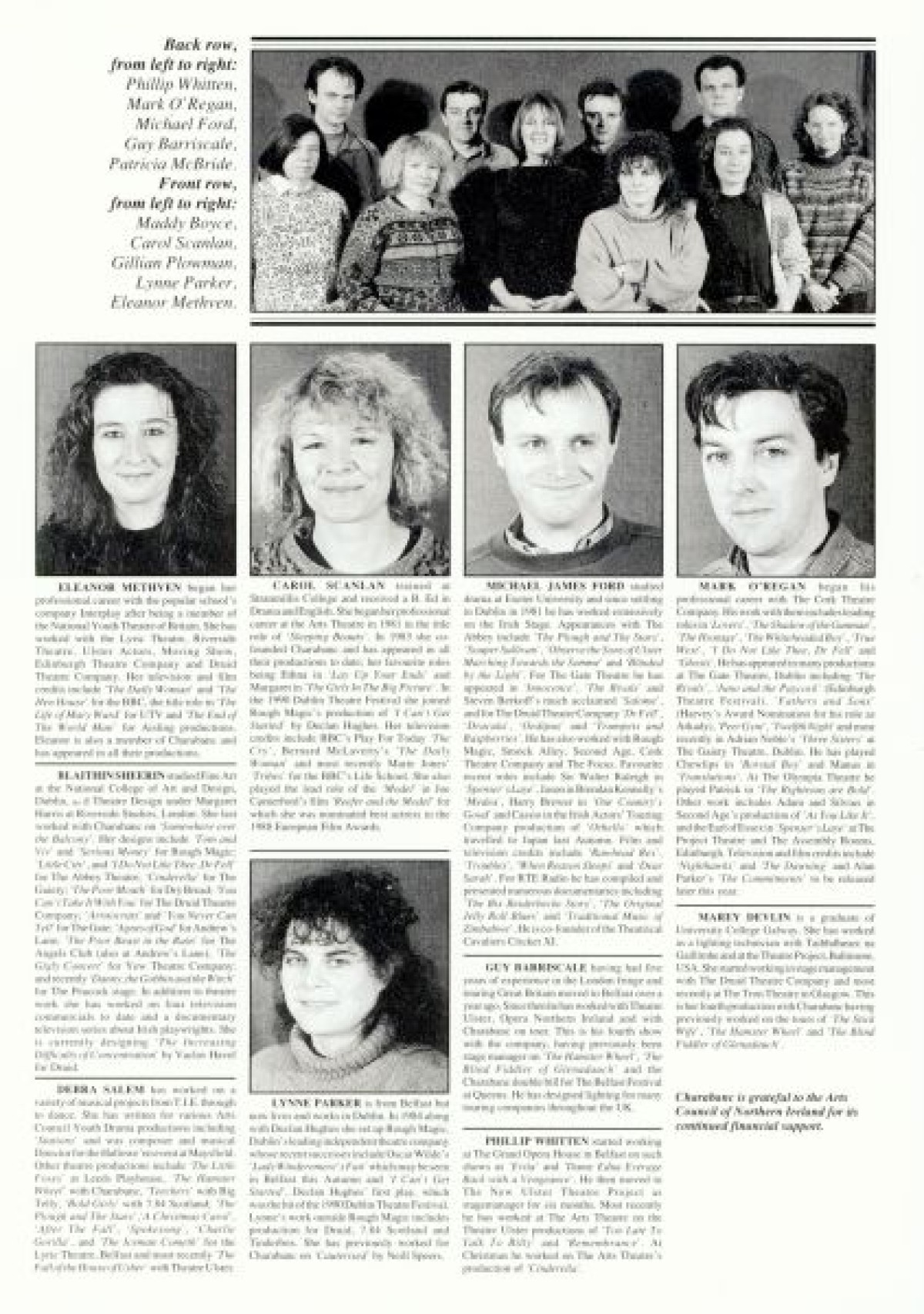Charabanc Theatre Company and directed by Lynne Parker. Includes photographs, a casting list and biographies of key individuals involved in the production.