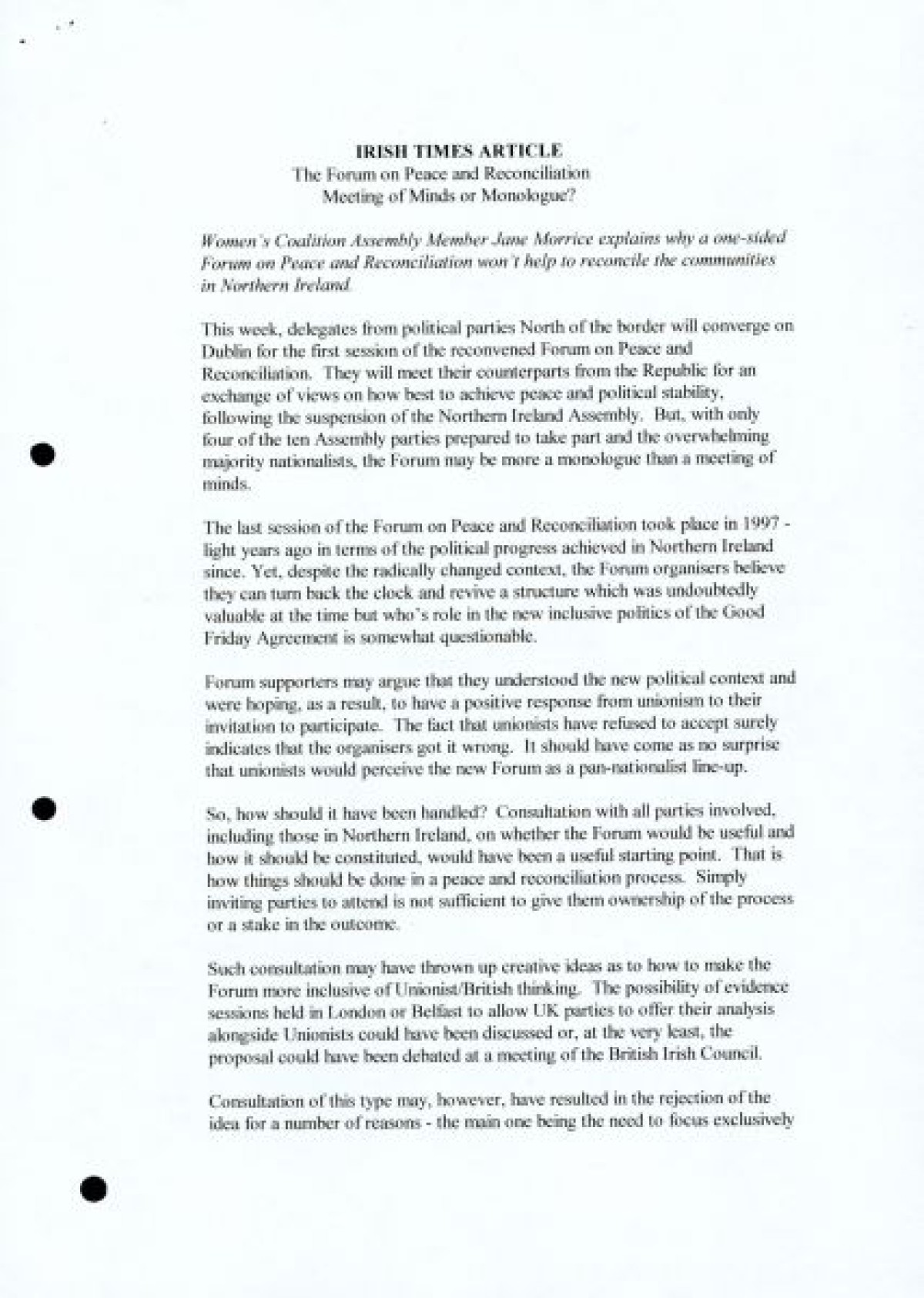 Irish Times titled 'The Forum on Peace and Reconciliation - Meeting of Minds of Monologue?' The article expresses the importance of multi-party attendance and participation at the 'Forum on Peace and Reconciliation' in Dublin to promote inclusivity and dialogue as part of the ongoing peace process in Northern Ireland.