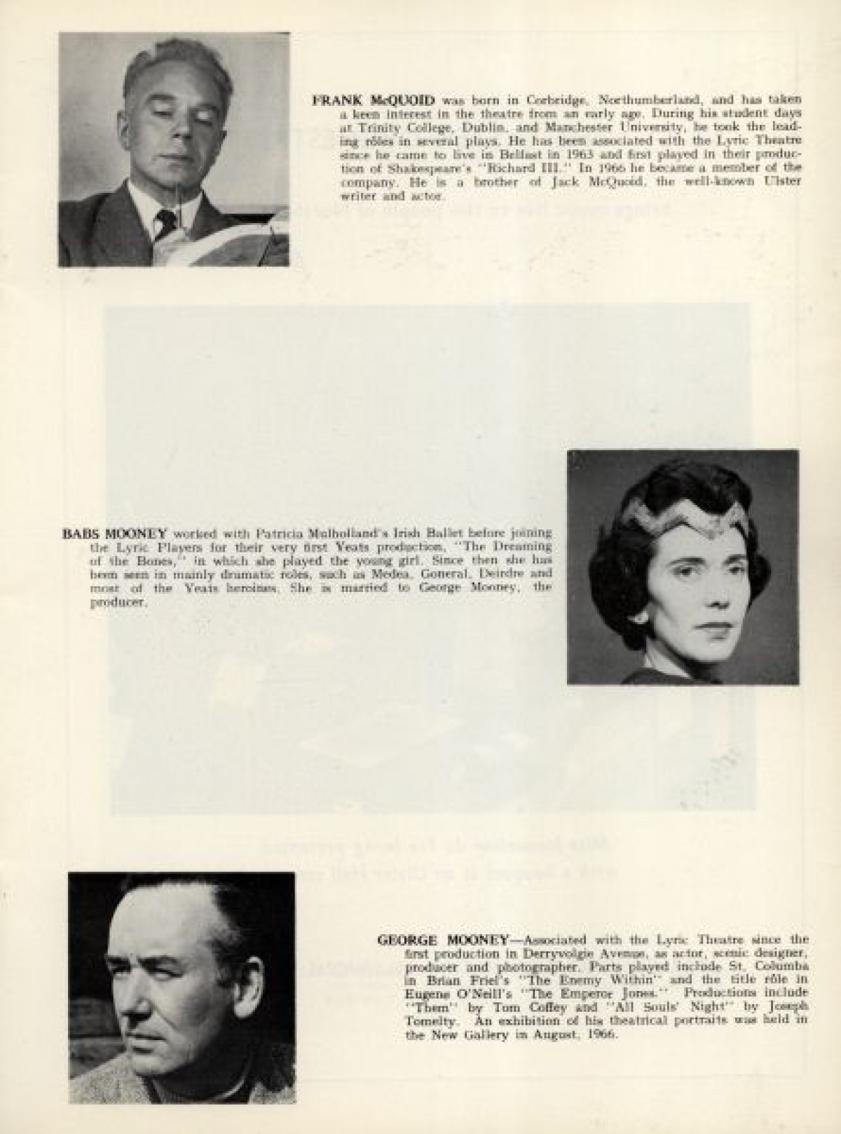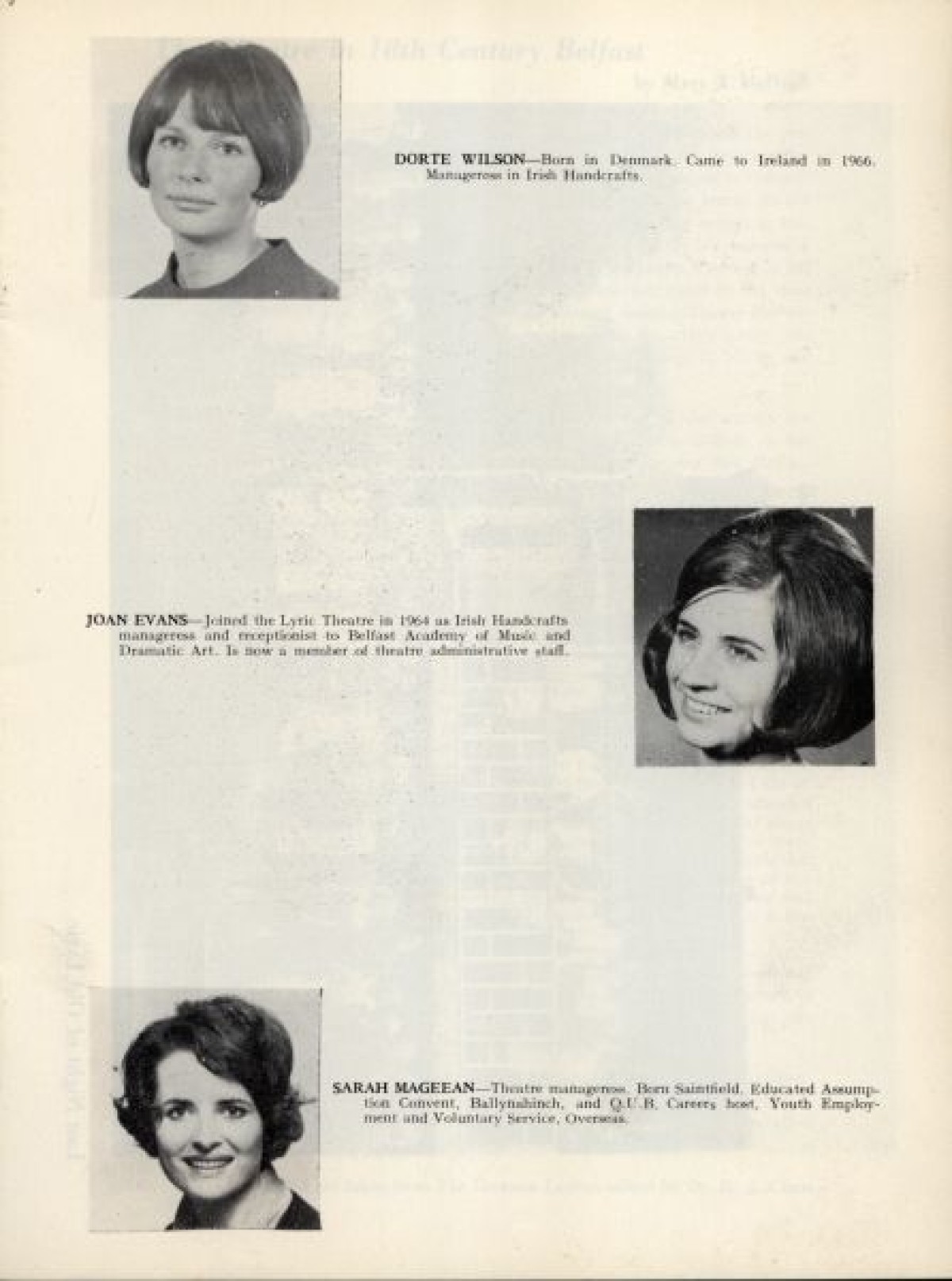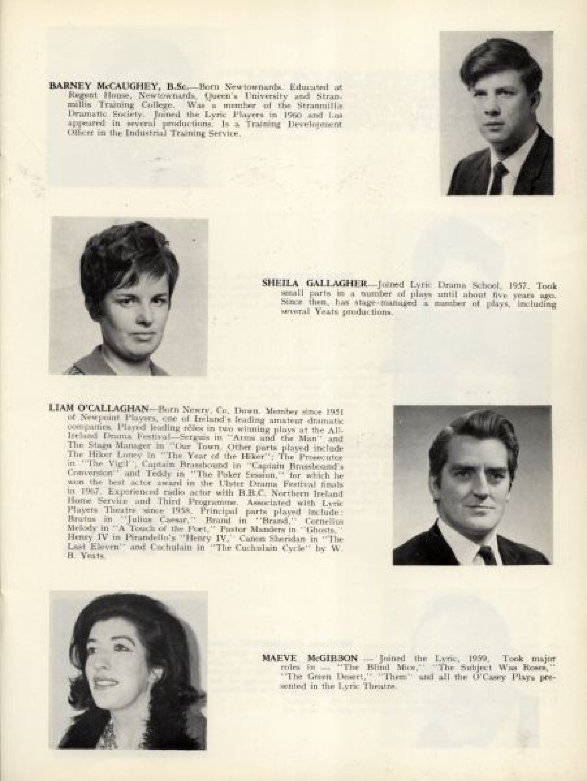 Profiles with thumbnail photographs of the Lyric Players, outlining their background and theatre productions. Includes, among others: Sandra Fusco, Joan Rolston, Helen Lewis, Joan Macready, Brigit Kirkpatrick, Sheila Gallagher, Maeve McGibbon, Bernadette Keenan, Babs Mooney, Dorte Wilson, Joan Evans, and Sarah Mageean. Published in: Lyric Theatre, 1951-1968.