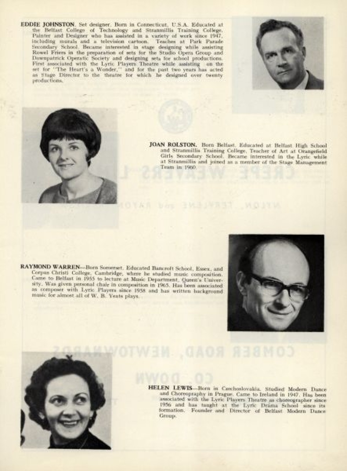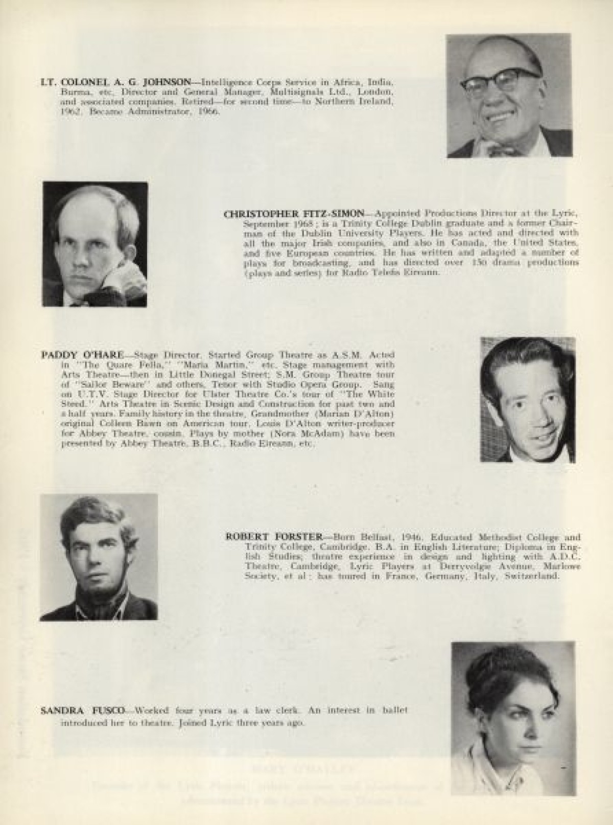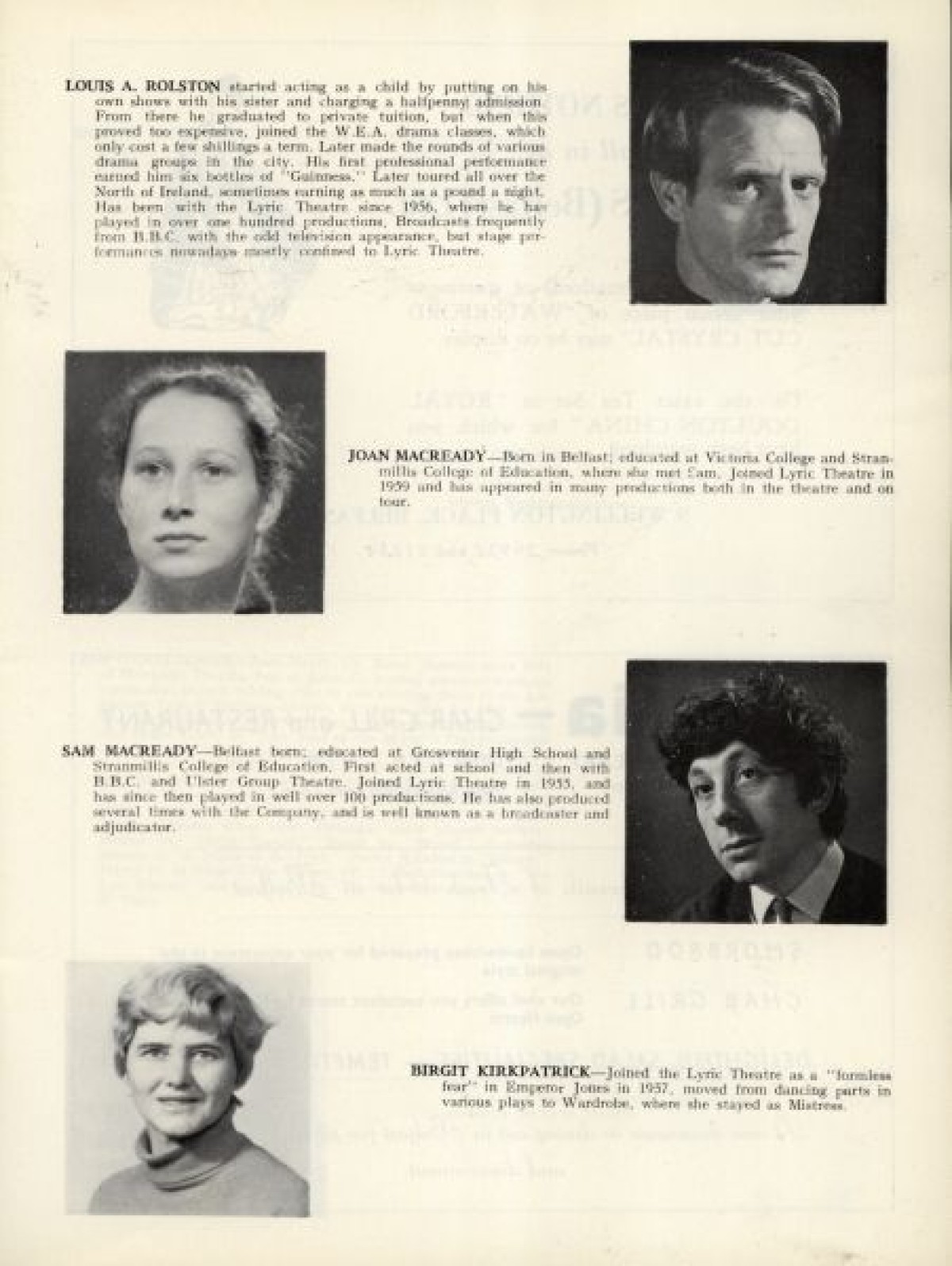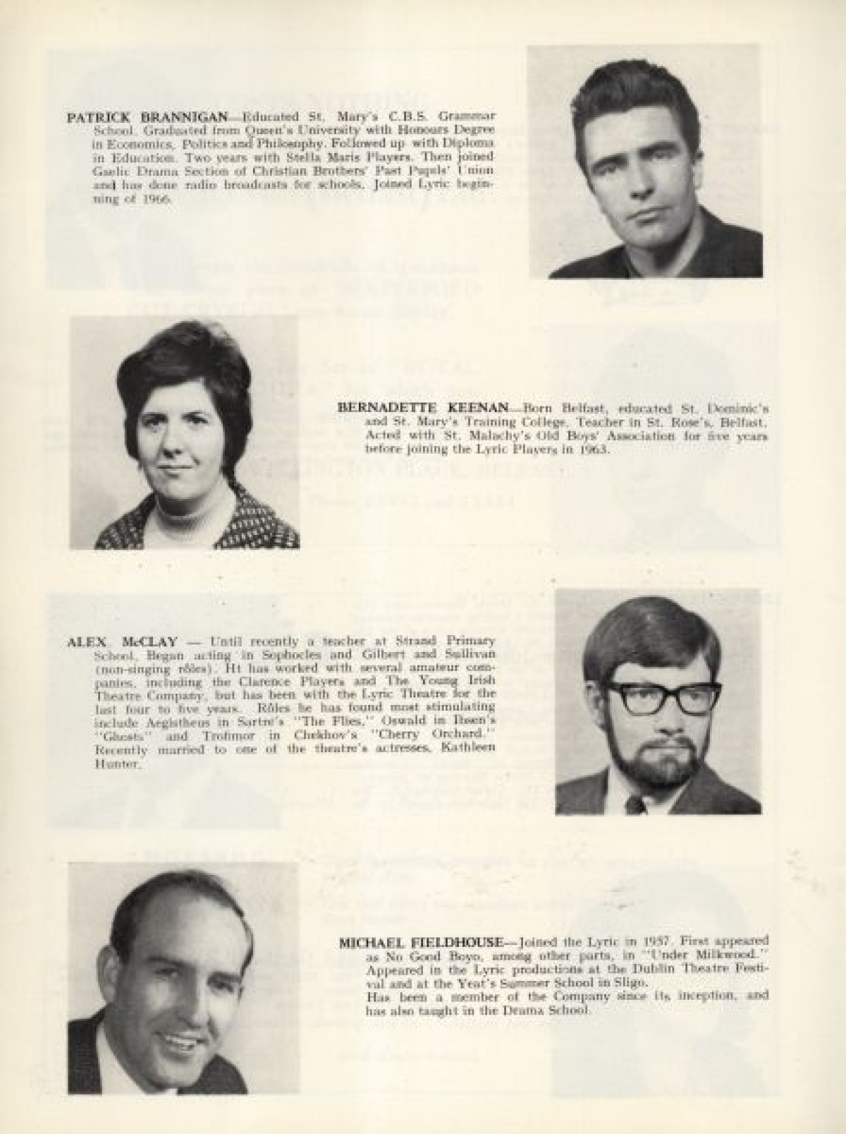 Profiles with thumbnail photographs of the Lyric Players, outlining their background and theatre productions. Includes, among others: Sandra Fusco, Joan Rolston, Helen Lewis, Joan Macready, Brigit Kirkpatrick, Sheila Gallagher, Maeve McGibbon, Bernadette Keenan, Babs Mooney, Dorte Wilson, Joan Evans, and Sarah Mageean. Published in: Lyric Theatre, 1951-1968.