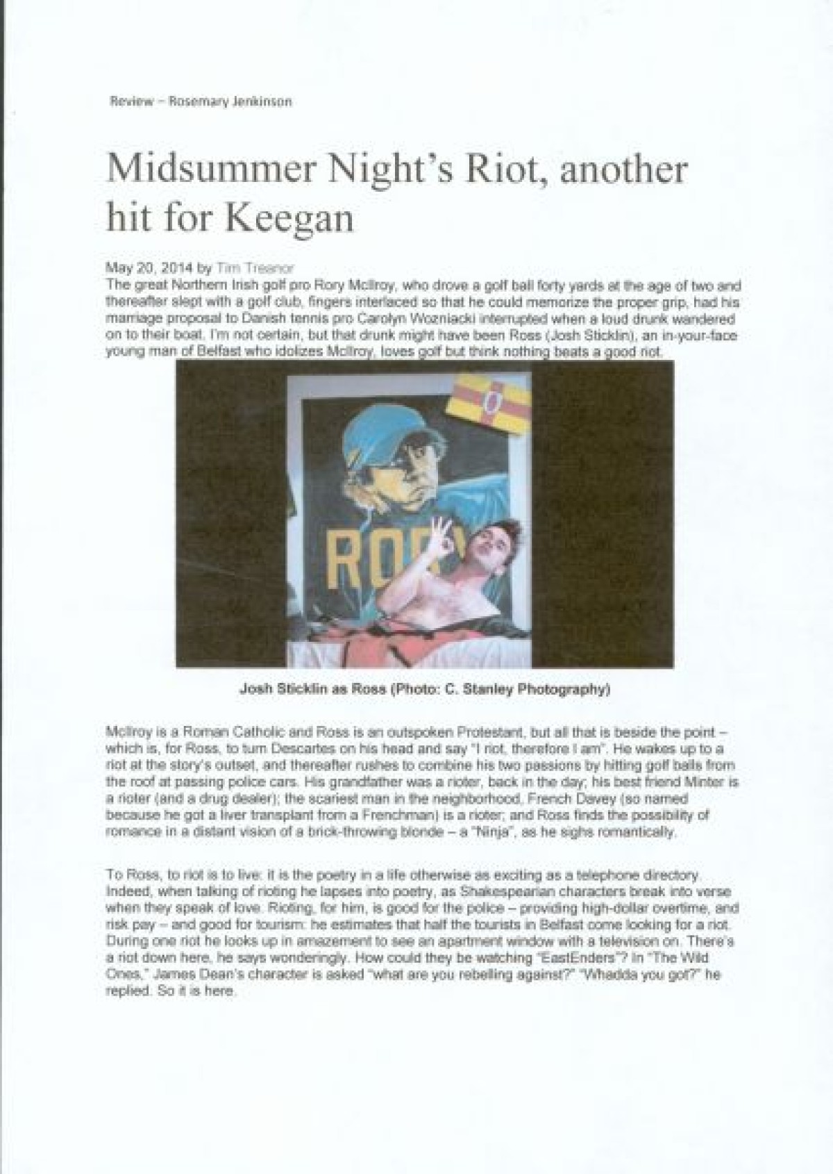DC Theatre Scene online newspaper review of "Midsummer Night's Riot" a play by Rosemary Jenkinson and produced by the Keegan Theatre. Includes a promotional photograph of Josh Sticklin as character Ross. Review written by Tom Treanor.