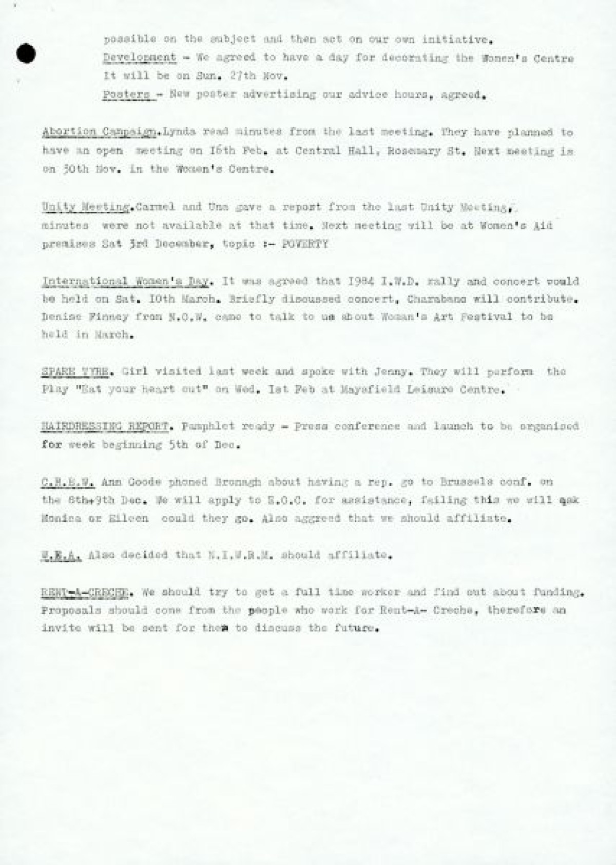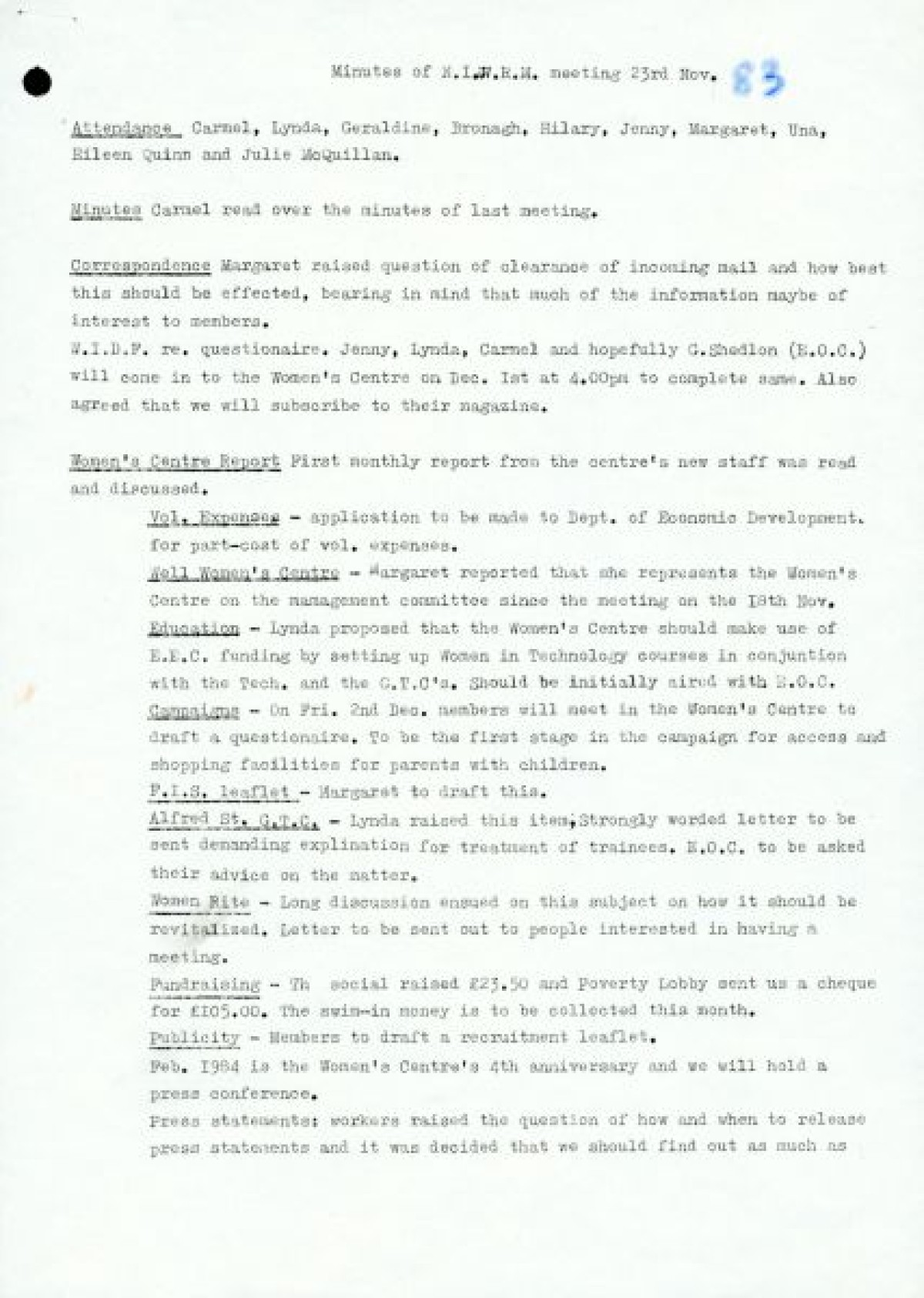 Minutes of the Northern Ireland Women's Rights Movement meeting on the 23rd November, 1983. Features updates on multiple issues such as childcare, abortion and International Women's Day.