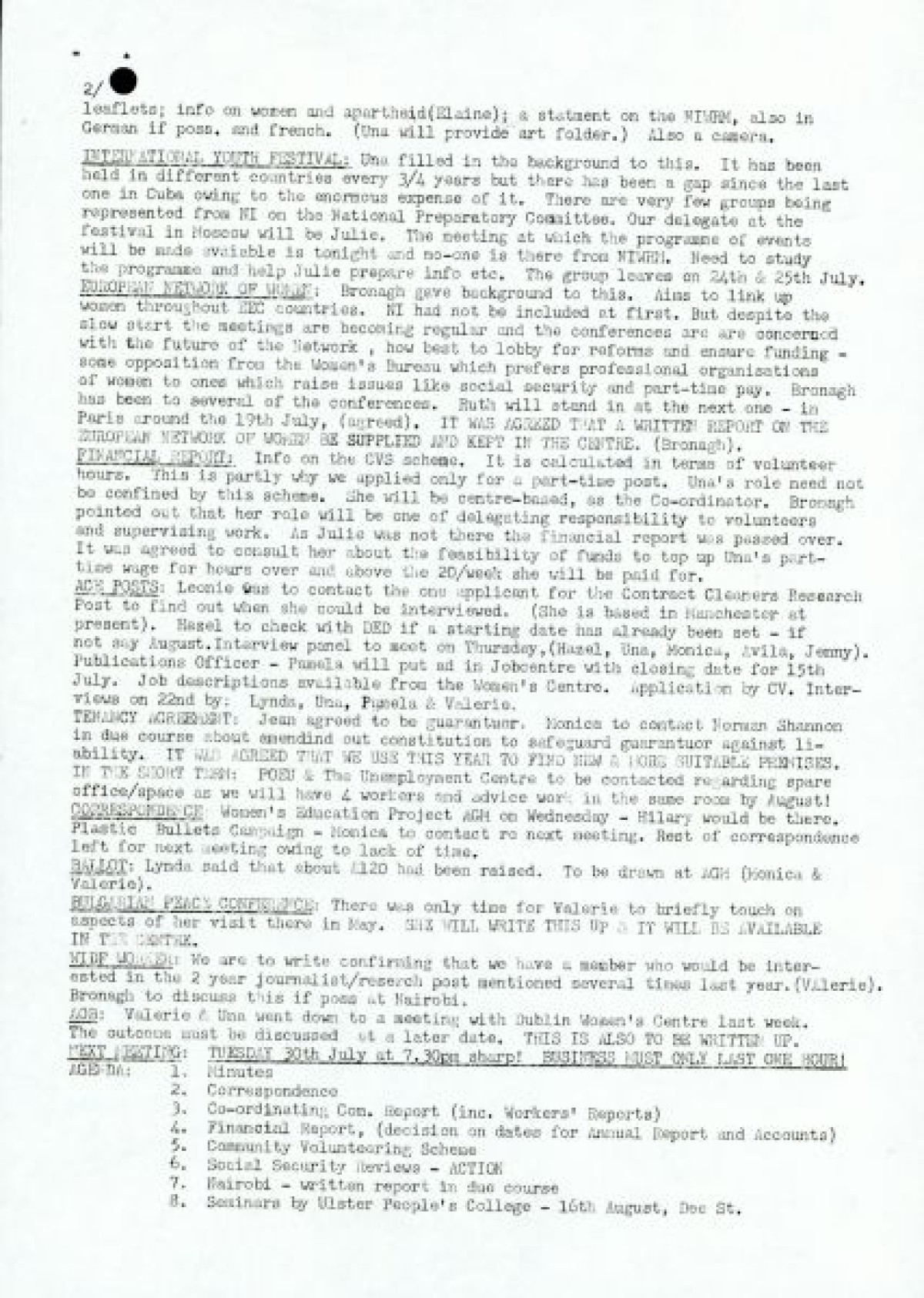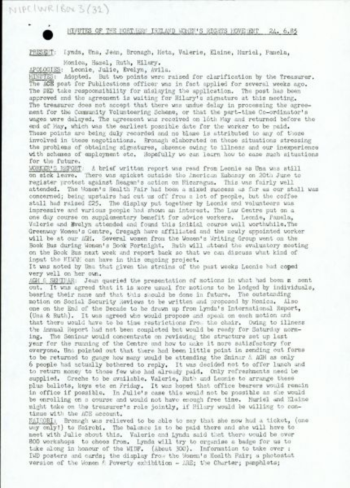 th June, 1985. Includes a discussion of international events in Nairobi, the AGM, a Worker's Report, International Youth Festival, European Network of Women, Financial Report and the Bulgarian Peace Conference.