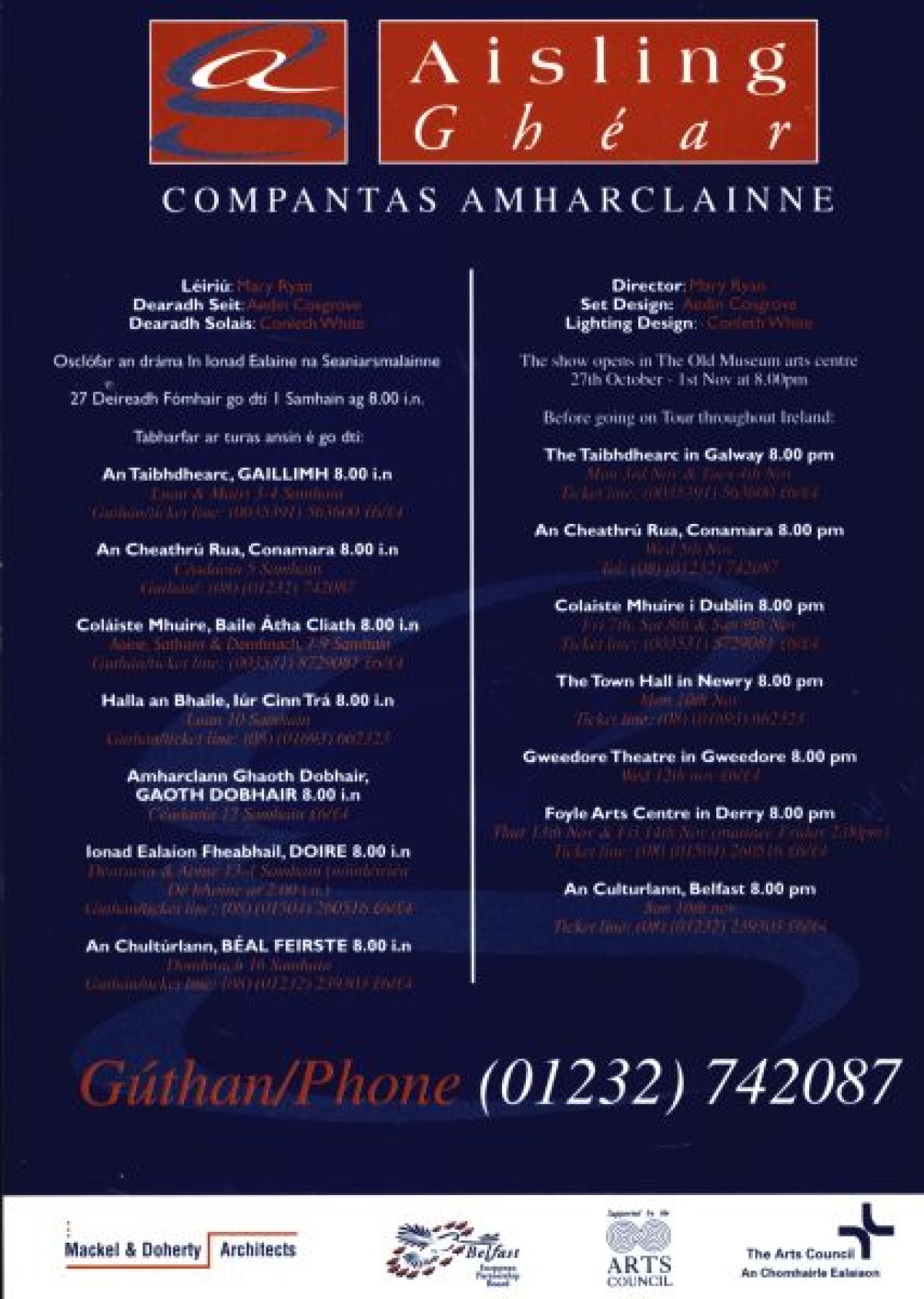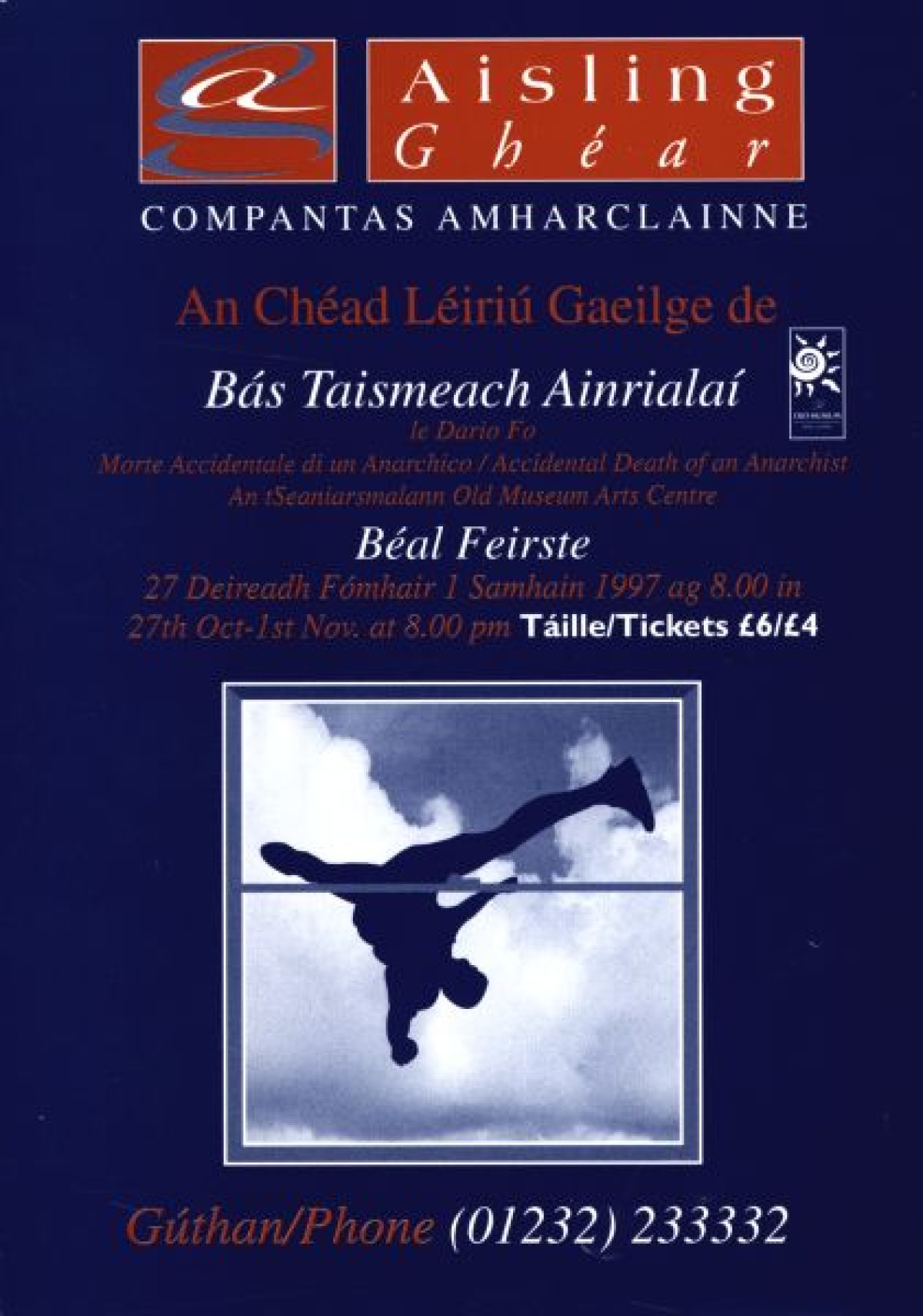A leaflet advertising a 1997 Irish version of the Dario Fo play, the 'Accidental Death of an Anarchist' ('Morte Accidentale di un Anarchico'). The play was directed by Mary Ryan and performed throughout Ireland on behalf of Aisling Ghéar Compántas Amharclainne (Irish Language Theatre Company).