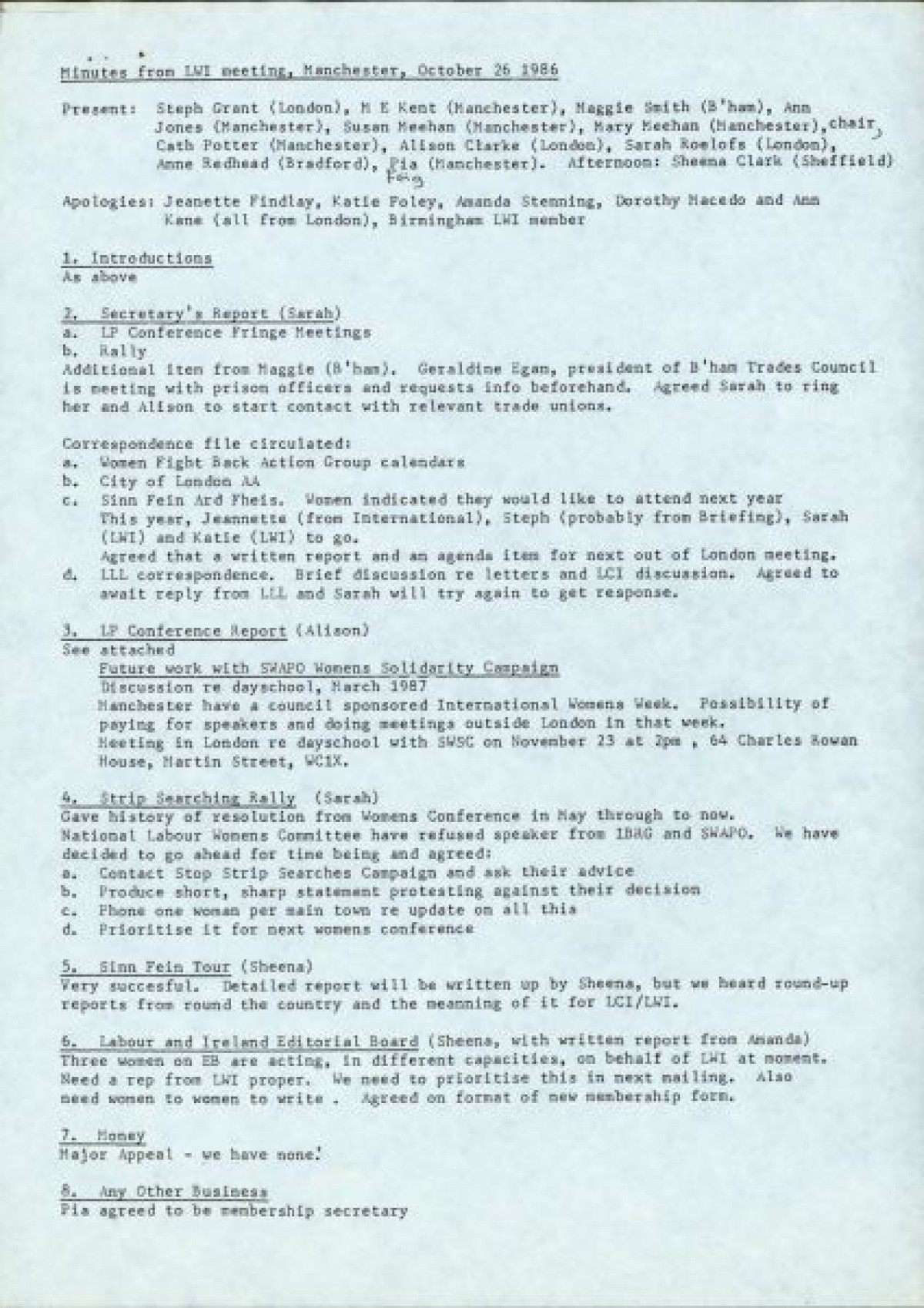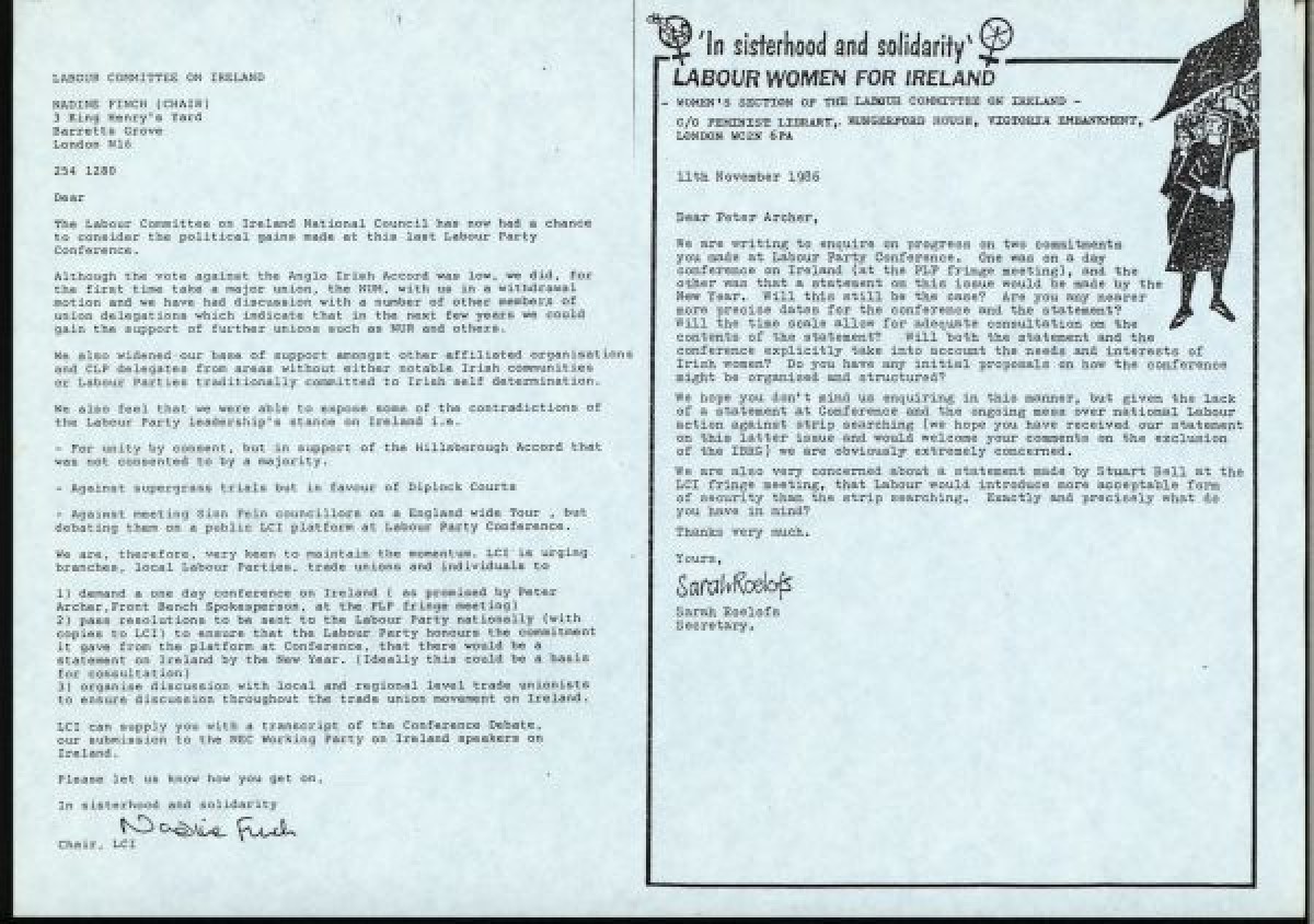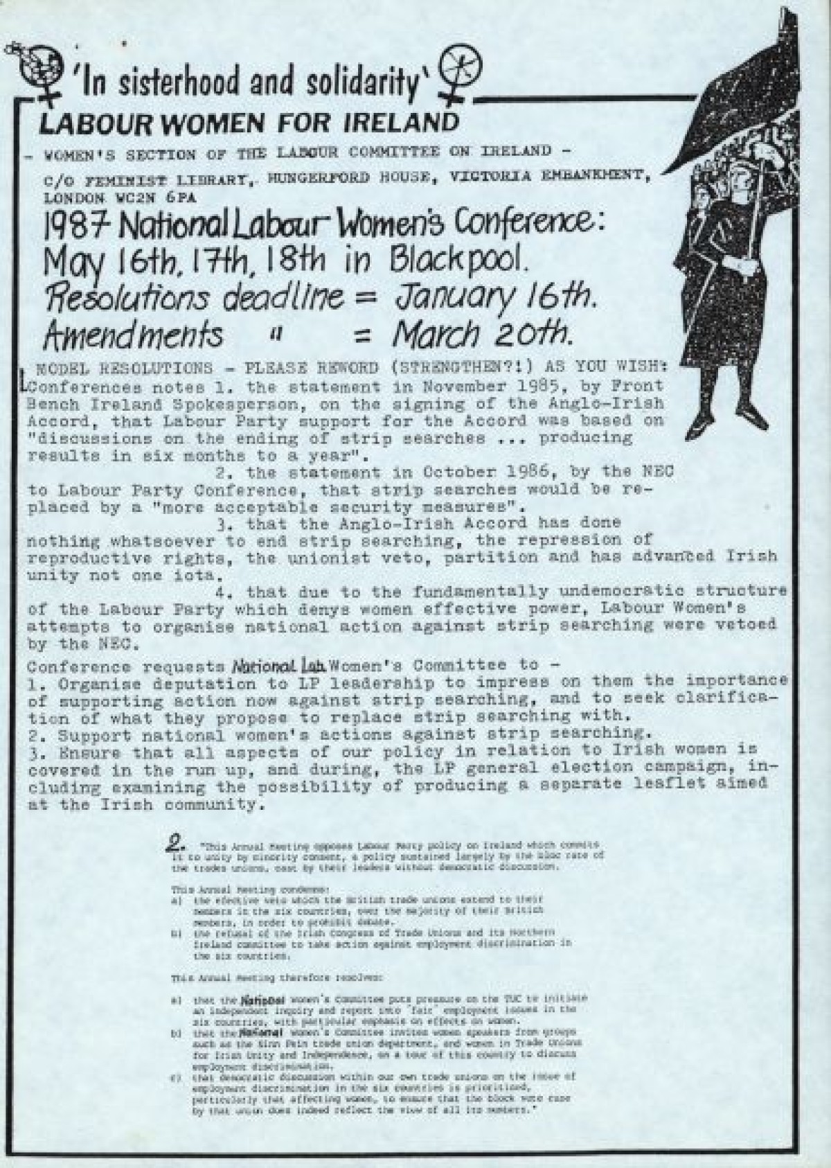 Labour Women for Ireland (LWI). Discusses model resolutions from the National Labour Women's Conference, held in Blackpool 1987. Includes reproductions of letters concerning strip-searching and Anglo-Irish Accord, Minutes from a LWI meeting in Manchester, and notes on a