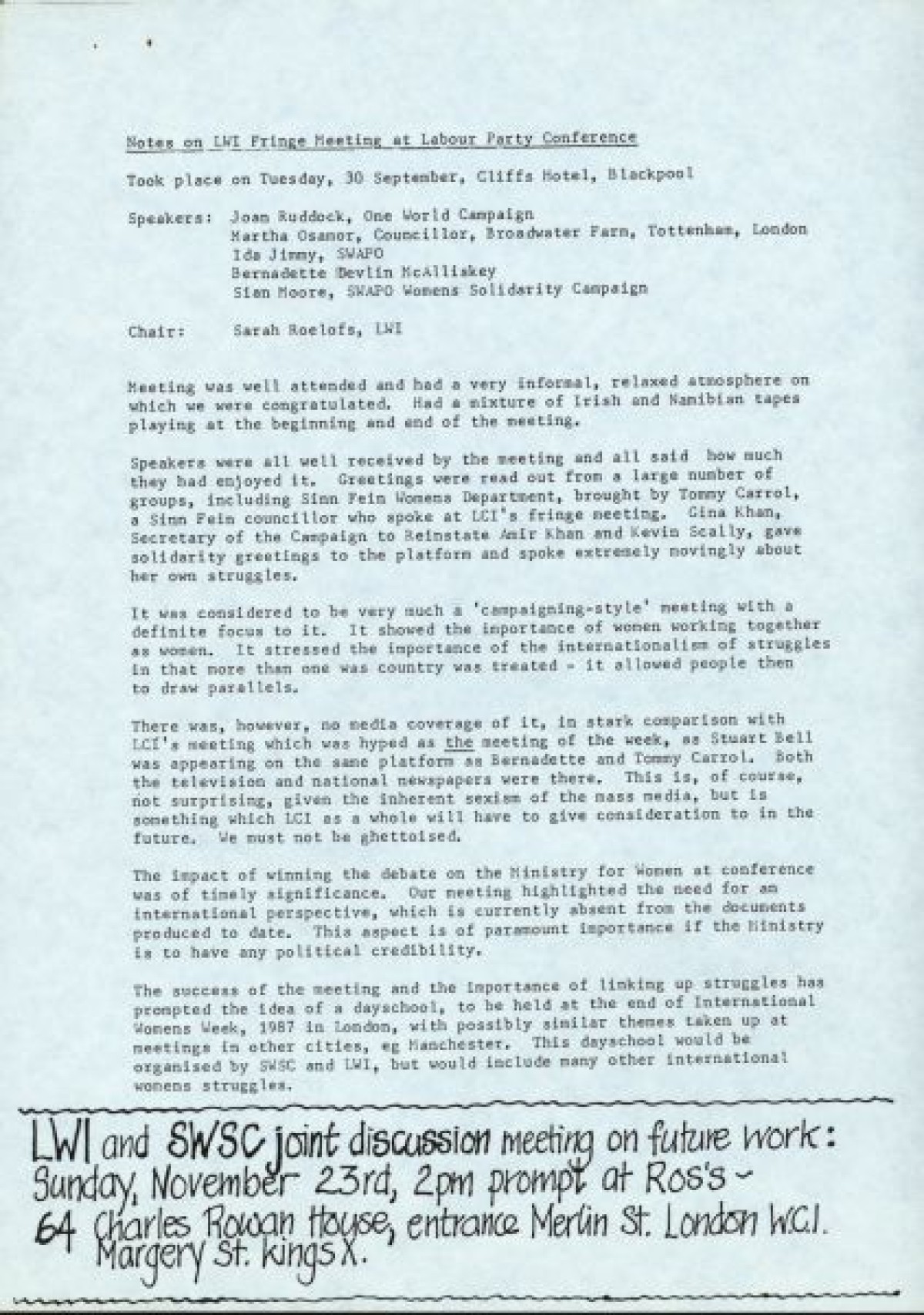 Labour Women for Ireland fringe meeting, chaired by Sarah Roelofs, with speakers Joan Ruddock (One World Campaign), Martha Osamor, Ida Jimmy and Sian Moore (SWAPO), and Bernadette Devlin McAliskey.