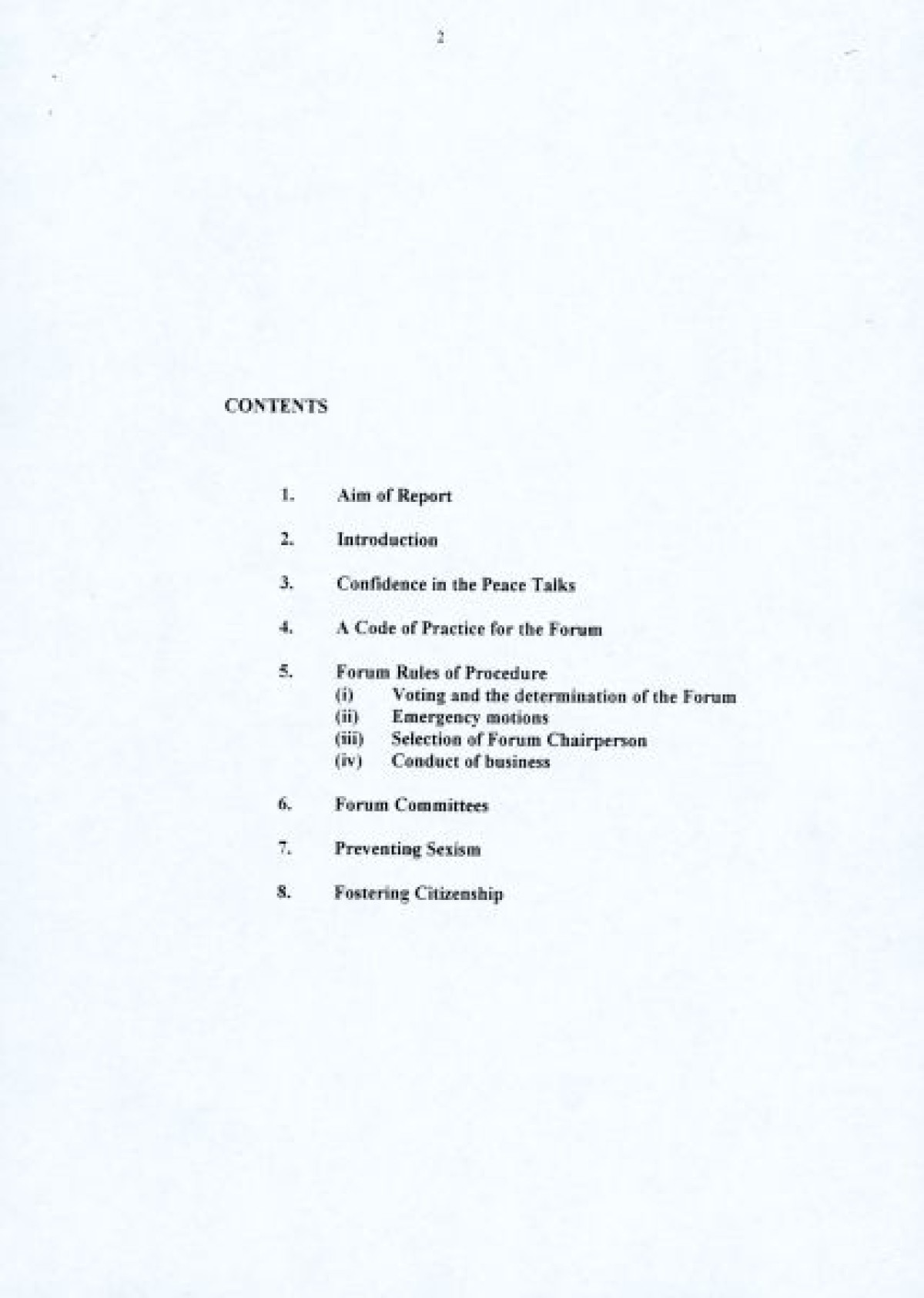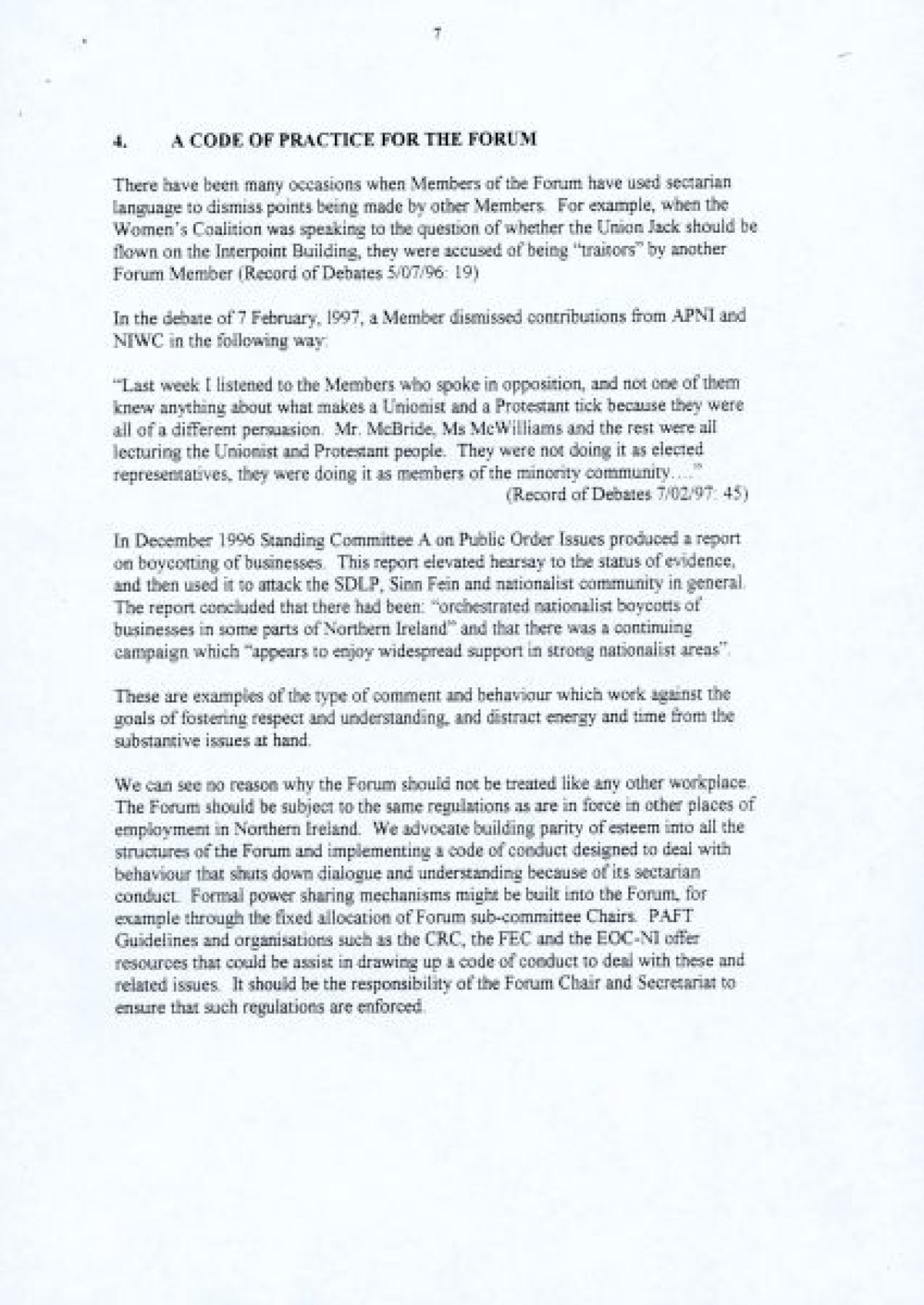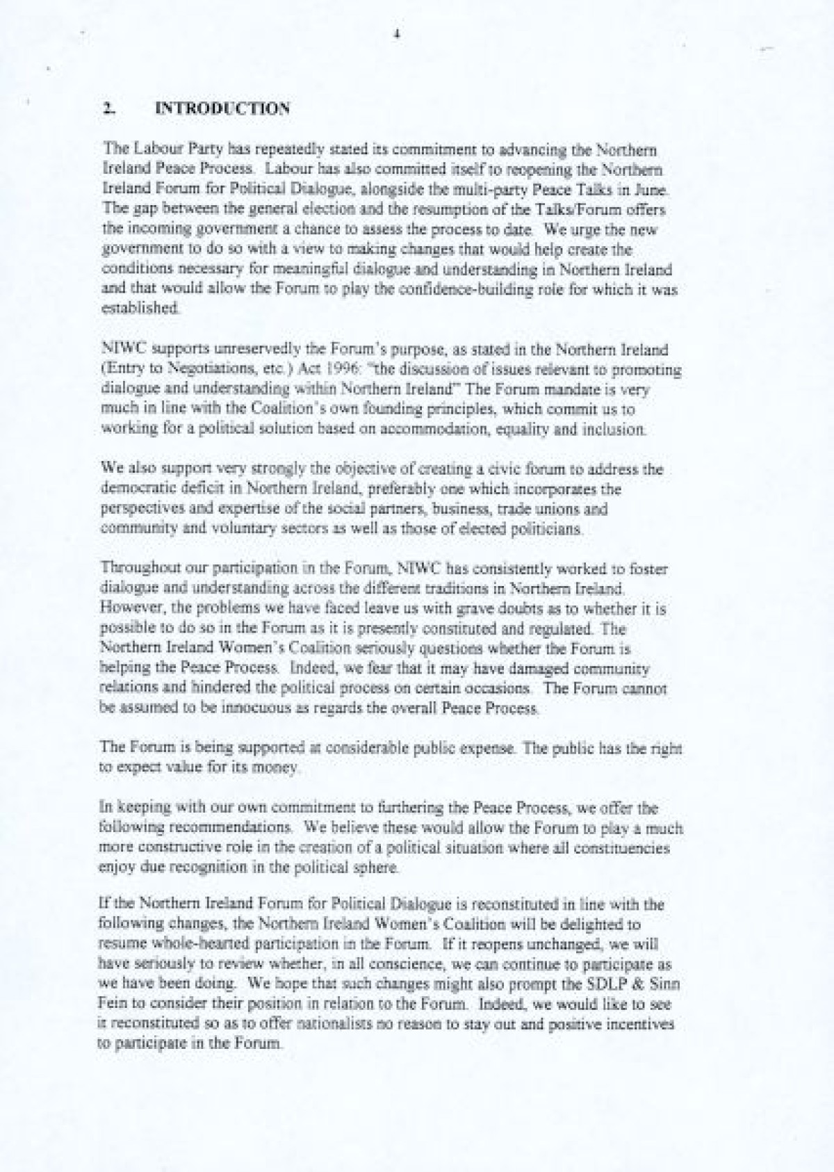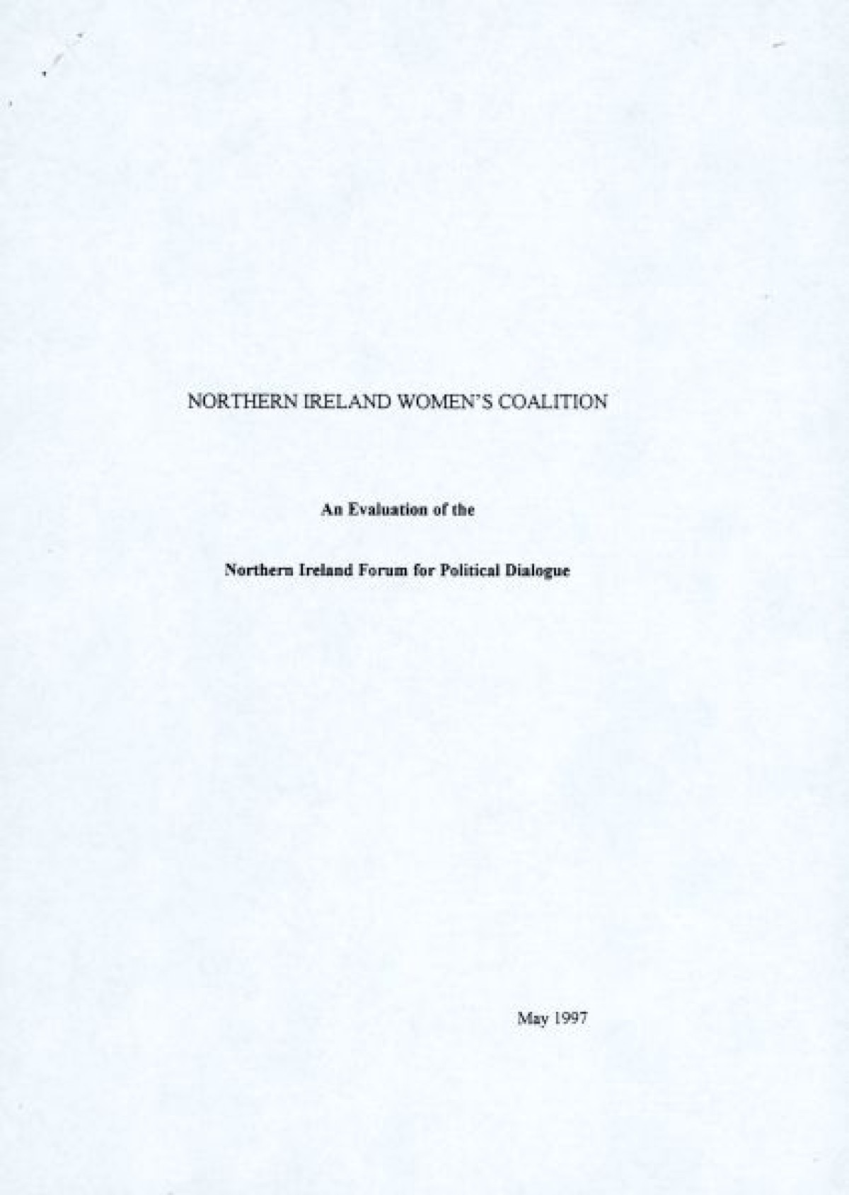 A nine page document published in 1997 by the Northern Ireland Women's Coalition titled 'An Evaluation of the Northern Ireland Forum for Political Dialogue'. The report proposes a number of changes to facilitate the Forum's founding principles, and enable a more constructive role in the peace process by fostering dialogue and understanding.