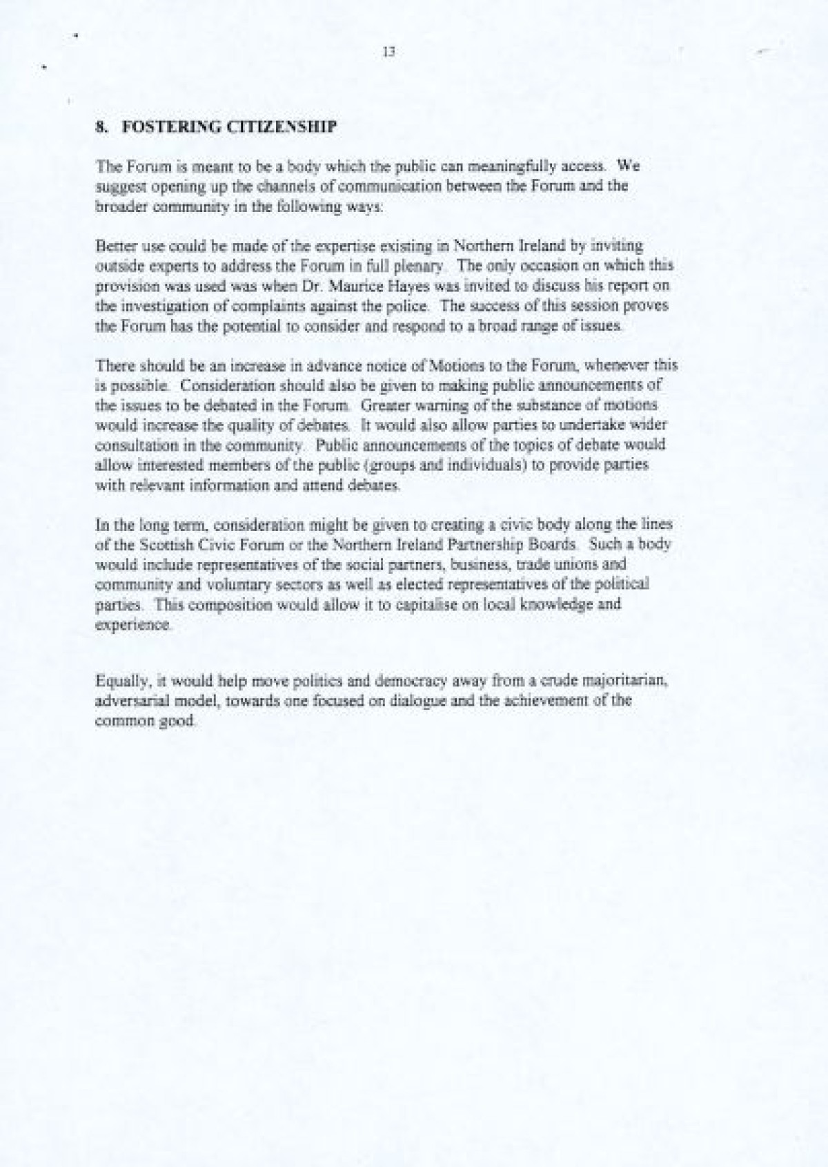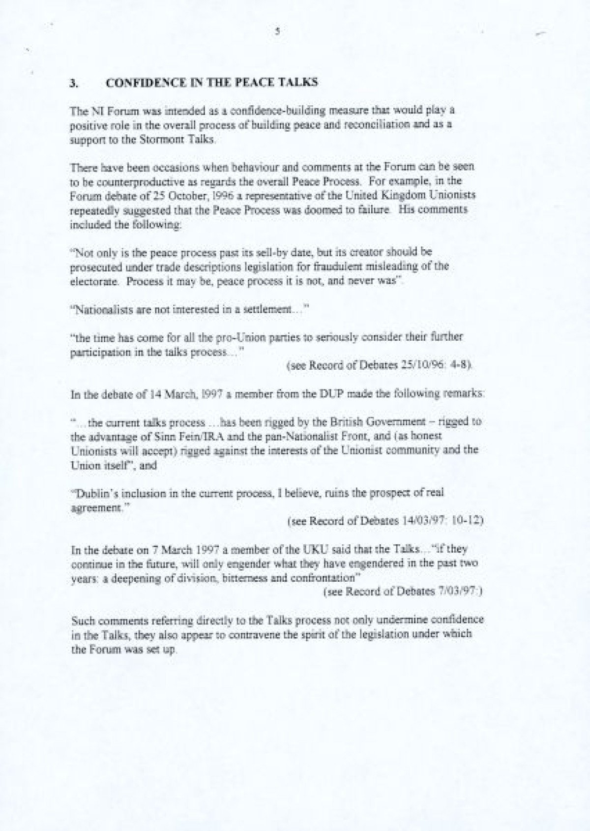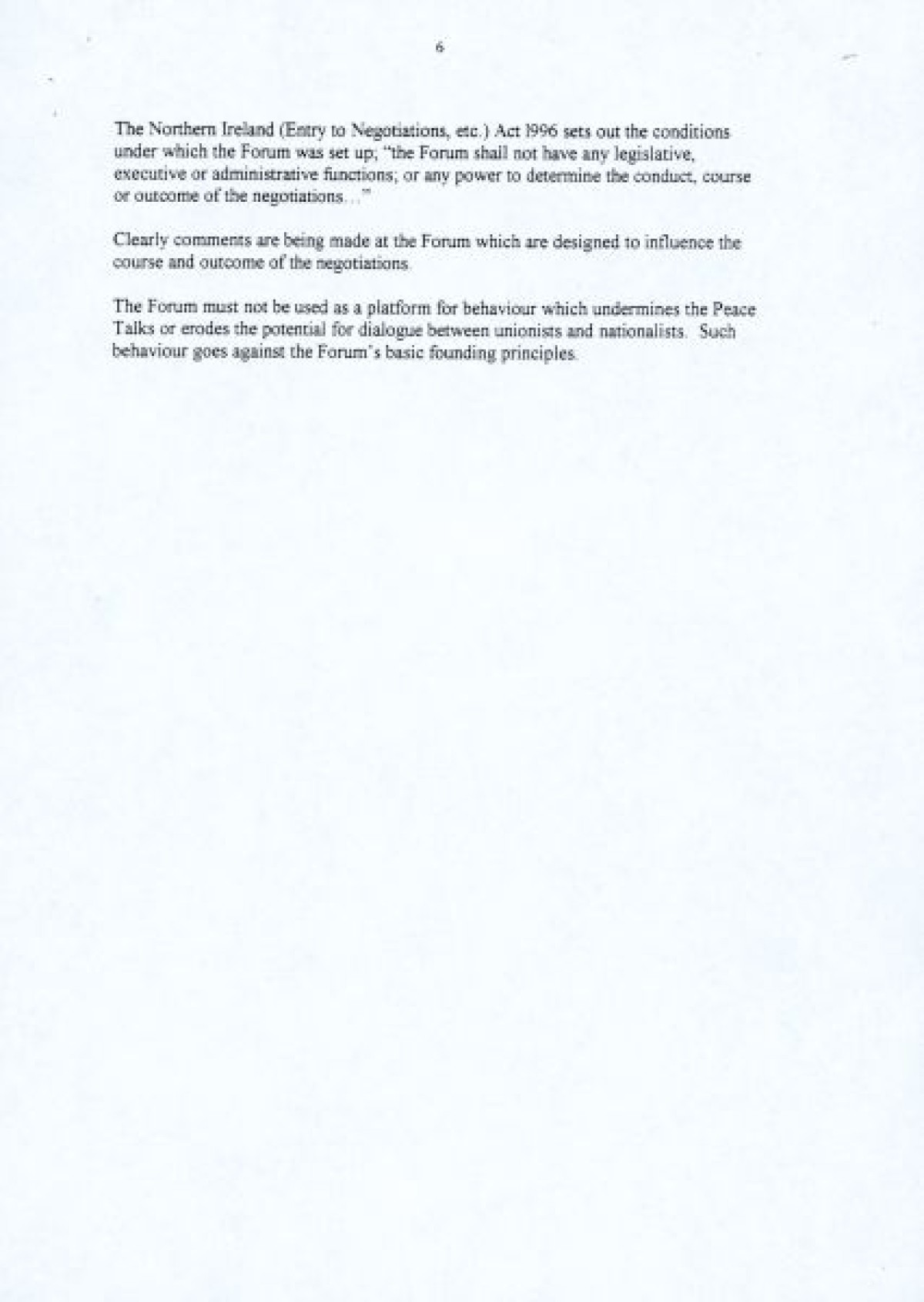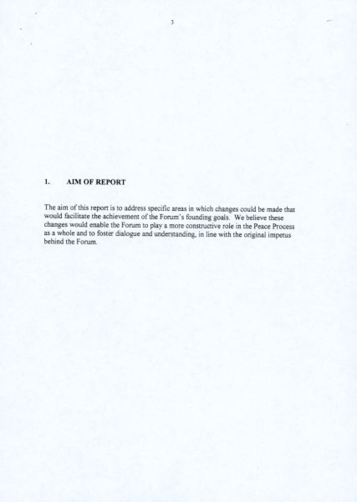 A nine page document published in 1997 by the Northern Ireland Women's Coalition titled 'An Evaluation of the Northern Ireland Forum for Political Dialogue'. The report proposes a number of changes to facilitate the Forum's founding principles, and enable a more constructive role in the peace process by fostering dialogue and understanding.