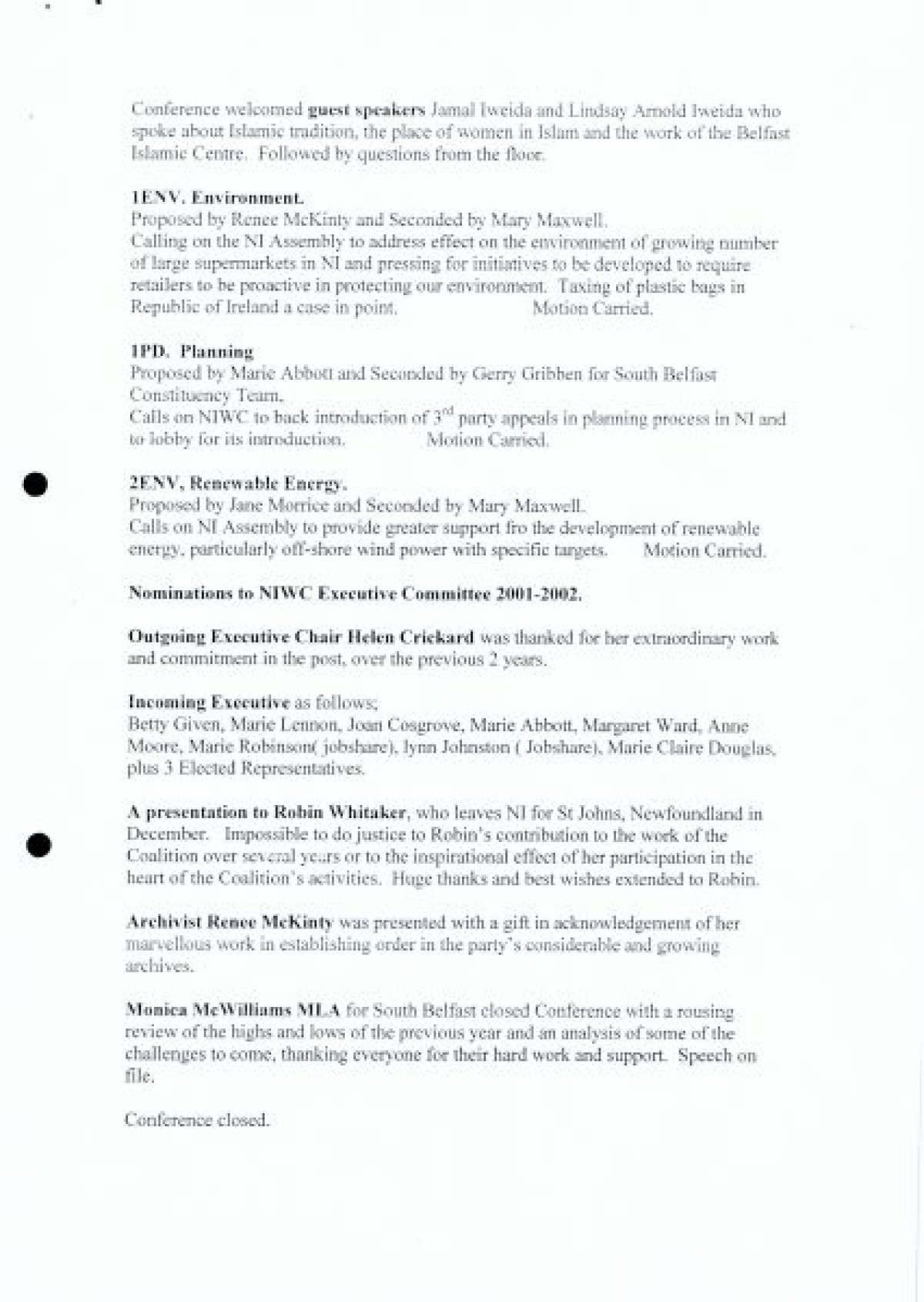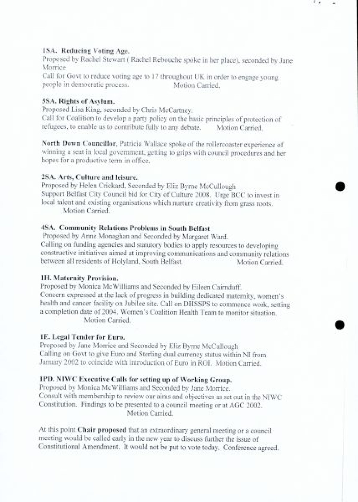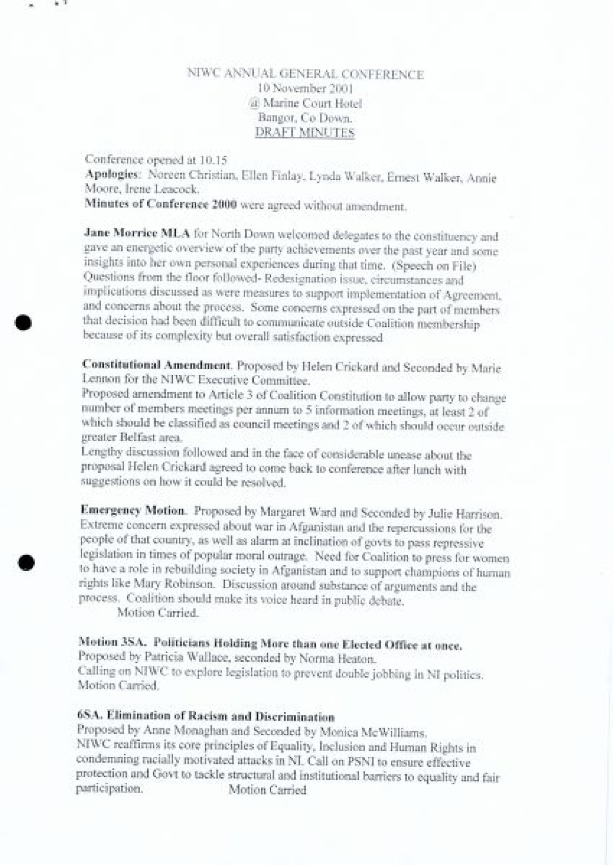 Northern Ireland Women's Coalition Annual General Conference at the Marine Court Hotel, Bangor, Co. Down, 2001. The document includes an emergency motion expressing concern over the war in Afghanistan, and motions relating to the elimination of racism and discrimination, reducing the voting age, rights of asylum and maternity provision.