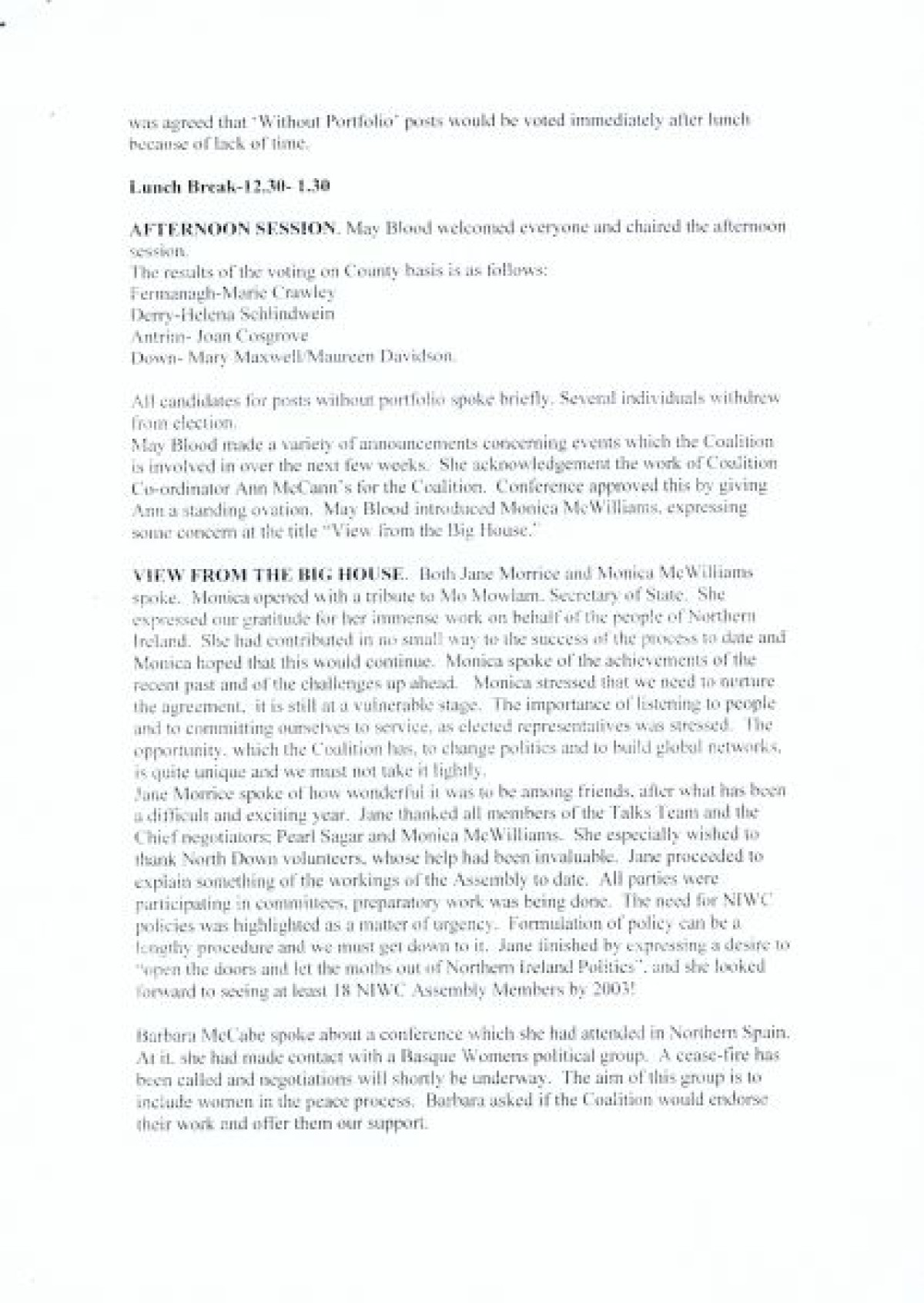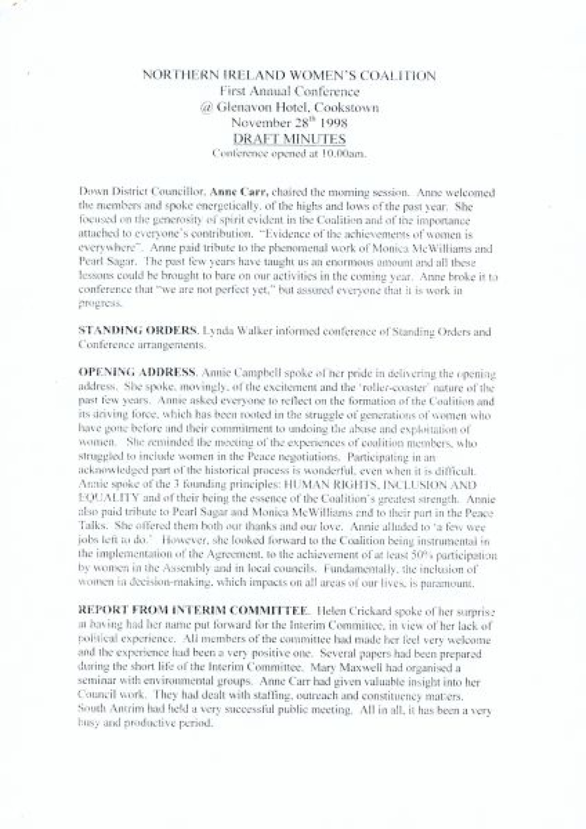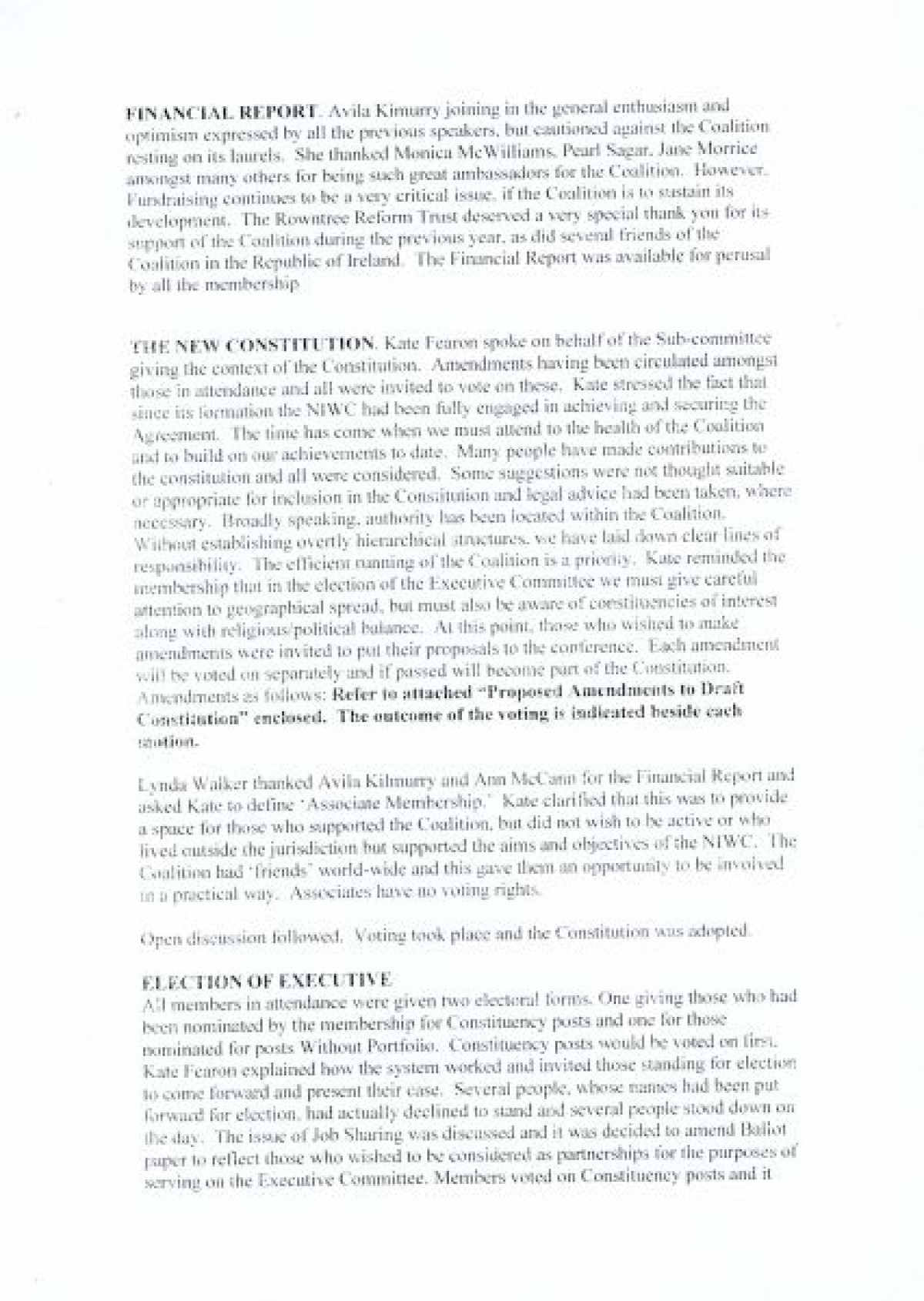 th November, 1998, at the Glenavon Hotel in Cookstown. Contents include a report from the Interim Committee, financial report, new constitution, election of Executive, 'View from the Big House,' and election results.
