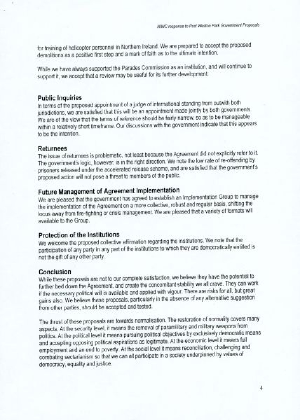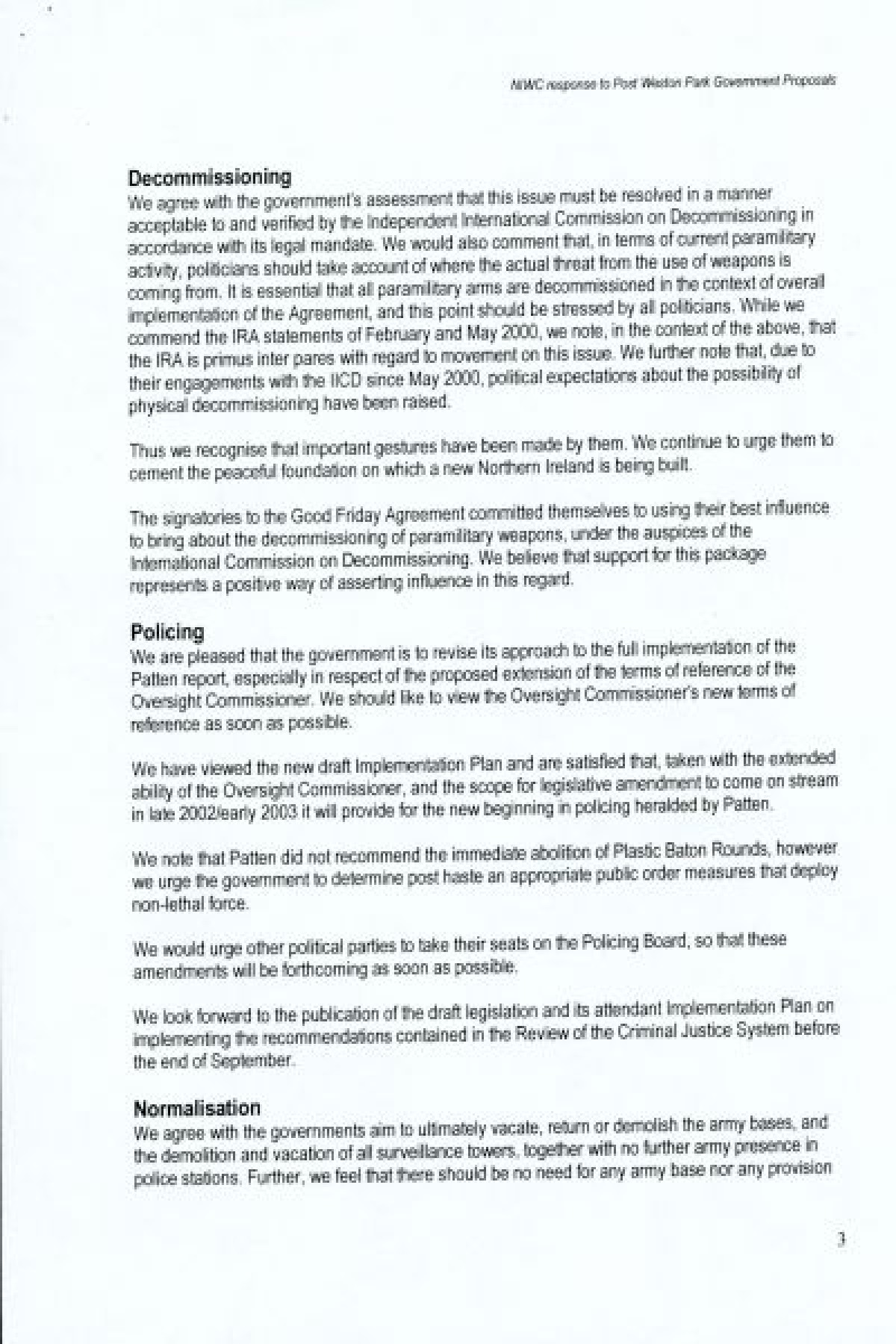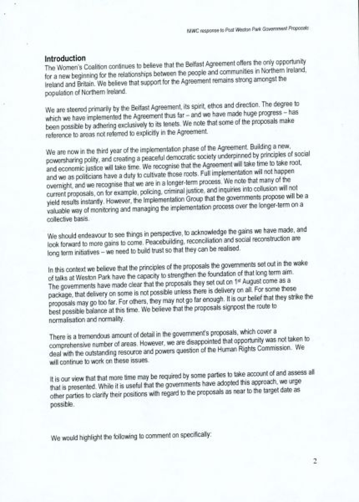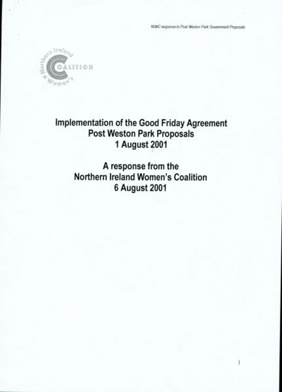 Northern Ireland Women's Coalition response document to proposals published by the government to implement the Good Friday Agreement during talks at Weston Park in August, 2001. Includes commentary and recommendations pertaining to proposals on decommissioning, policing, normalisation, and public inquiries.