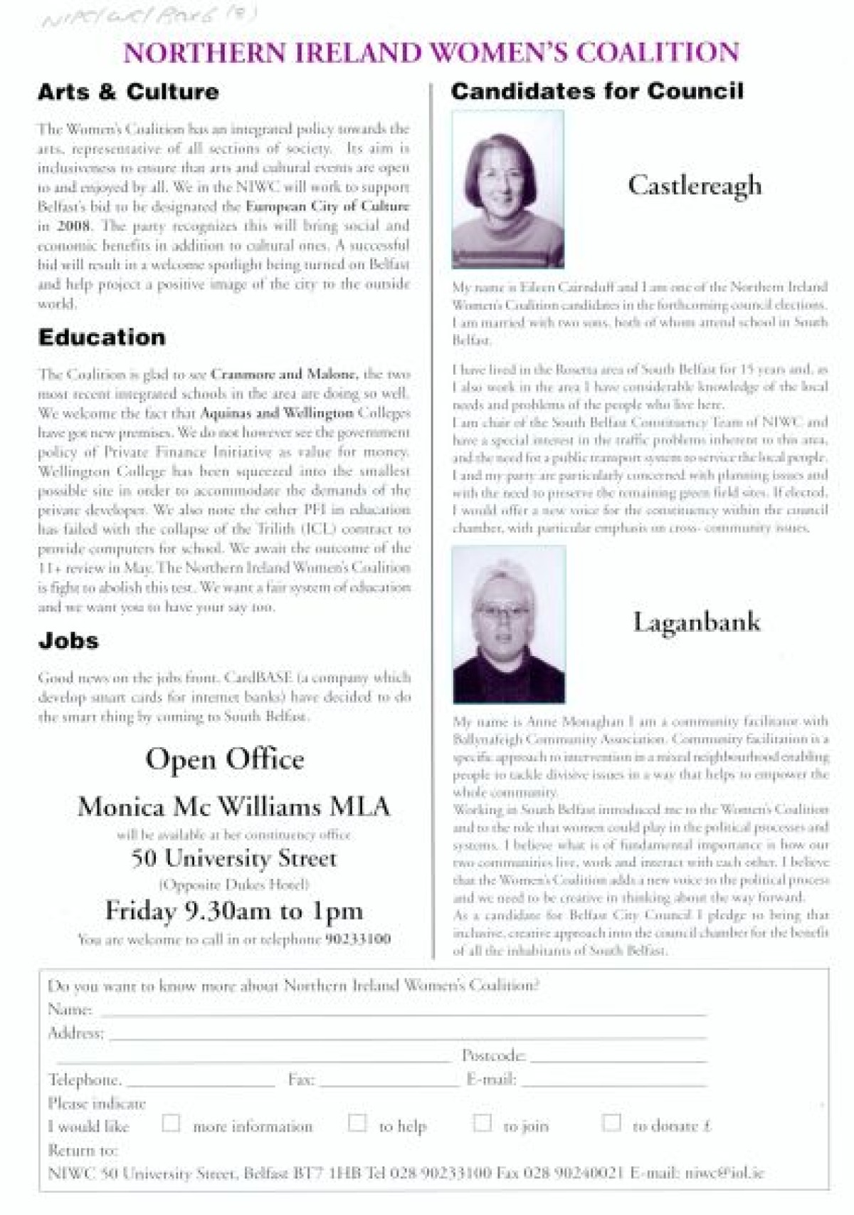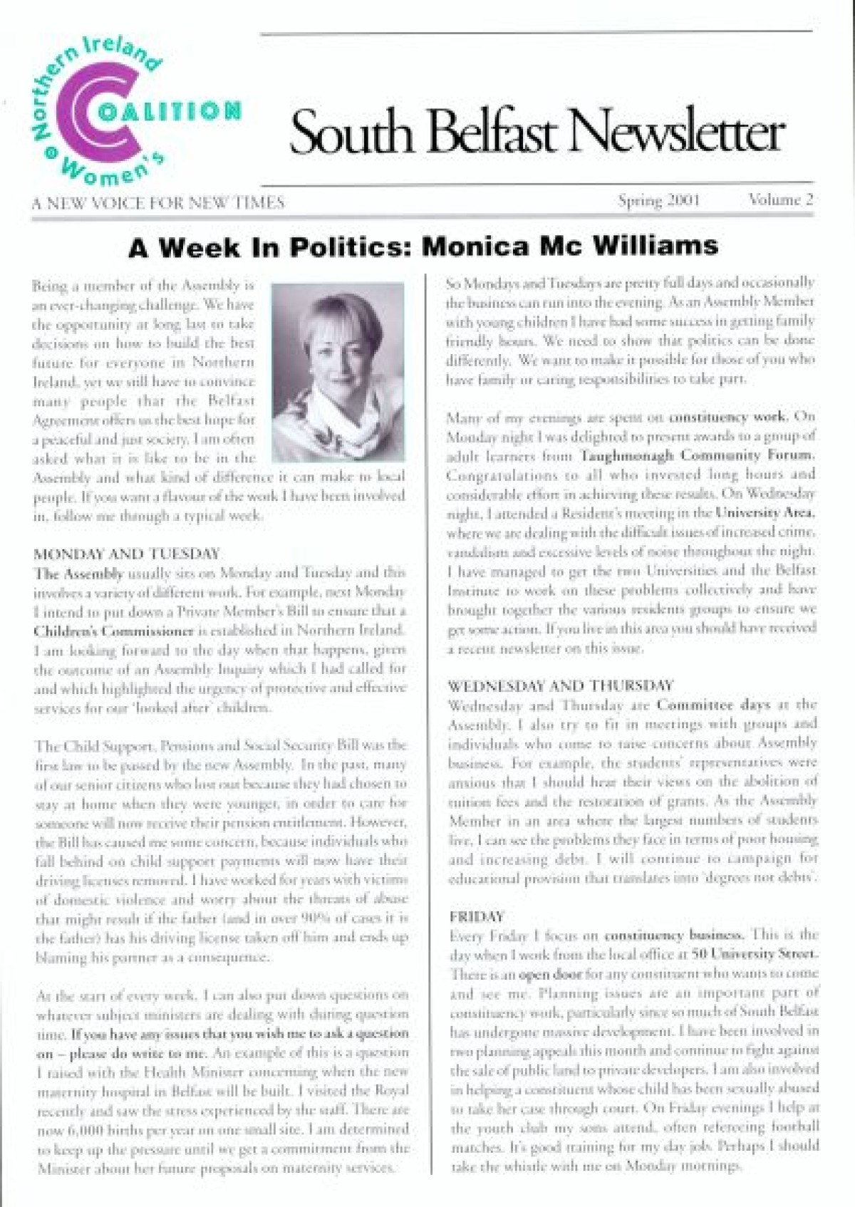 Northern Ireland Women's Coalition South Belfast, Volume 2, Spring 2001. Features an editorial by Monica McWilliams outlining a typical 'week in politics' from Monday to Friday. Also includes candidate profiles for Eileen Cairnduff (Castlereagh), and Anne Monaghan (Laganbank) and sections on Arts & Culture, Education, and Jobs.