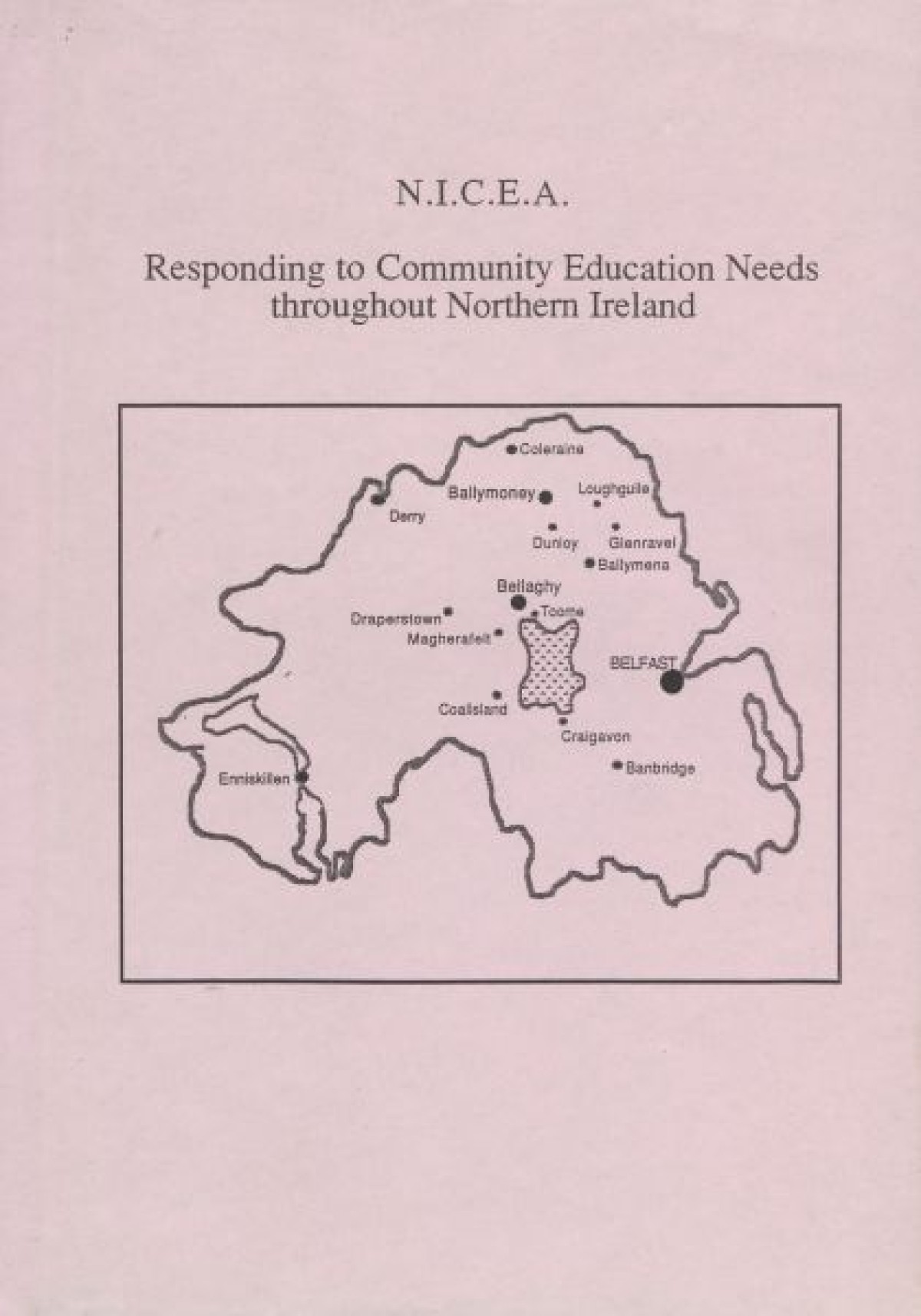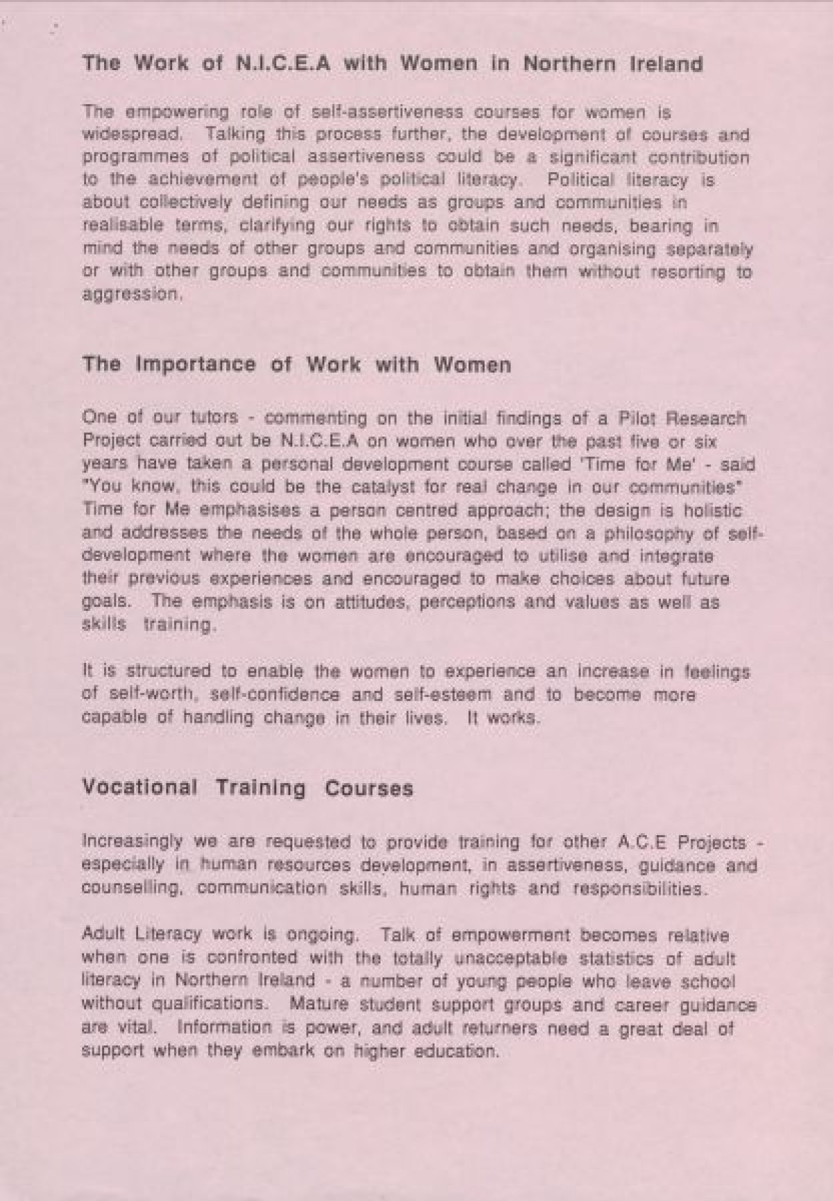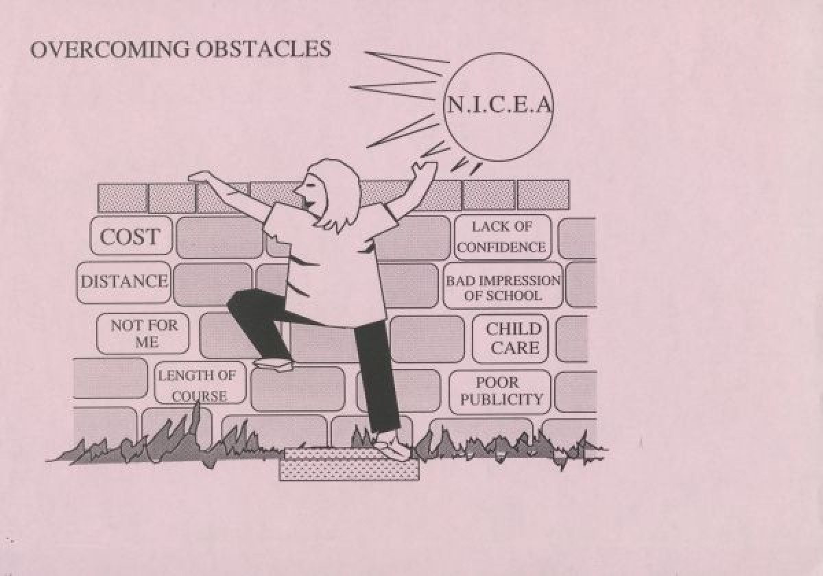 Northern Ireland Community Education Association (NICEA), relating to NICEA activities including an Oral History Project; Outreach Programme; Rural Action Research Project; Work with Women; Vocational Training Courses; and Political Literacy. Contains a digital illustration visualising someone "Overcoming Obstacles."