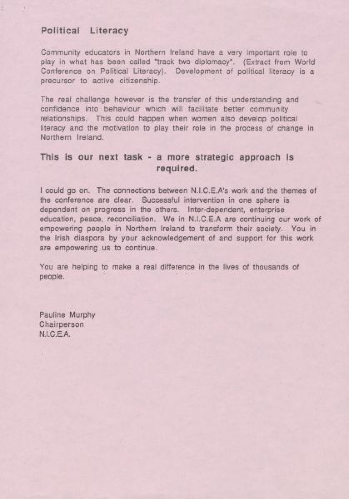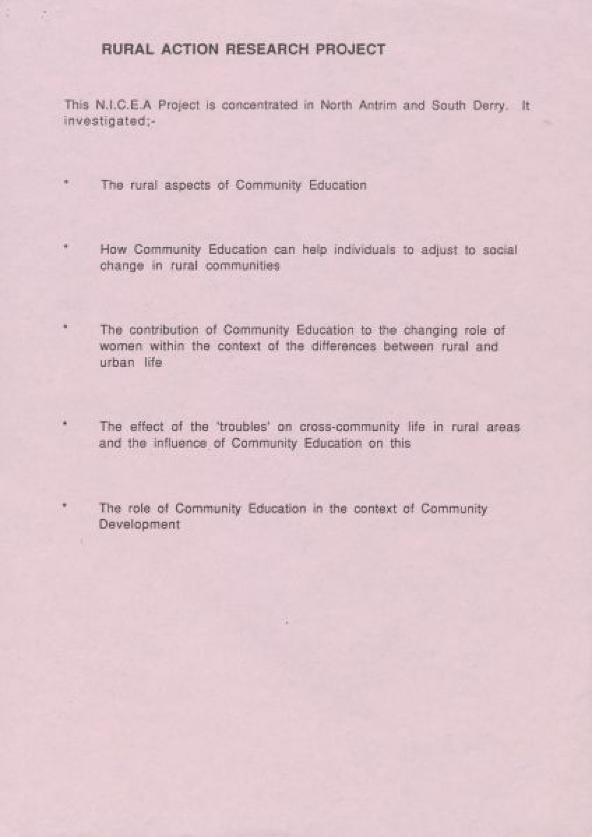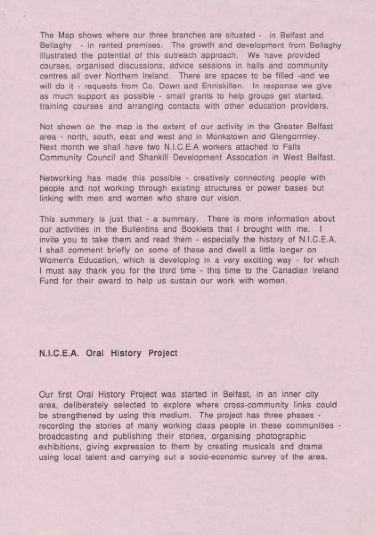 Northern Ireland Community Education Association (NICEA), relating to NICEA activities including an Oral History Project; Outreach Programme; Rural Action Research Project; Work with Women; Vocational Training Courses; and Political Literacy. Contains a digital illustration visualising someone "Overcoming Obstacles."
