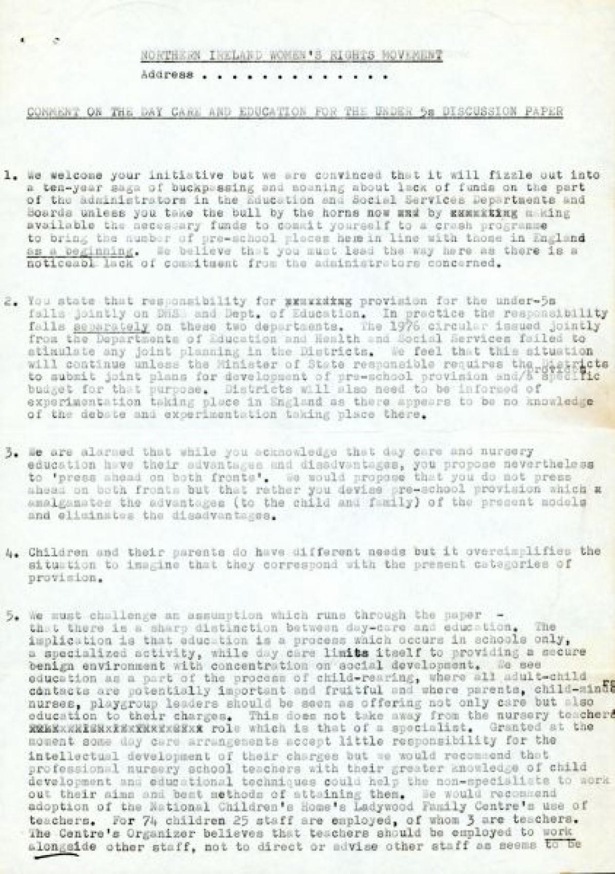 Northern Ireland Women's Rights Movement. Includes recommendations and proposals for change.