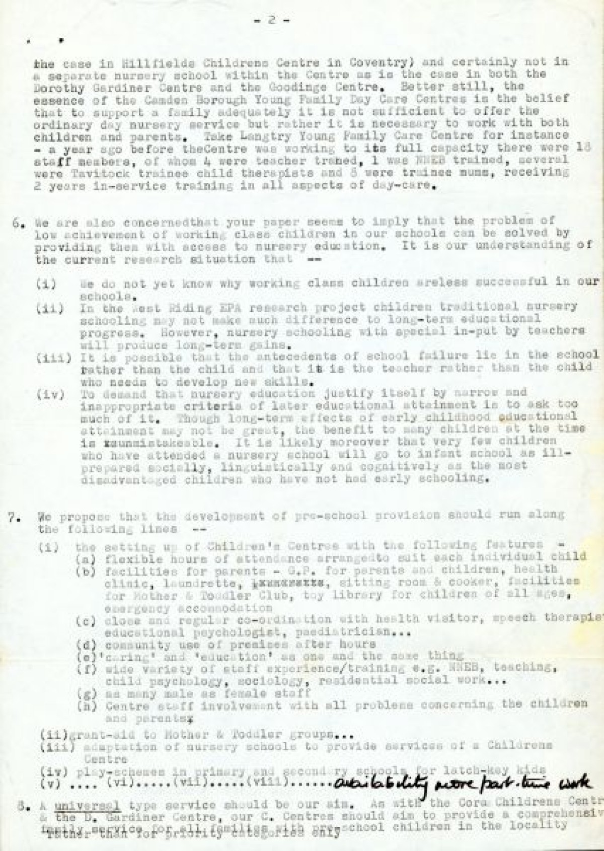 Typed commentary in response to 'The Day Care and Education for the Under 5s Discussion Paper', published by the