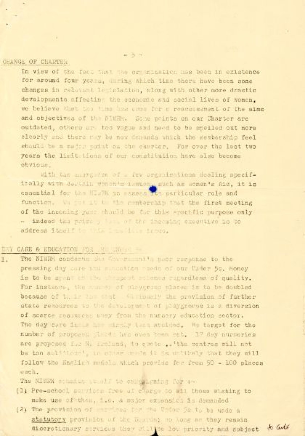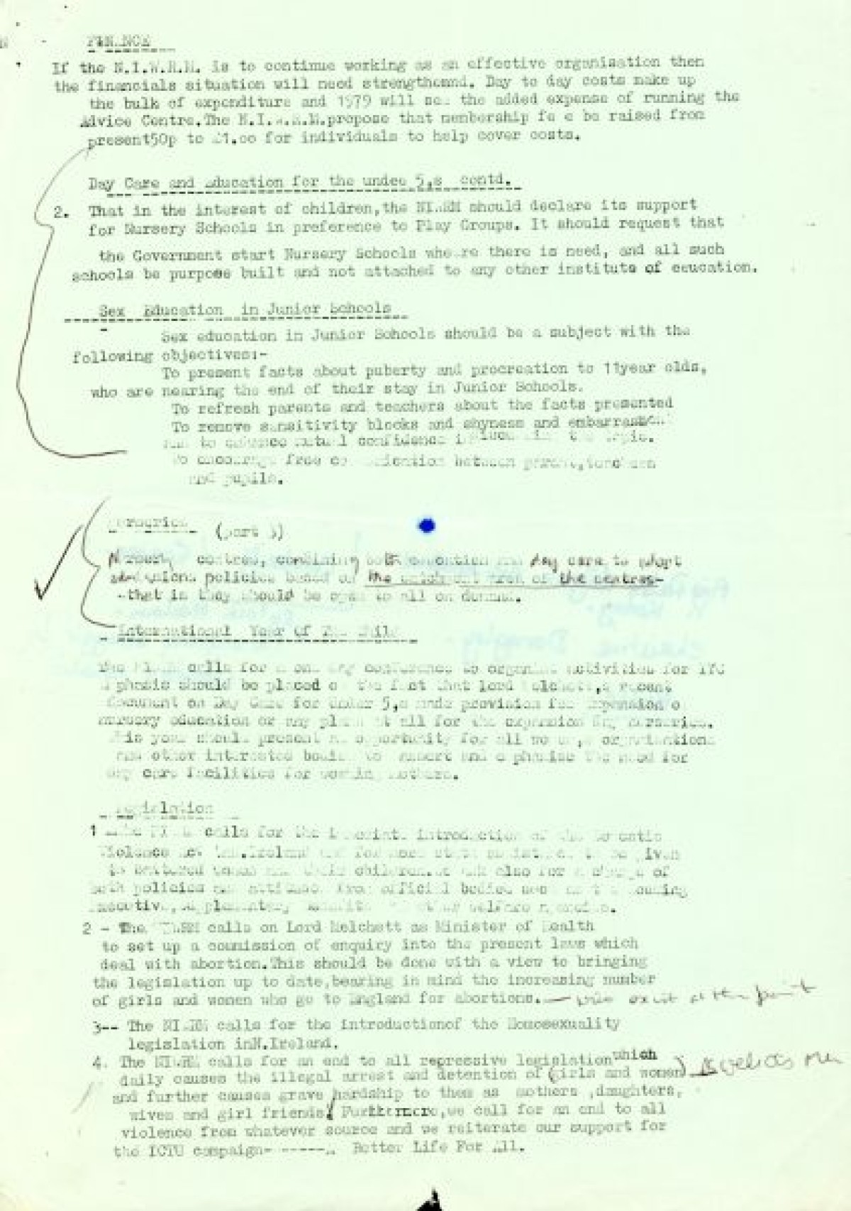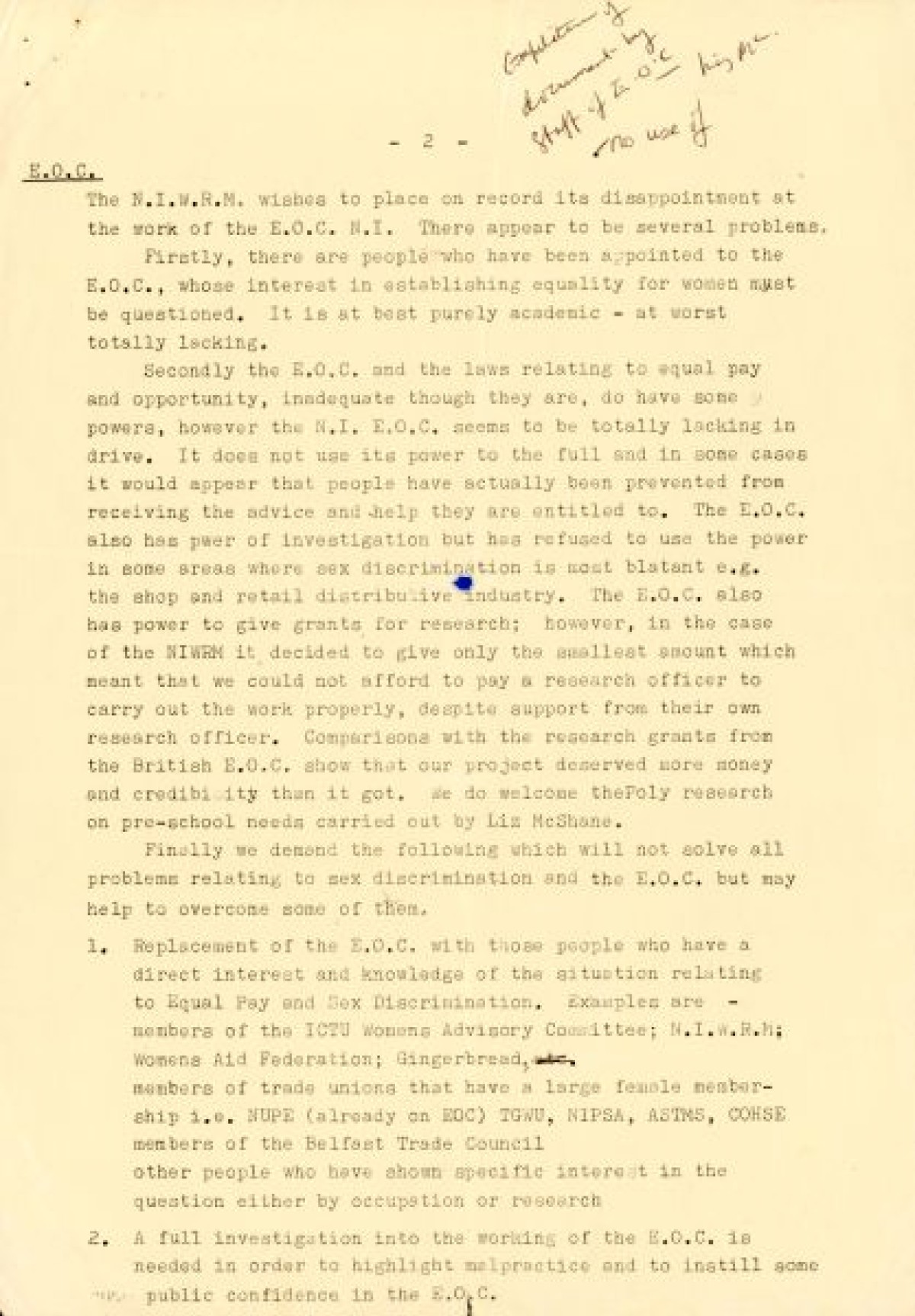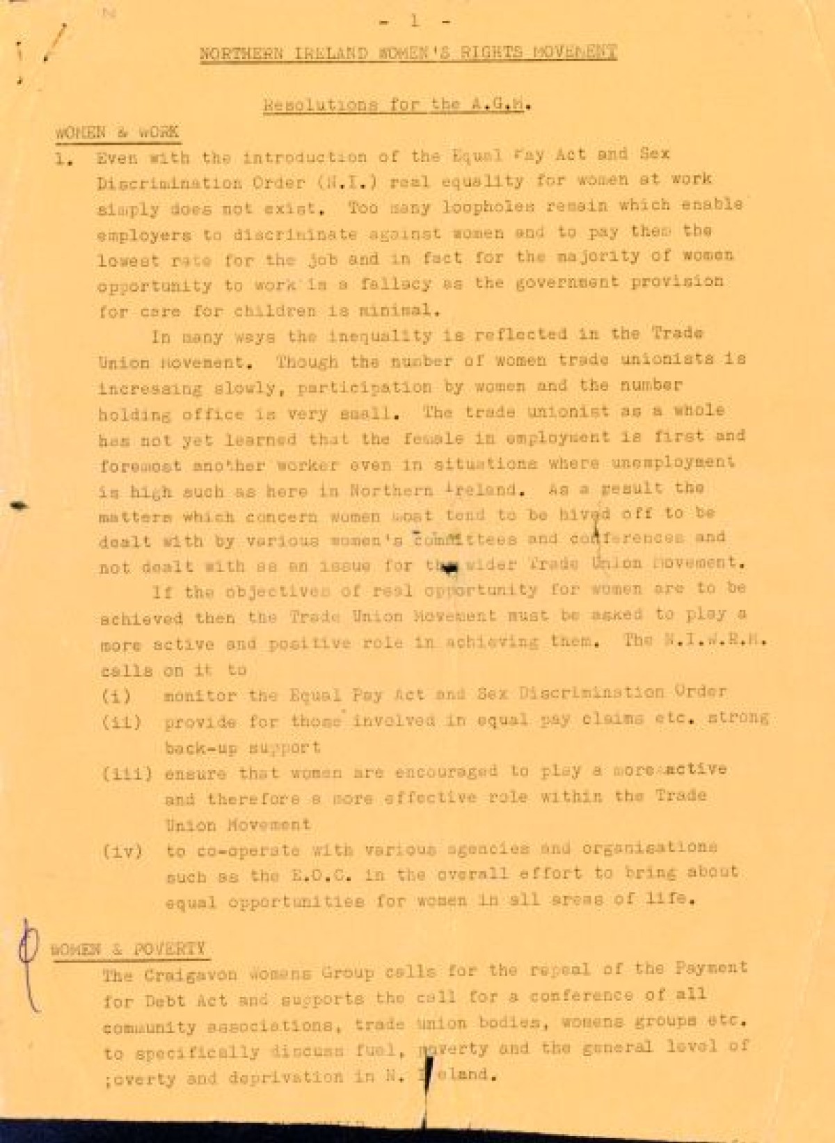 Report titled 'Resolutions for the AGM - Northern Ireland Women's Rights Movement' on orange, white and green paper with handwritten annotations and notes on back. The report discusses the NIWRM's disappointment/frustration with the Equal Opportunities Commission (EOC) and issues on poverty, day care and finance.