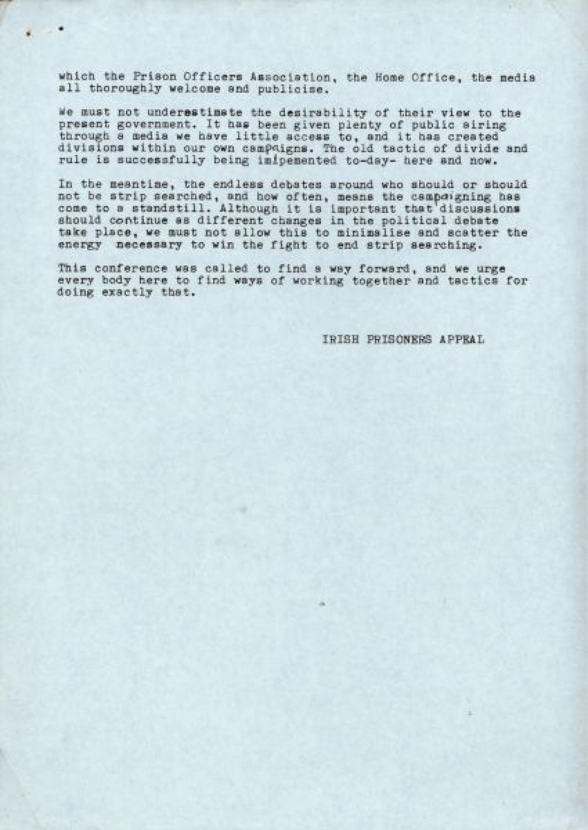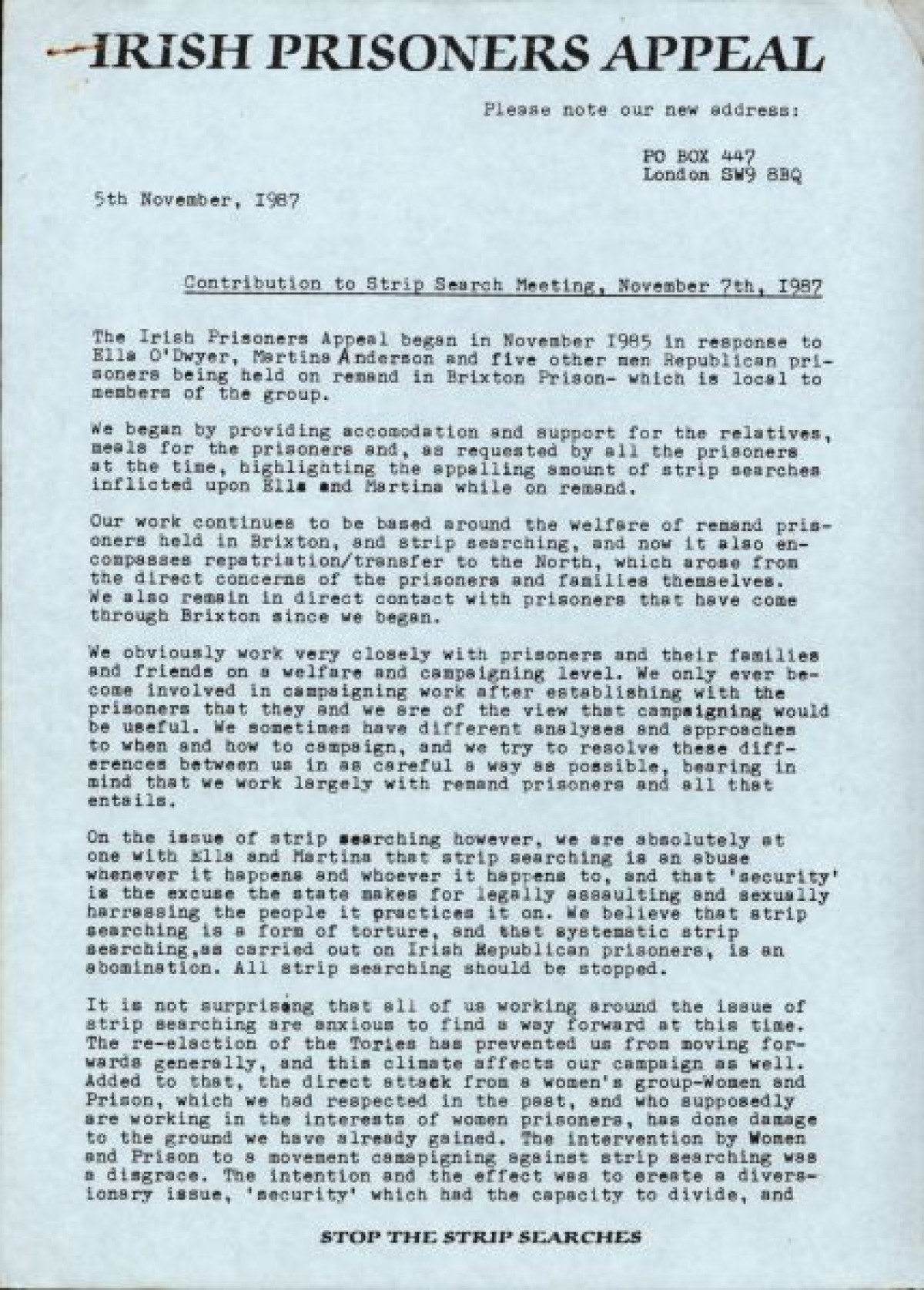 Irish Prisoners Appeal containing a contribution to strip-searching meeting about Irish prisoners in Brixton prison.