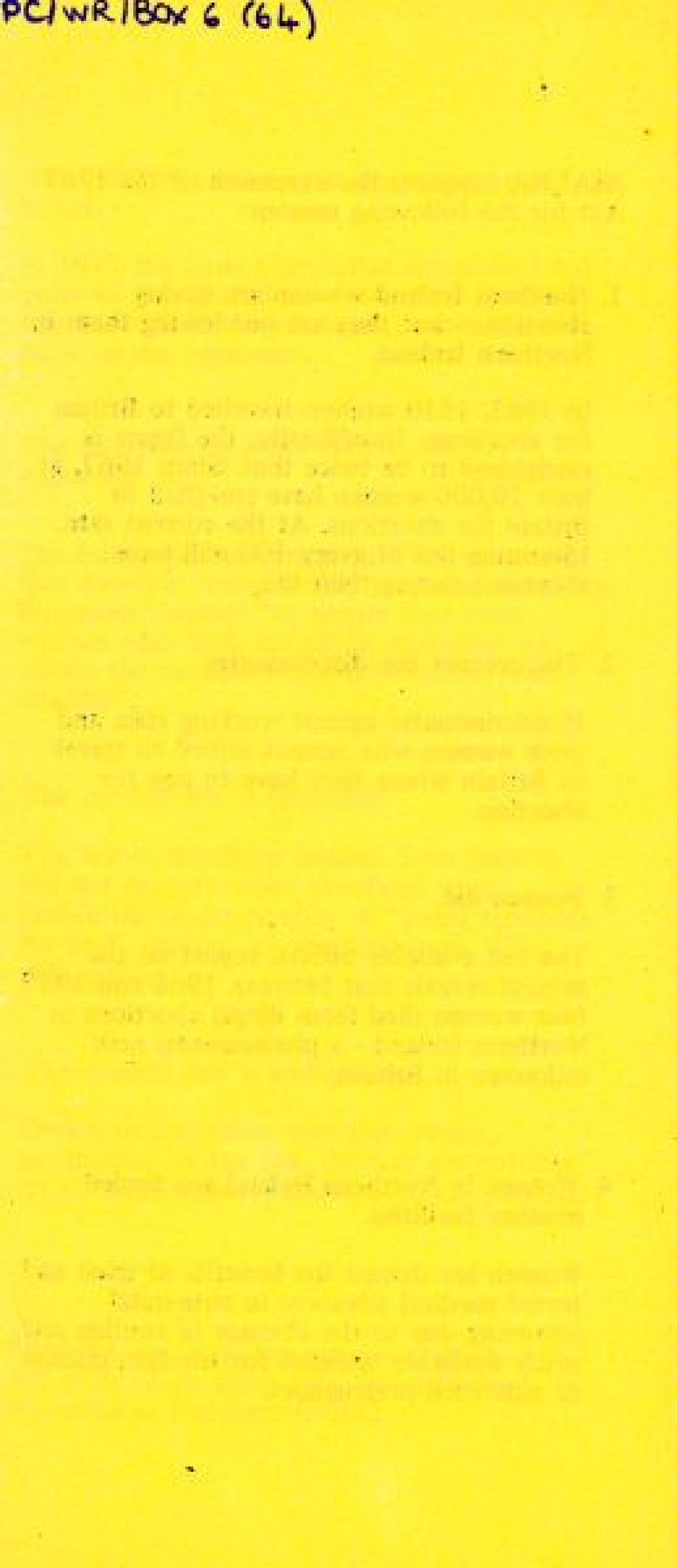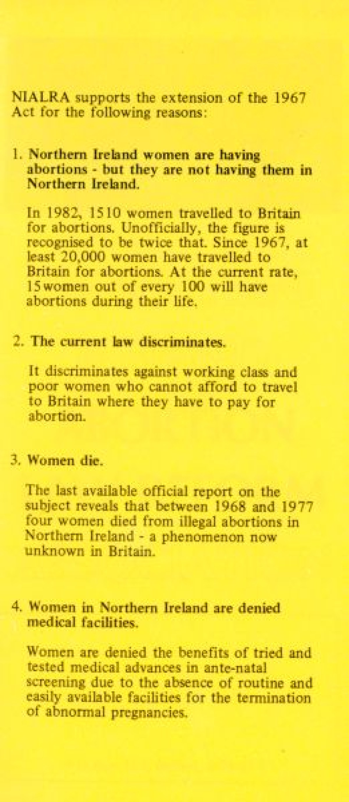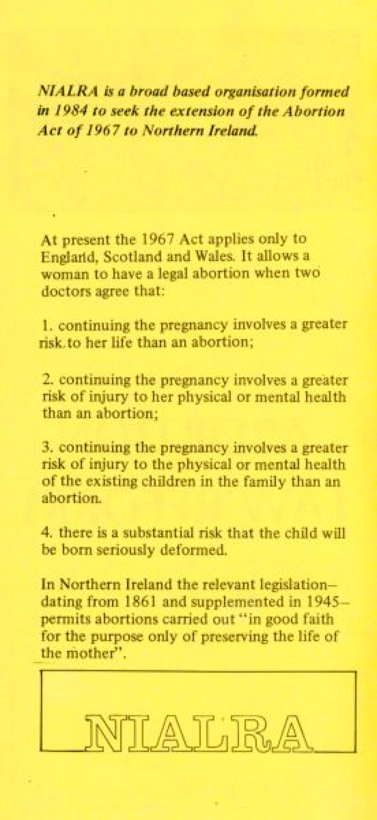 Leaflet produced by the Northern Ireland Abortion Law Reform Association (NIALRA), printed on yellow paper. The publication outlines the aims and objectives of NIALRA, and their demand for the extension of the Abortion Act, 1967, 'to allow safe, free and legal abortions in Northern Ireland'.