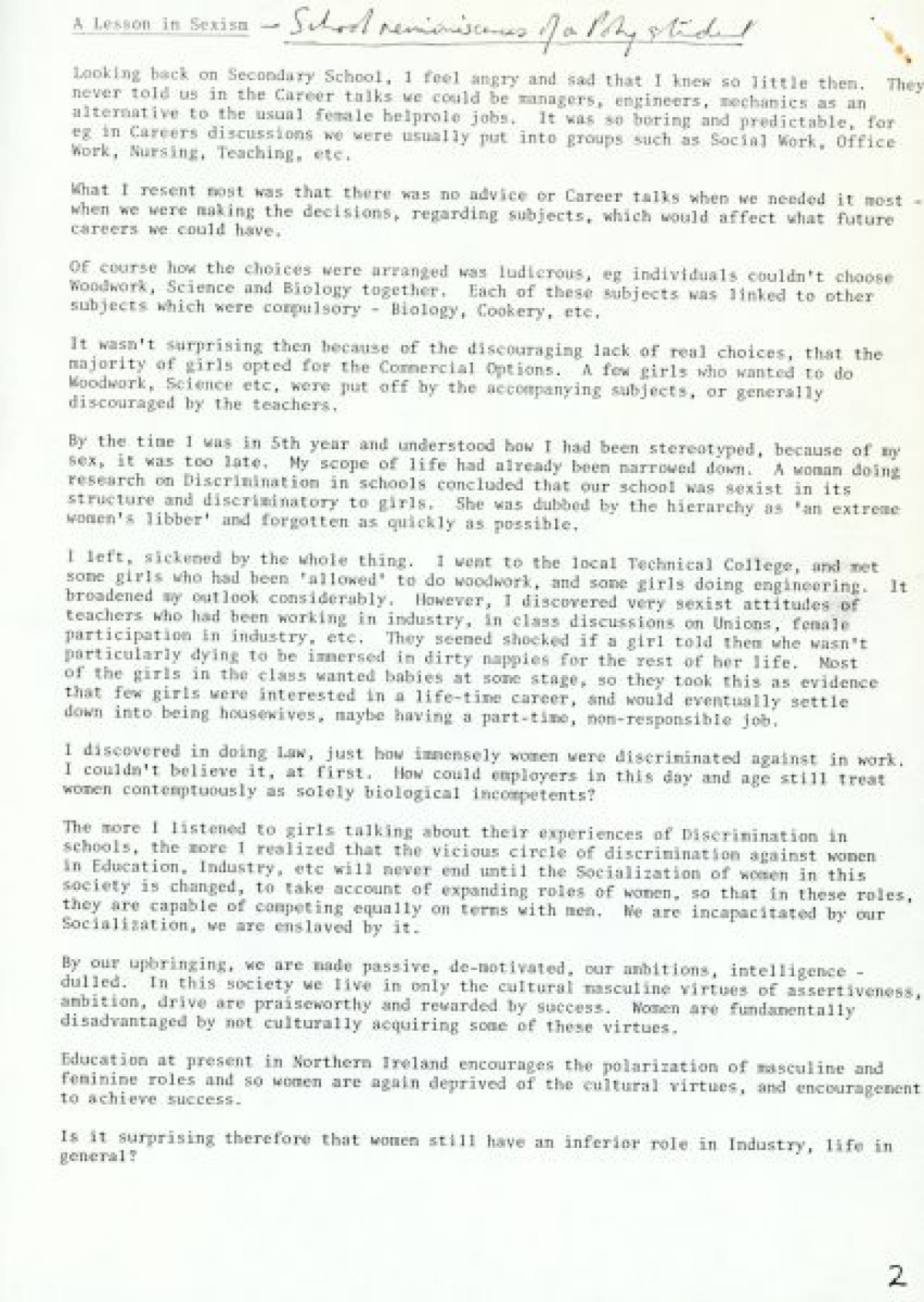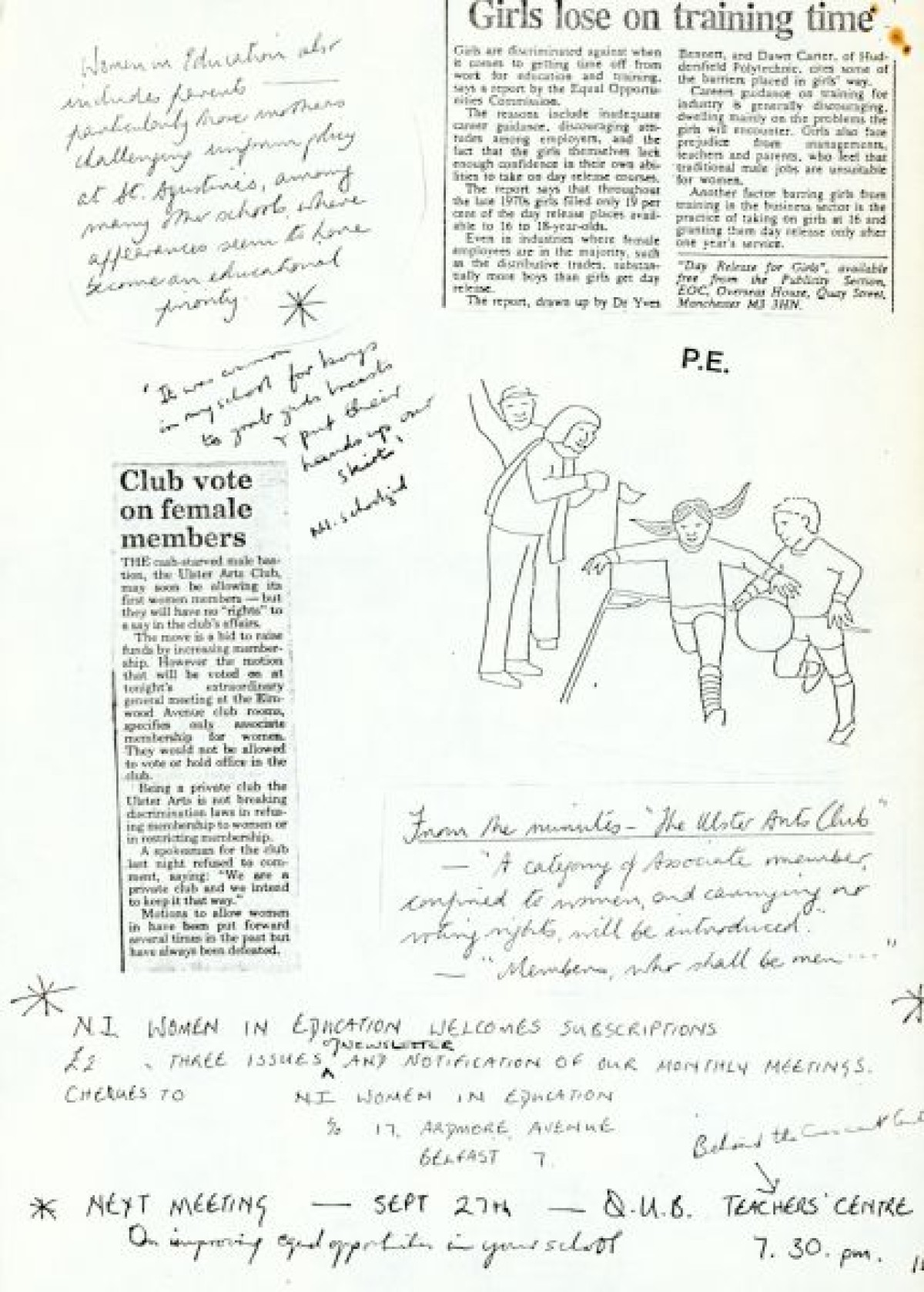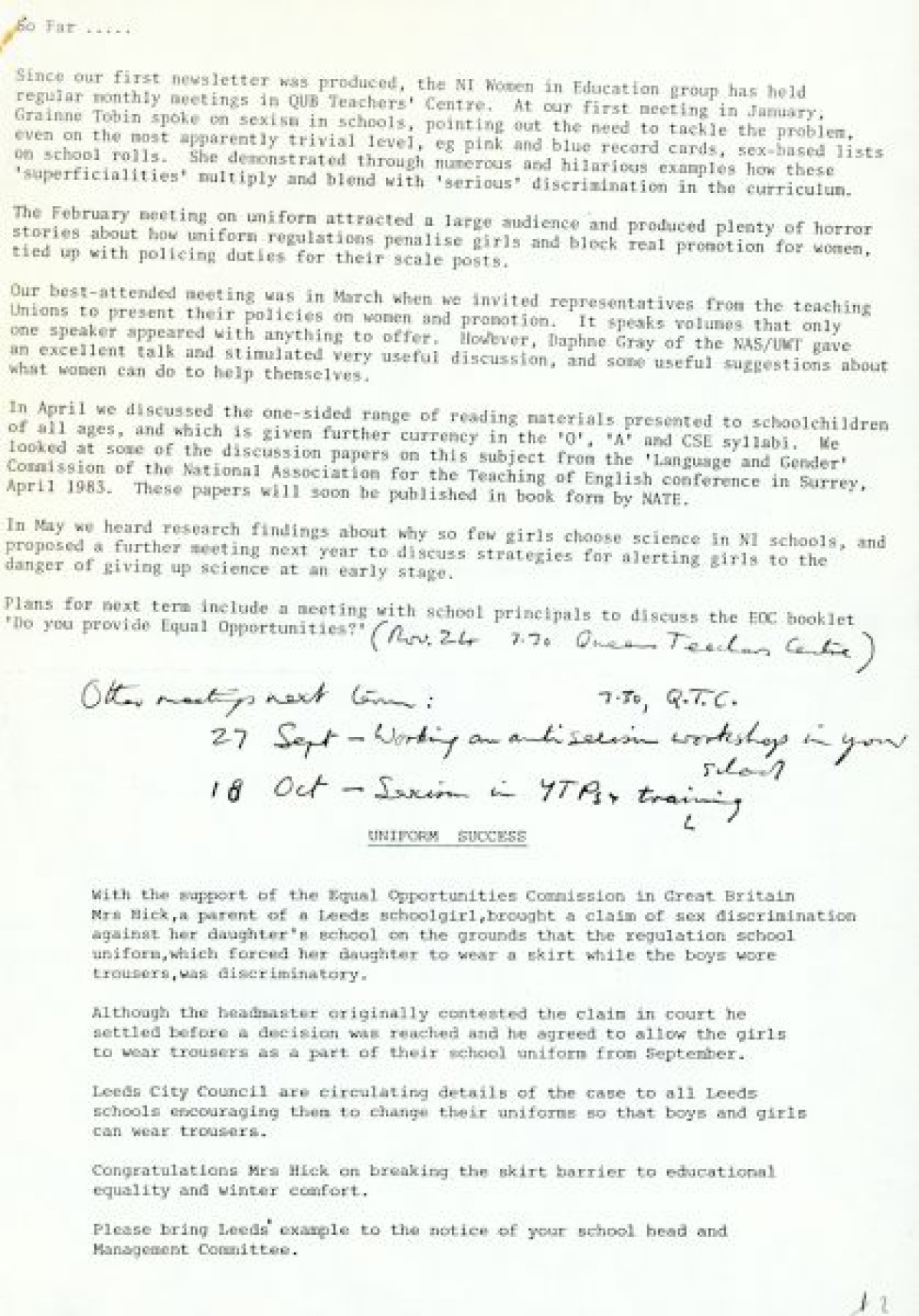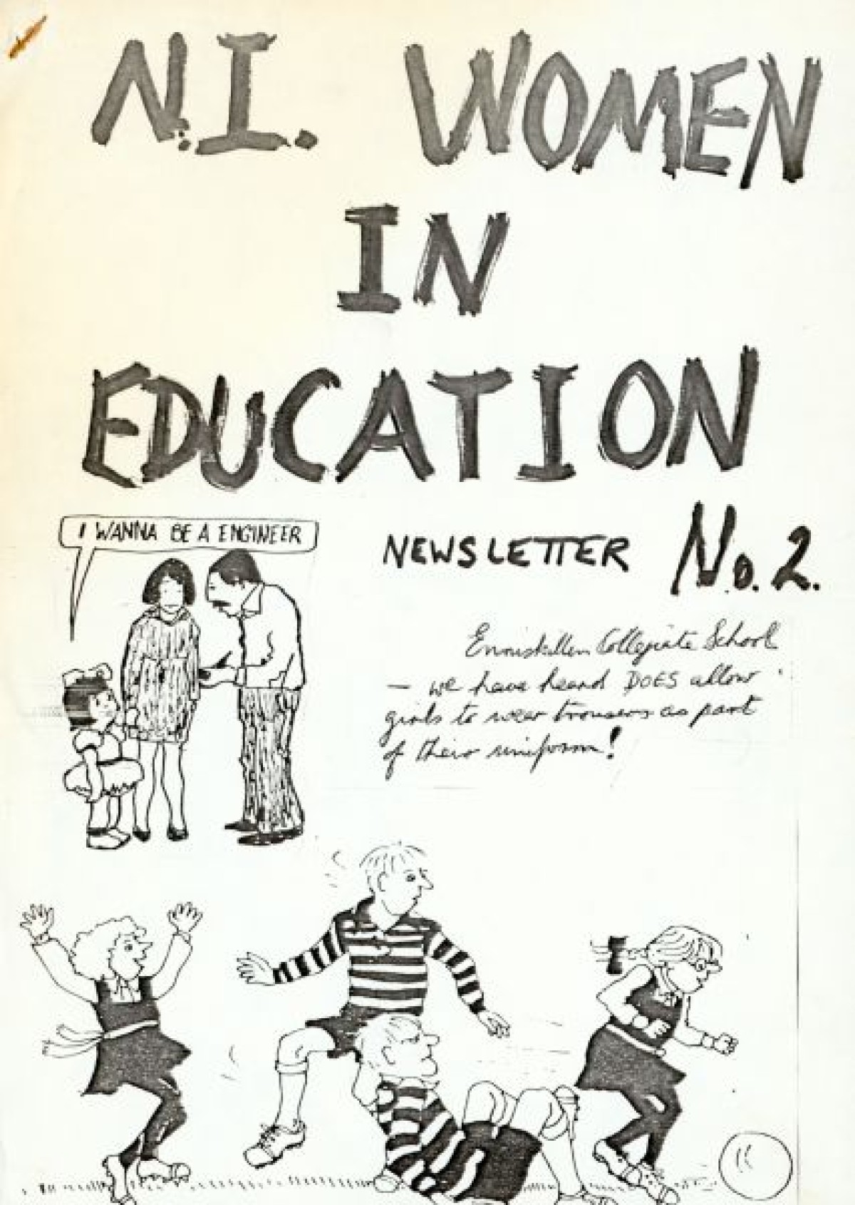 NI Women in Education, issue 2, 1982. Features a summary of achievements of the Northern Ireland Women in Education group, and articles covering: sex discrimination in girls' school uniforms; sexism in secondary education; a programme for equal opportunities in schools; "Home Economics - a sixth formers' view"; a book review of "Nobody's family is going to change," by Louise Fitzhugh; and photocopied newspaper clippings about sex discrimination in schools.
