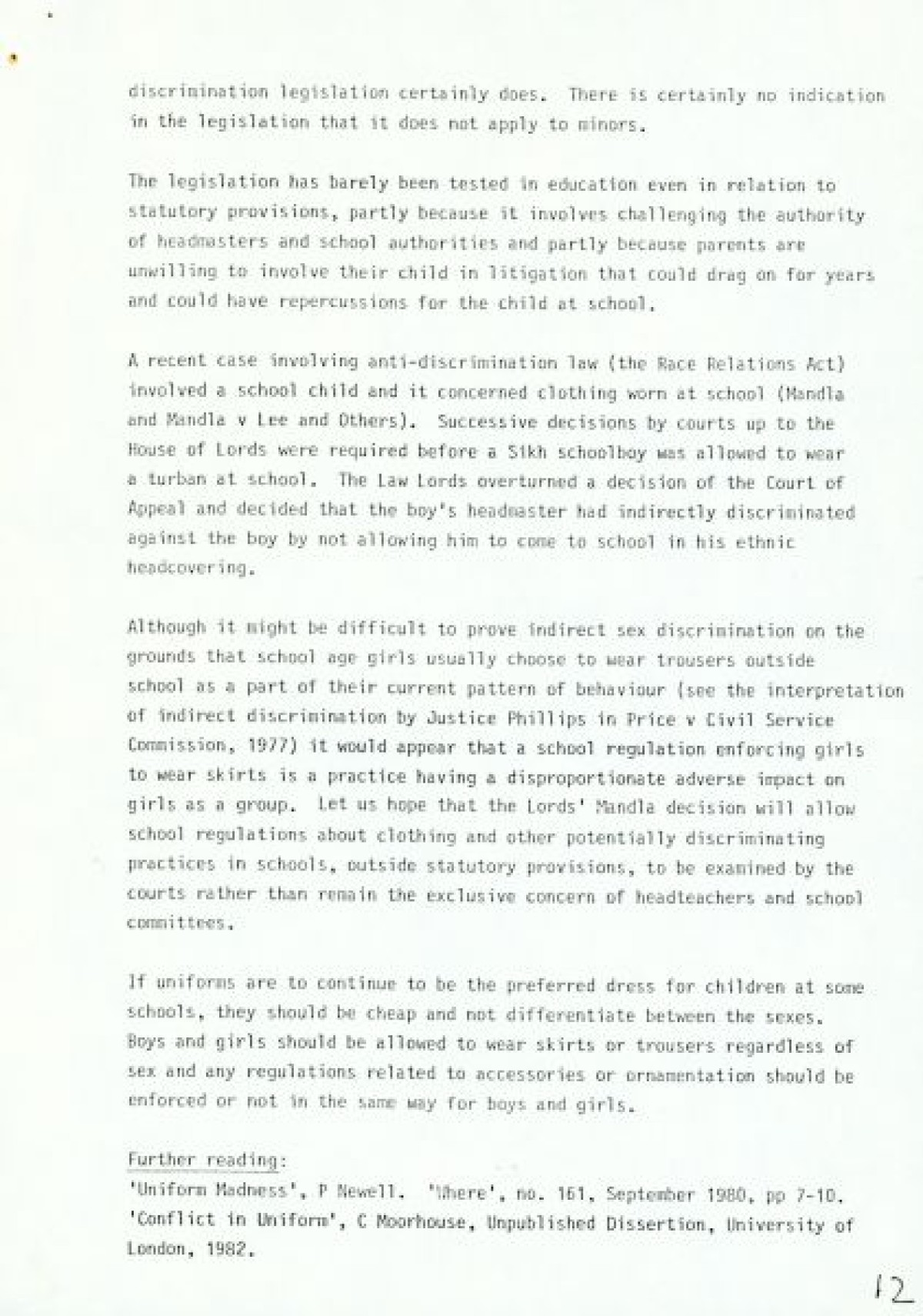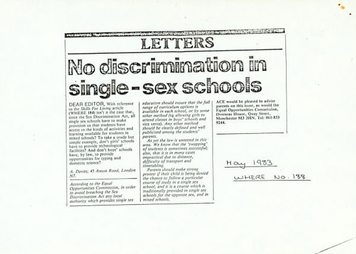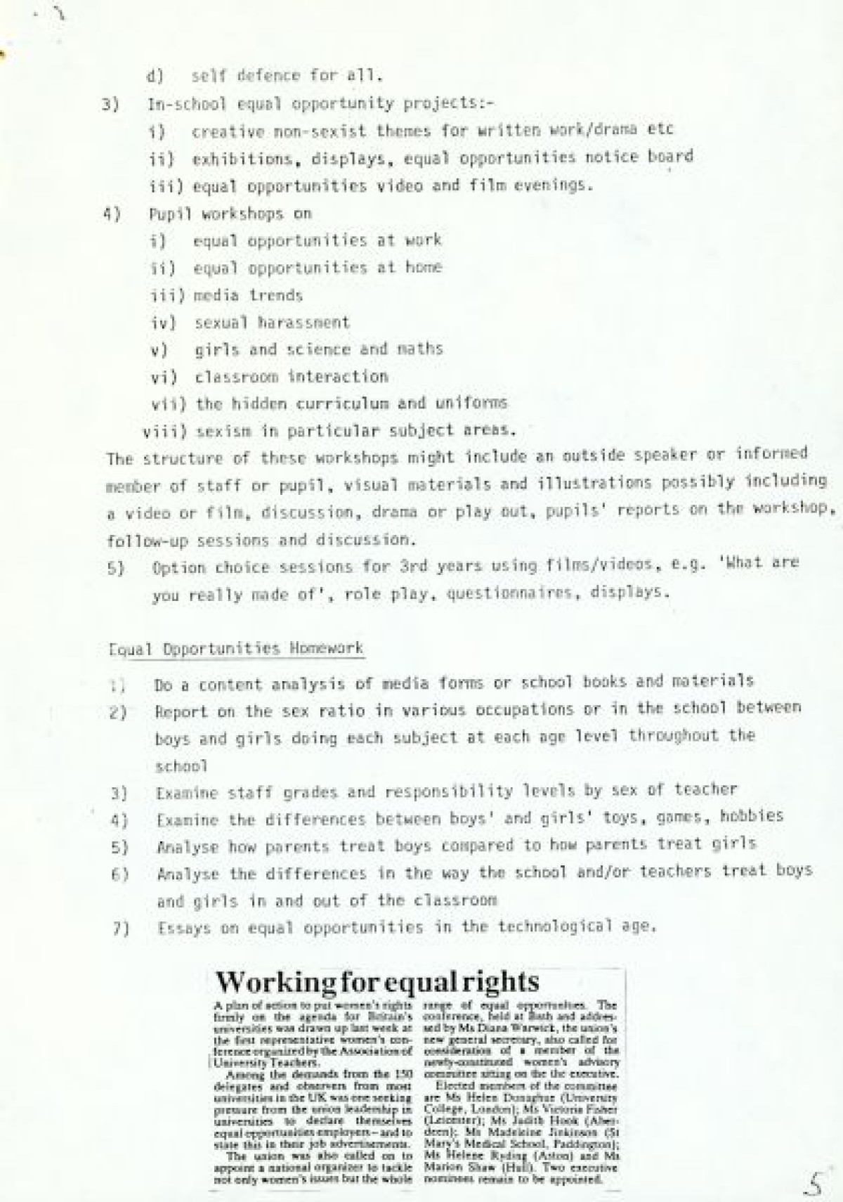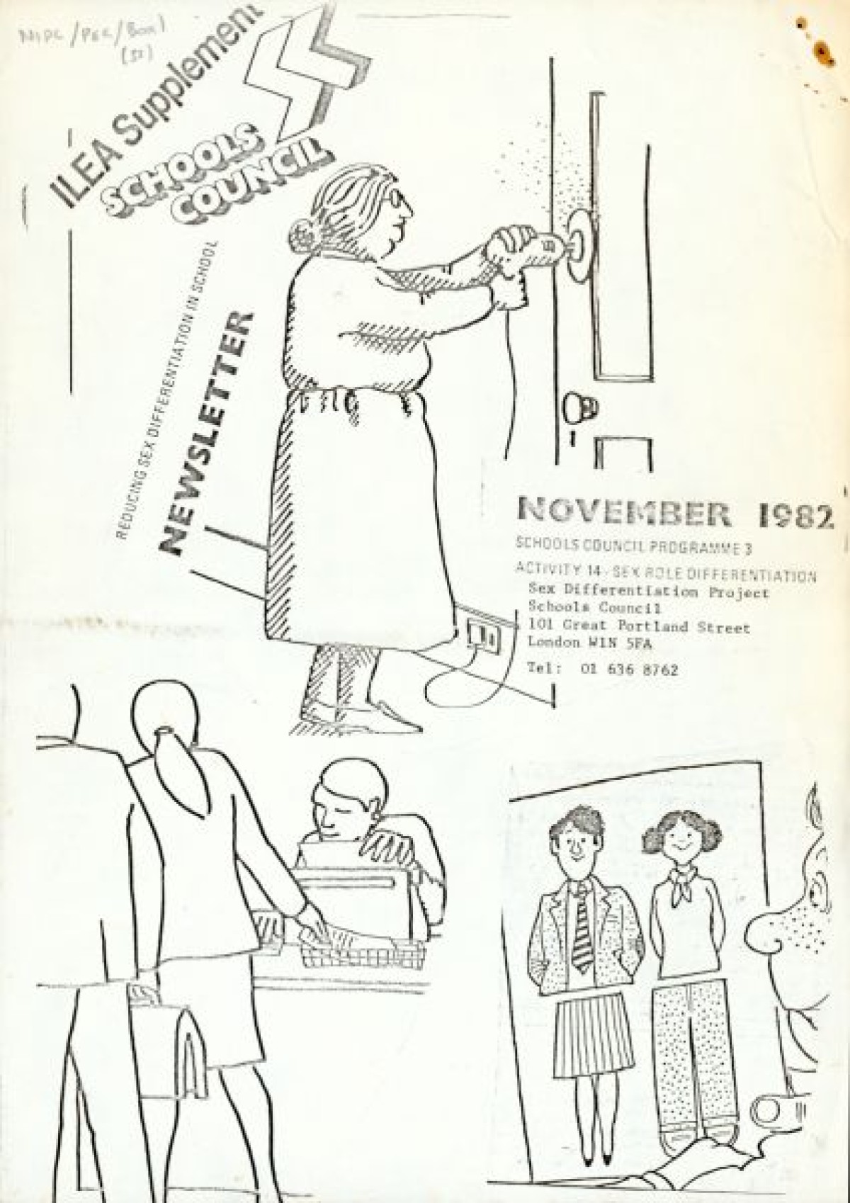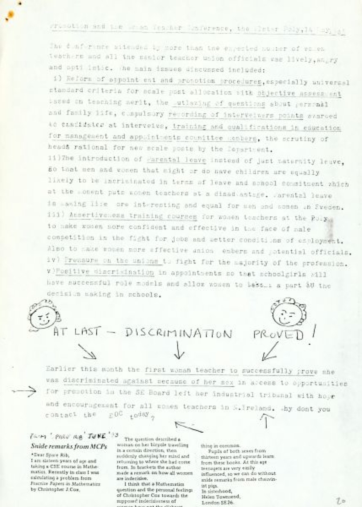 NI Women in Education, issue 2, 1982. Features a summary of achievements of the Northern Ireland Women in Education group, and articles covering: sex discrimination in girls' school uniforms; sexism in secondary education; a programme for equal opportunities in schools; "Home Economics - a sixth formers' view"; a book review of "Nobody's family is going to change," by Louise Fitzhugh; and photocopied newspaper clippings about sex discrimination in schools.