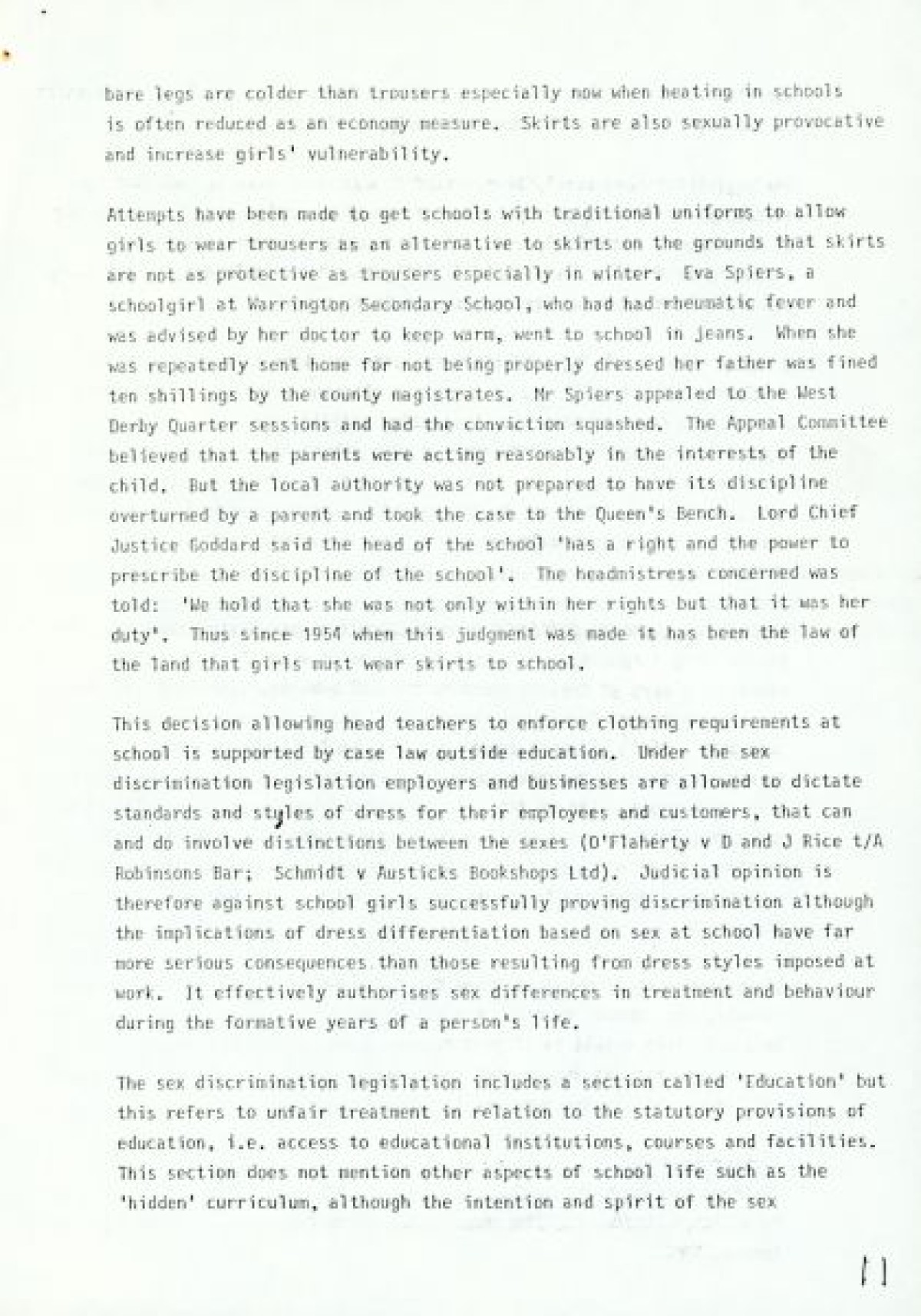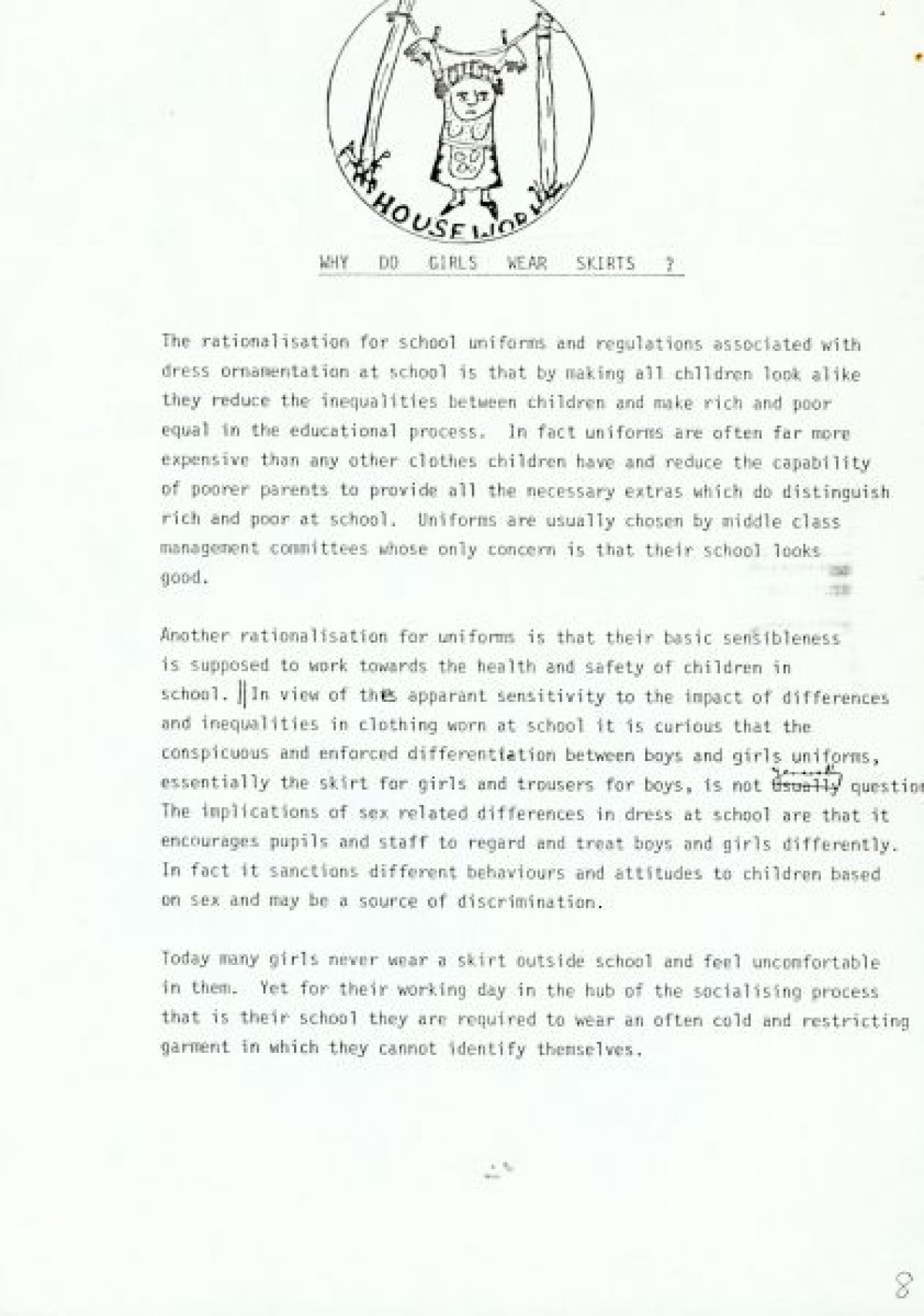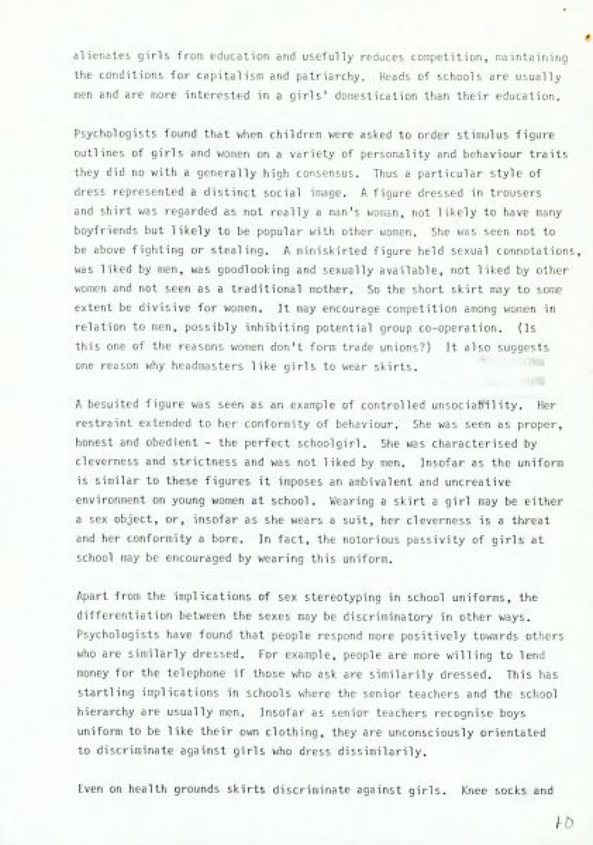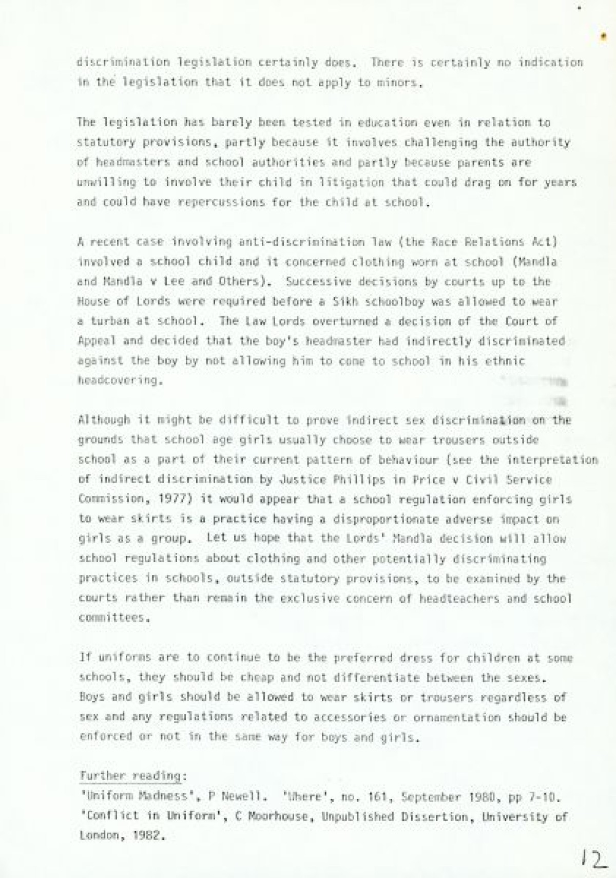 NI Women in Education, issue 2, 1982. Features a summary of achievements of the Northern Ireland Women in Education group, and articles covering: sex discrimination in girls' school uniforms; sexism in secondary education; a programme for equal opportunities in schools; "Home Economics - a sixth formers' view"; a book review of "Nobody's family is going to change," by Louise Fitzhugh; and photocopied newspaper clippings about sex discrimination in schools.