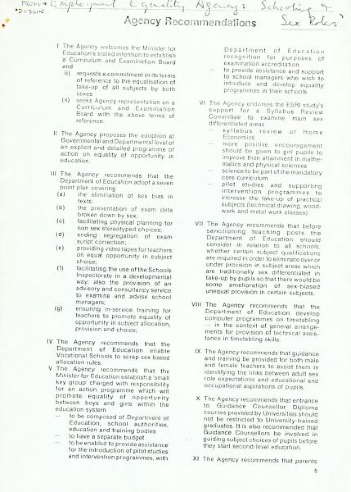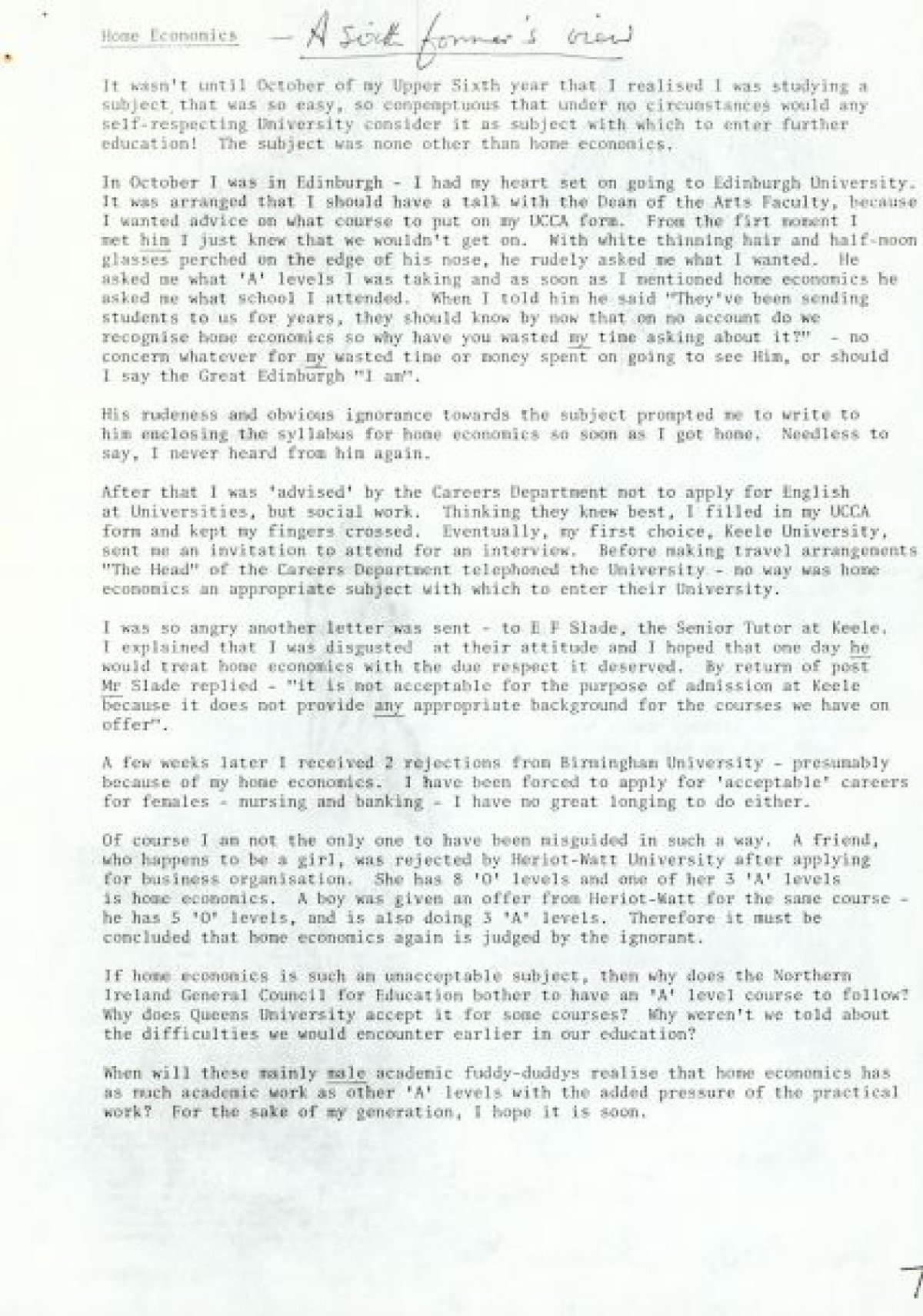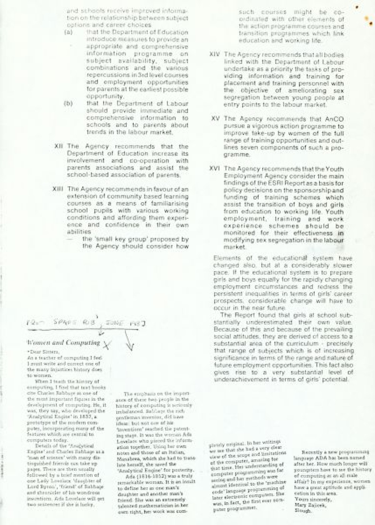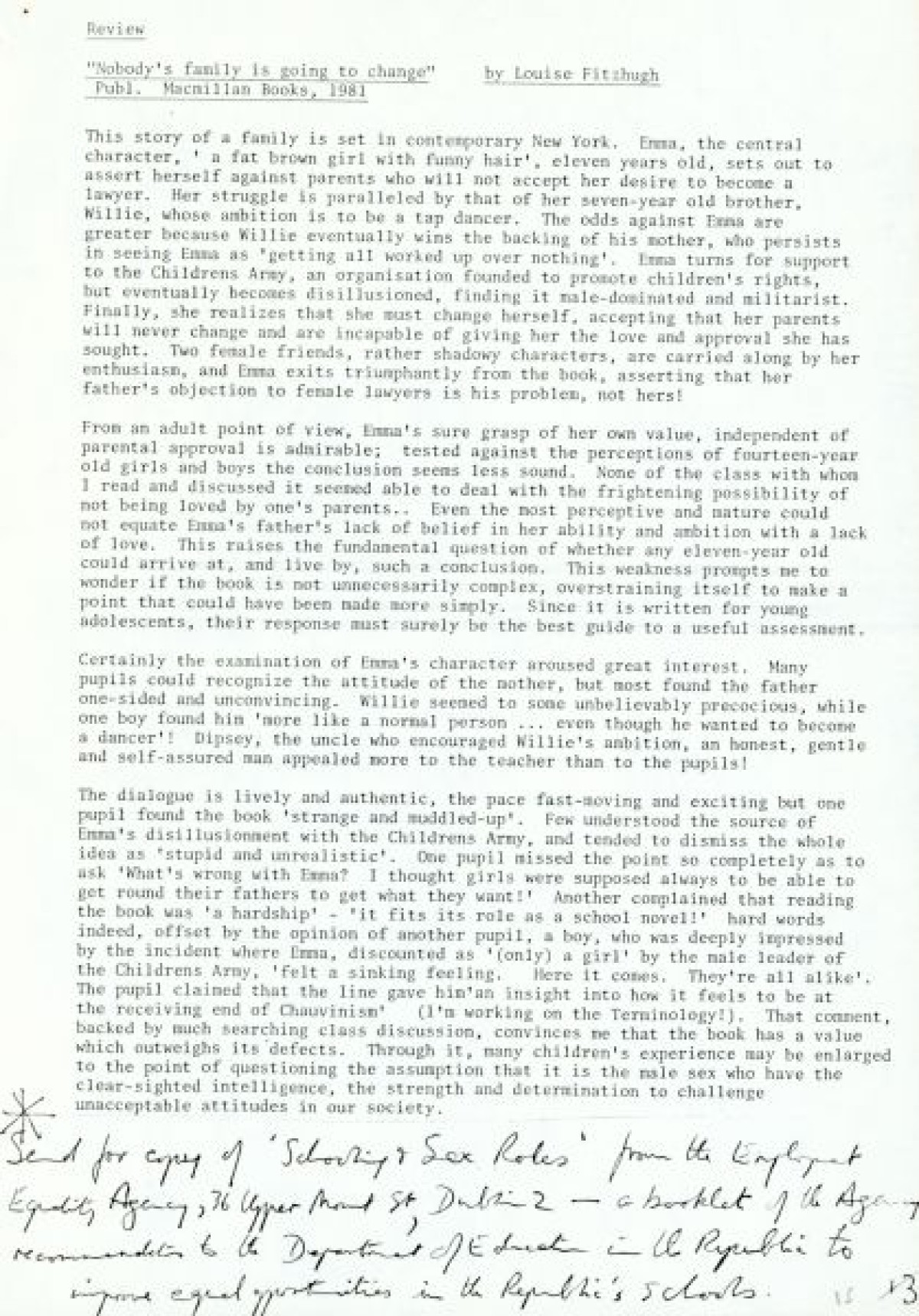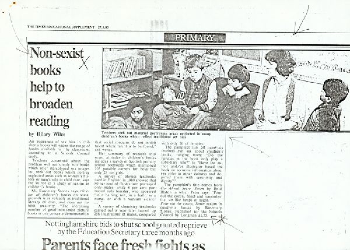 NI Women in Education, issue 2, 1982. Features a summary of achievements of the Northern Ireland Women in Education group, and articles covering: sex discrimination in girls' school uniforms; sexism in secondary education; a programme for equal opportunities in schools; "Home Economics - a sixth formers' view"; a book review of "Nobody's family is going to change," by Louise Fitzhugh; and photocopied newspaper clippings about sex discrimination in schools.
