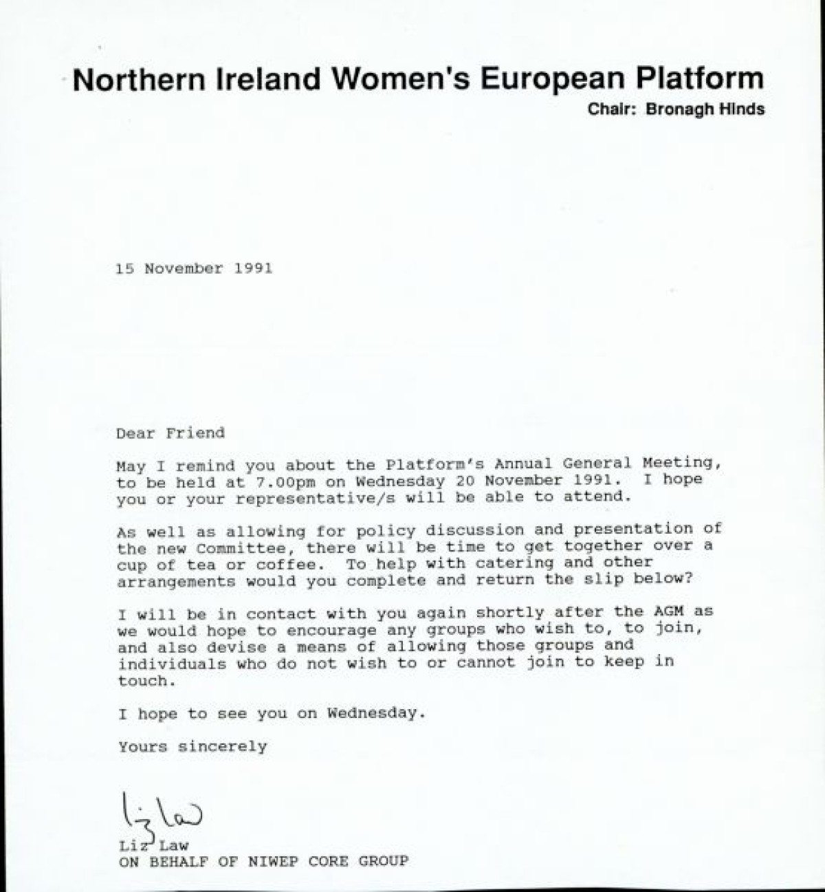Northern Ireland Women's European platform chaired by Bronagh Hinds, inviting attendance at the Annual General Meeting on the 20