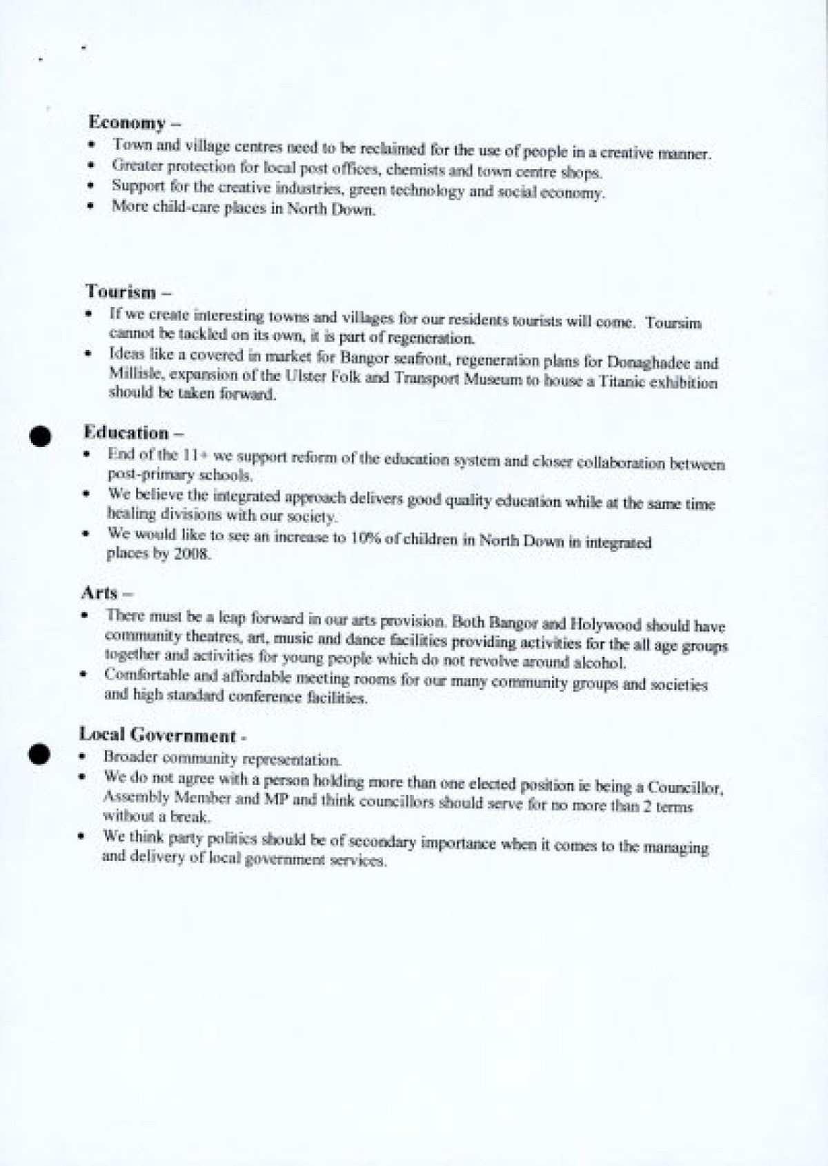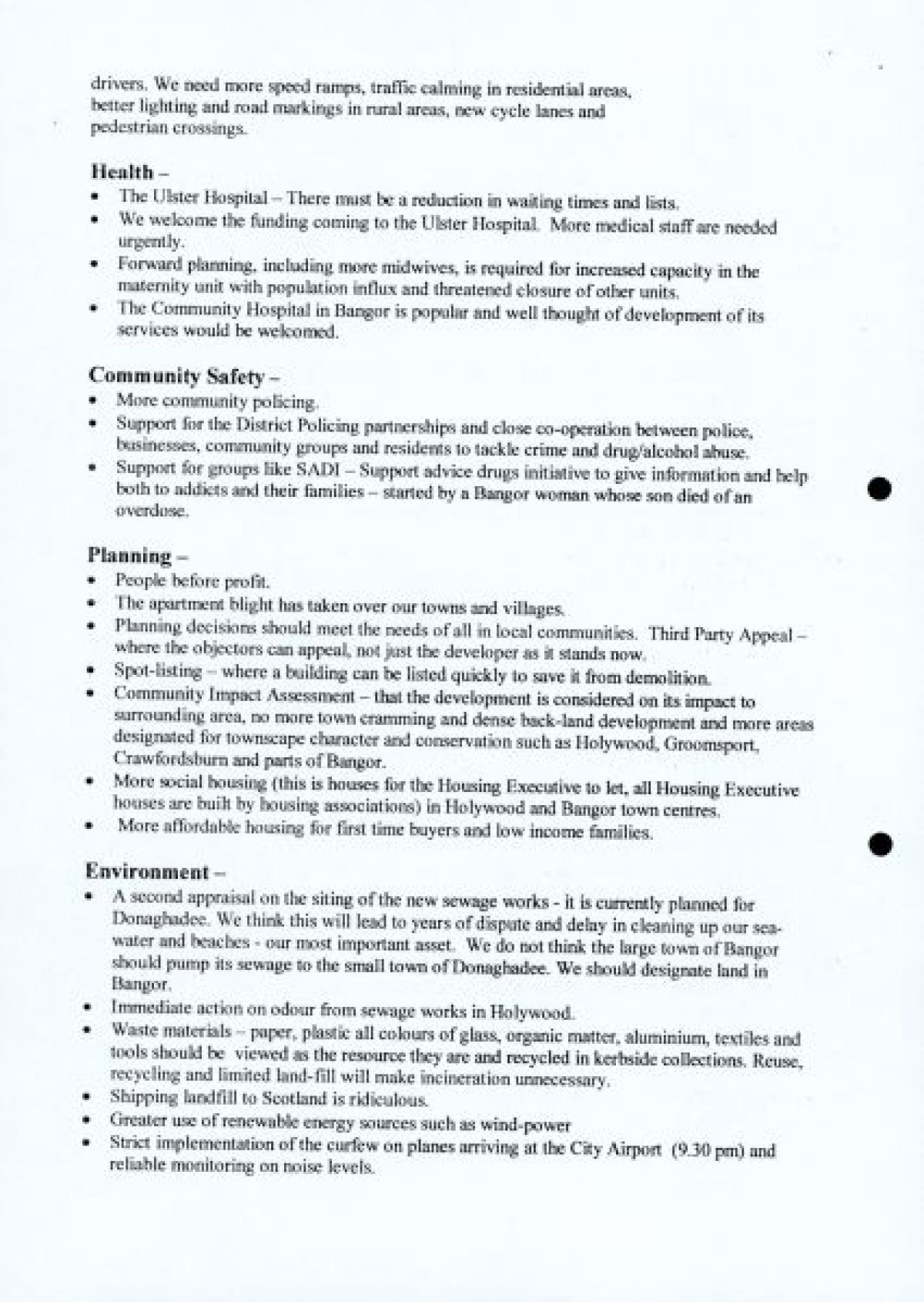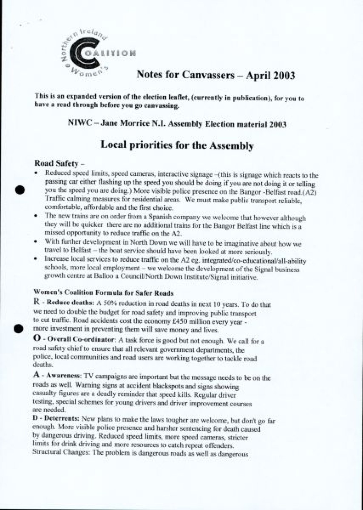 Northern Ireland Women's Coalition titled 'Notes for Canvassers - April 2003'. Includes guidelines for canvassers when speaking to voters regarding local priorities. Covers the party's stance on a number of key issues including Road Safety, Health, Community Safety, Planning, Environment, Economy, Tourism, Education, Arts, and Local Government.