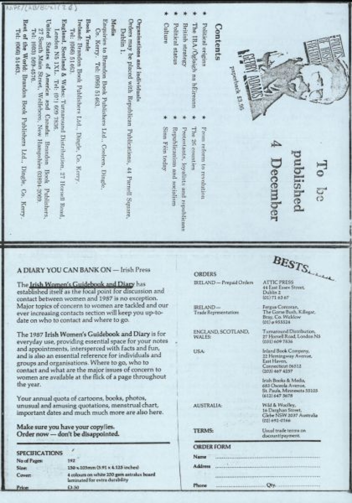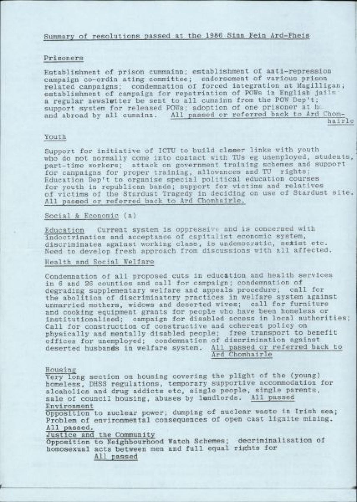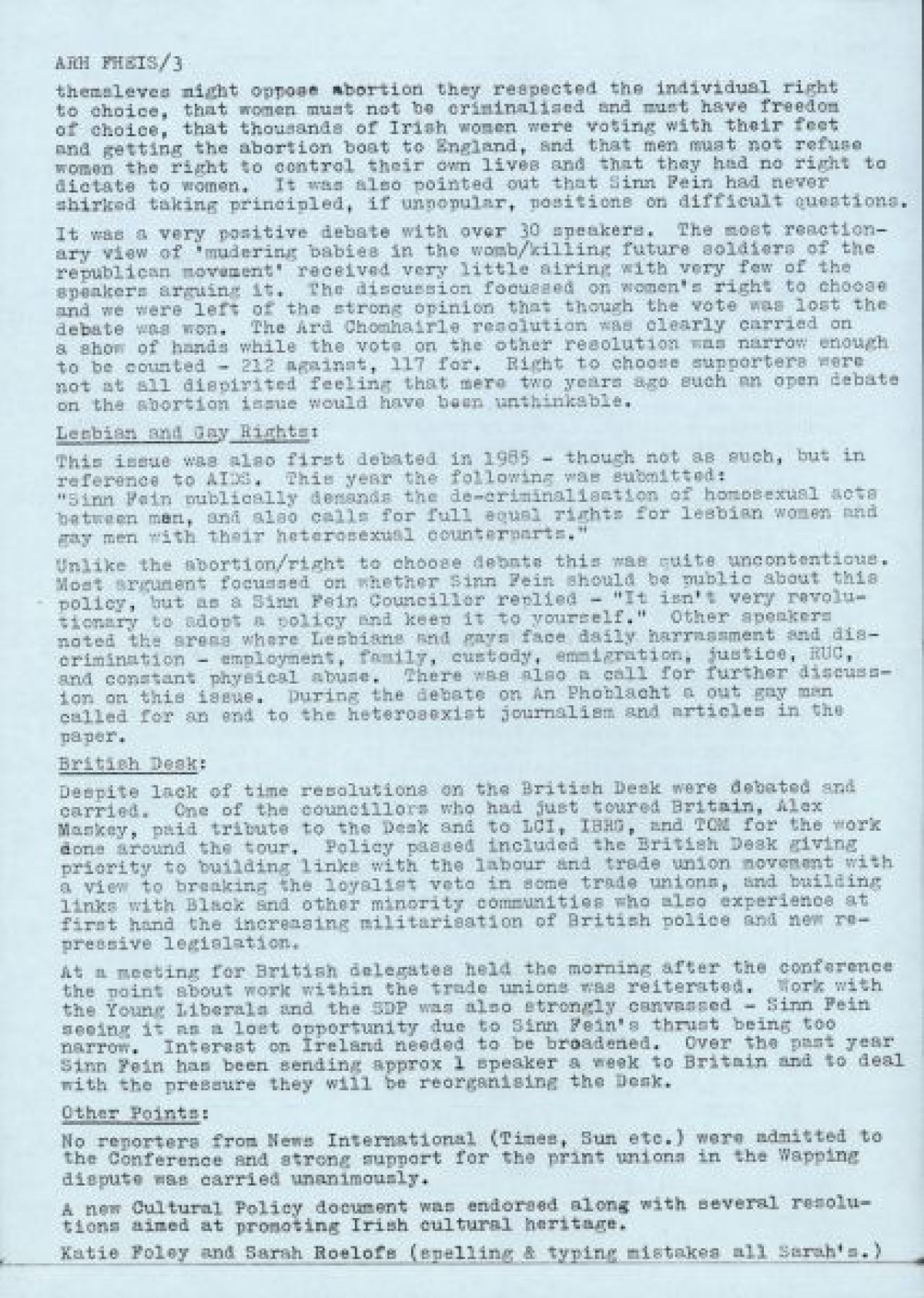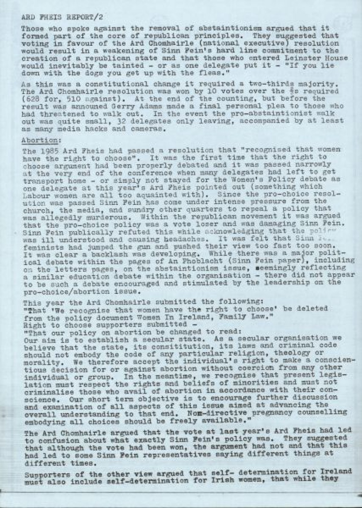 Labour Women for Ireland. Contains details, including a map, for a rally against strip searching, report from Sinn Féin Ard Fheis, and opinions on issues of LGBT and reproductive rights.