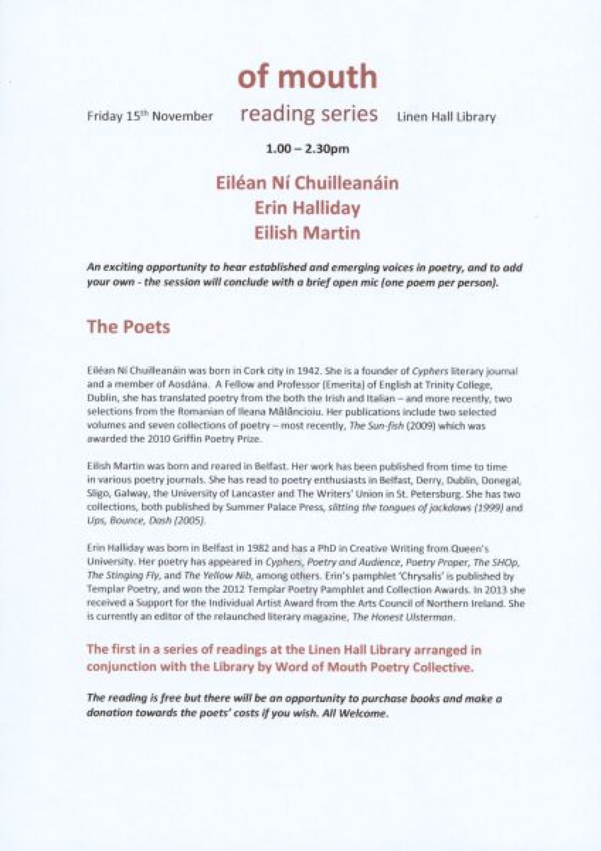 A4 colour poster and press release for an 'Of Mouth' poetry reading event in 2013 at the Linen Hall Library, featuring Eiléan Ní Chuilleanáin, Erin Halliday, and Eilish Martin.