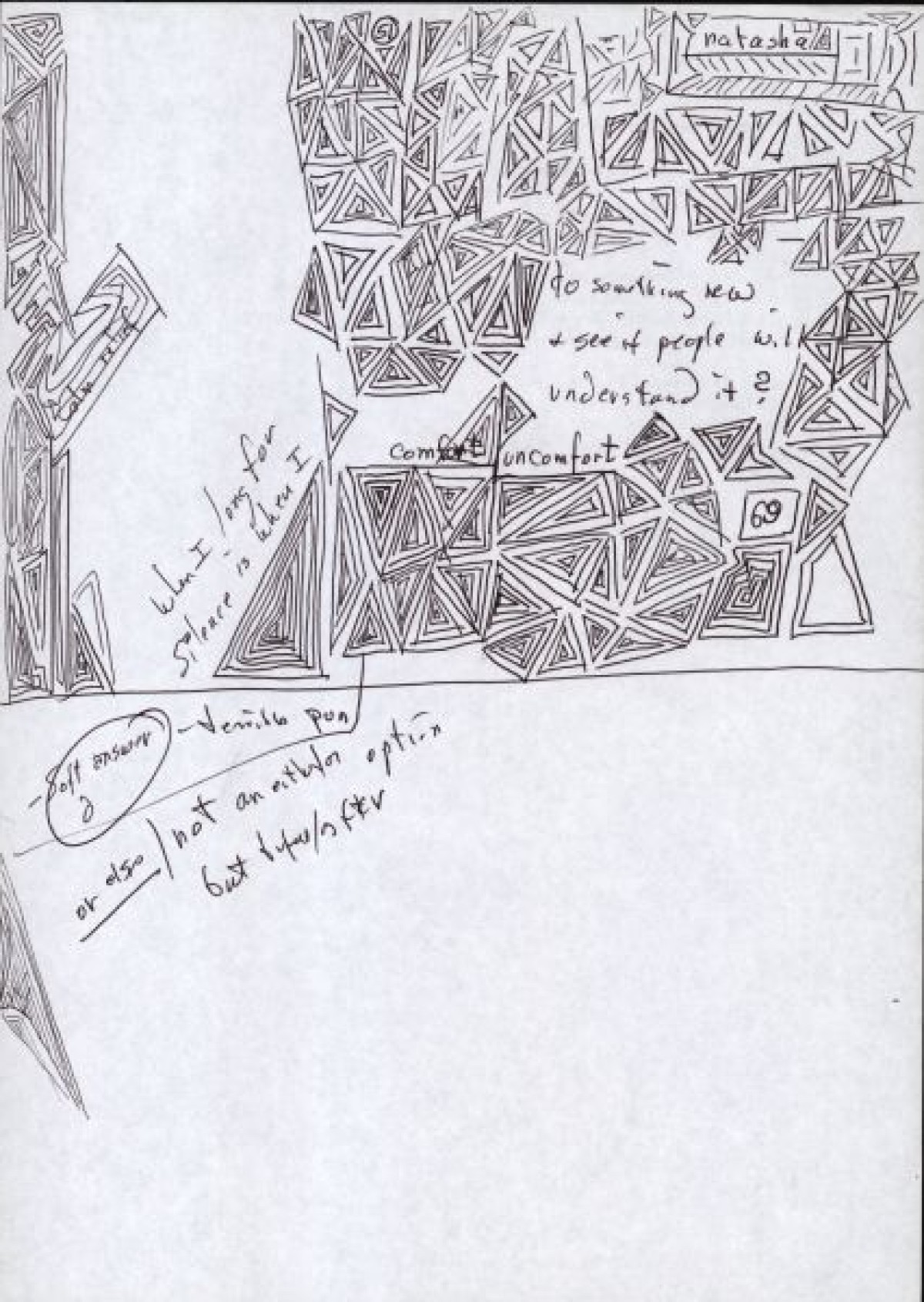 Two drafts of an unpublished poem by Ann Zell titled 'Oilean Leathan visitation.' Includes one draft featuring Ann Zell's annotations, and a geometric drawing with notes in pen.