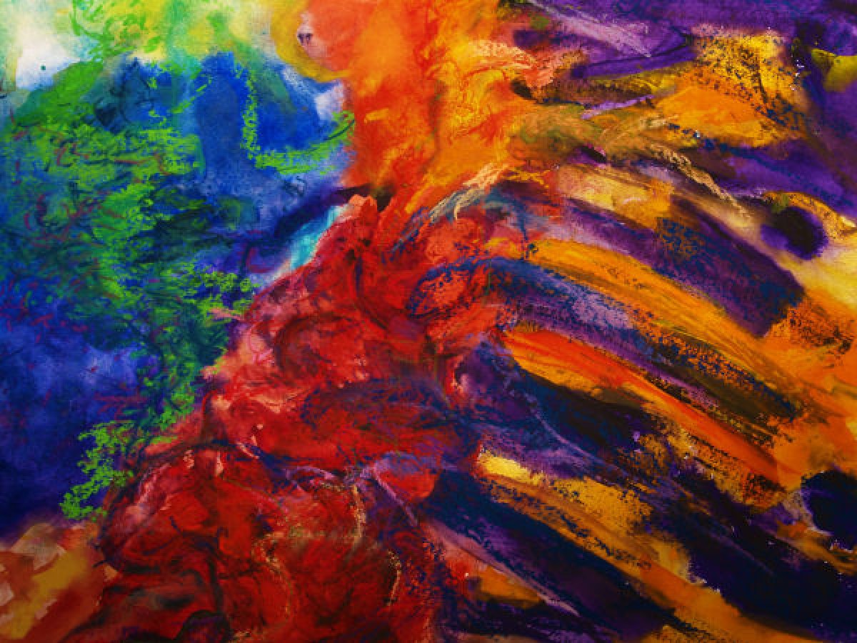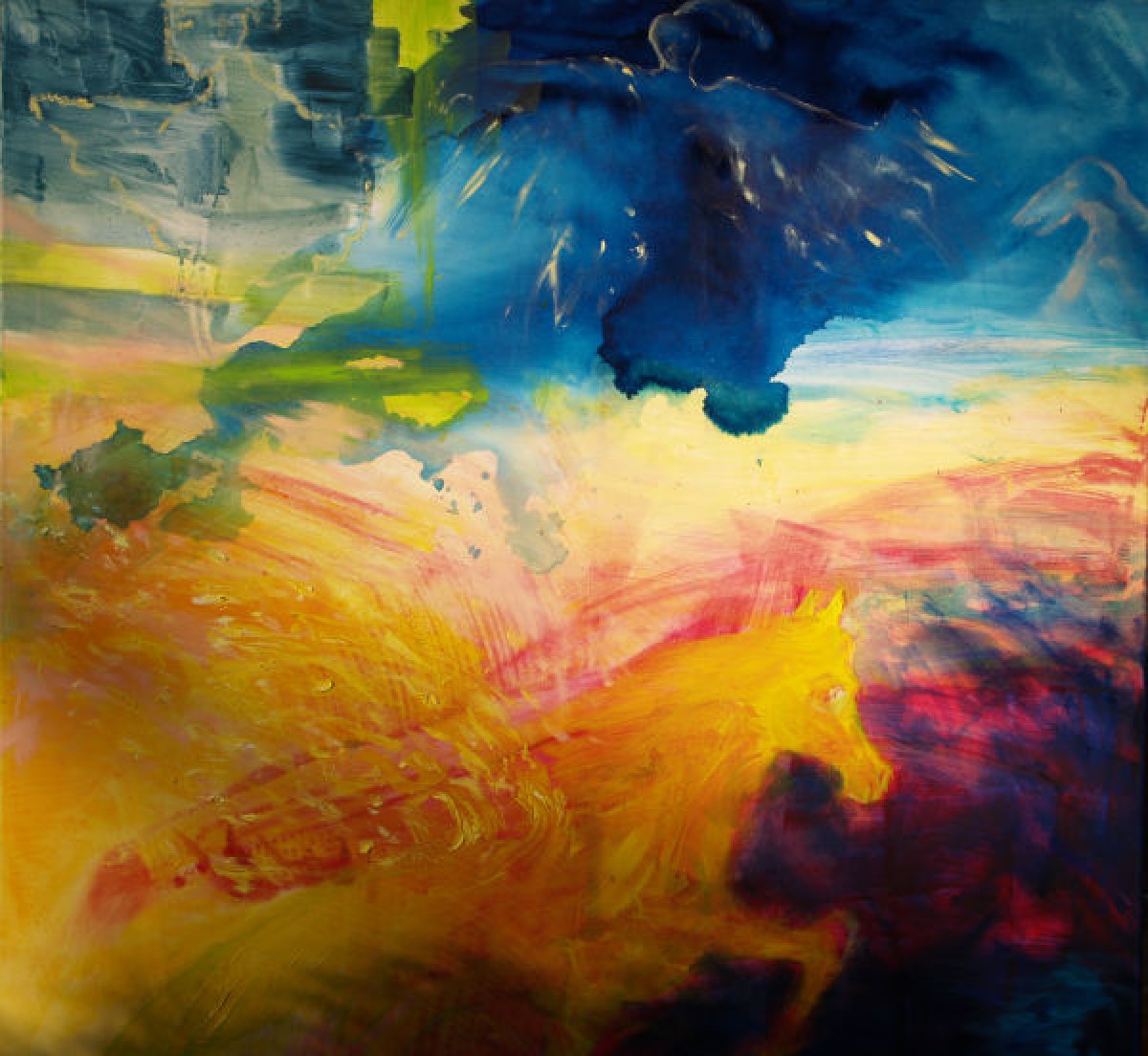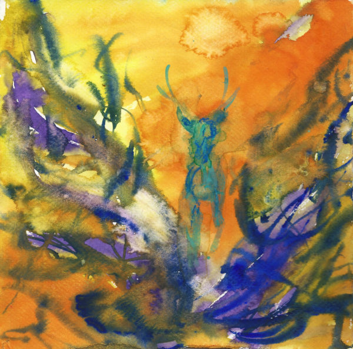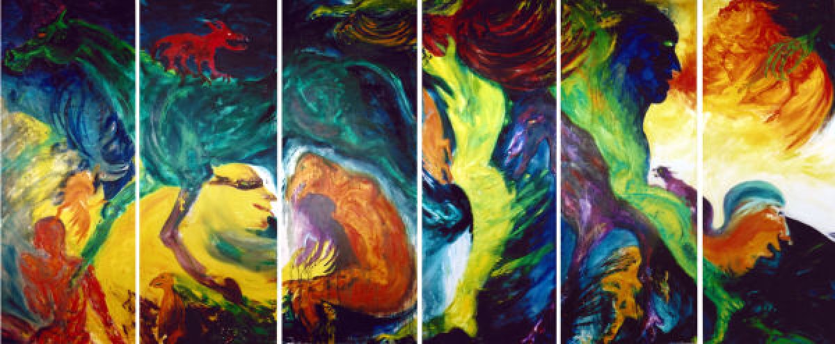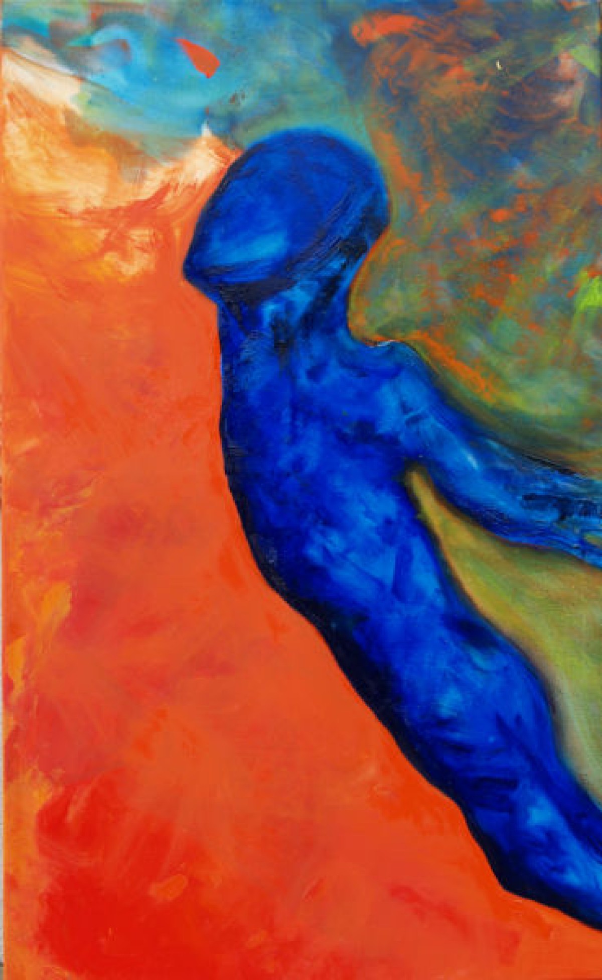 A collection of 7 digital images of oil on canvas pieces by Keike Twisselmann that formed part of a 2015 'Orpheus' exhibition in Kleve, Germany, at the 'Wasserburg'; a series which began in the artist's studio home in 2000 in Carlisle Memorial Church Belfast. Images are titled; 'Sprung aus der Leer / jump_from _the_void (Yves Klein), 'sternzeichen morgen', 'schattenfiguren', 'hirsch vom licht', '6 doors', 'Maedchen-girl_Oel auf Leinwand', and 'fairy thorn'.
