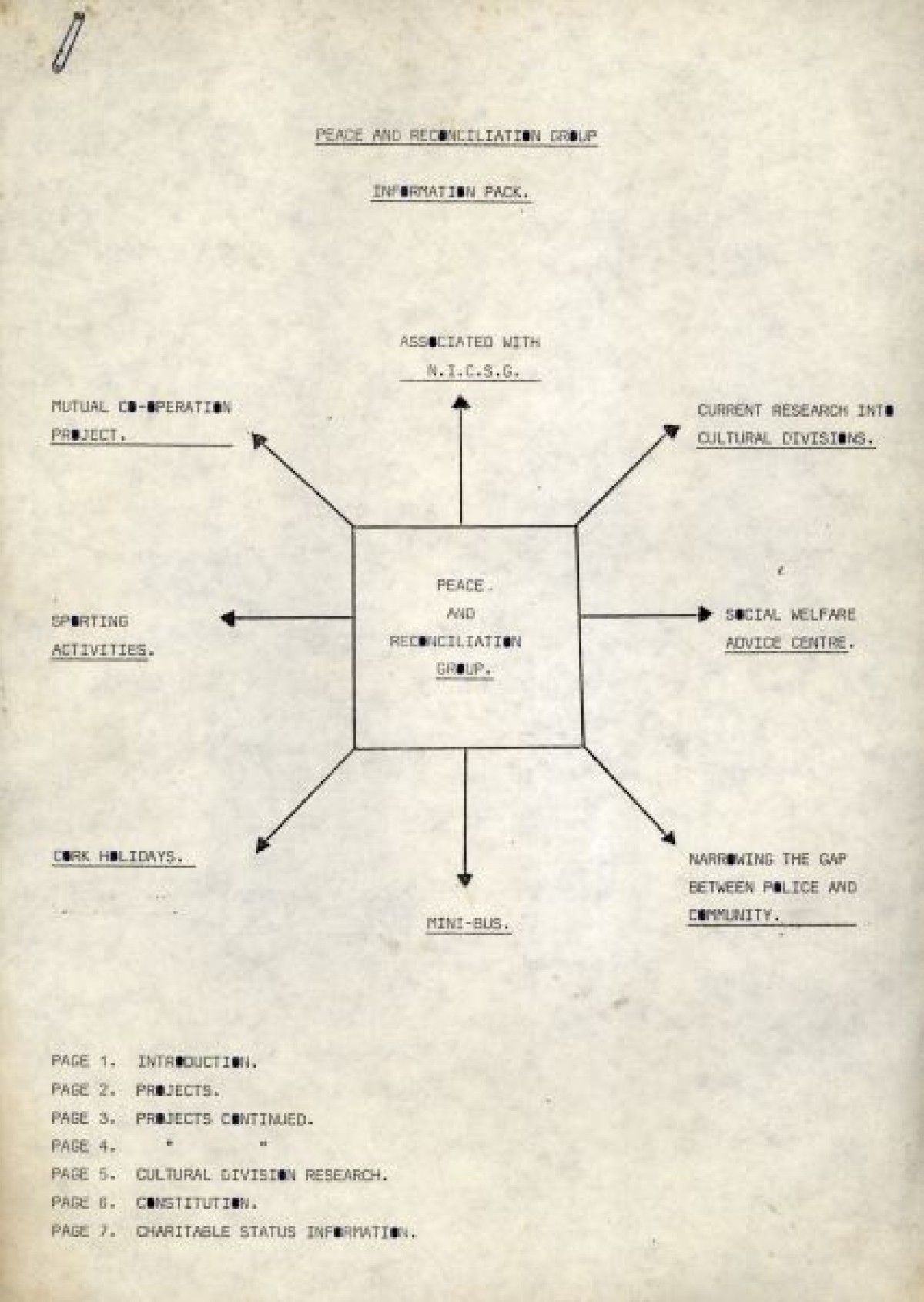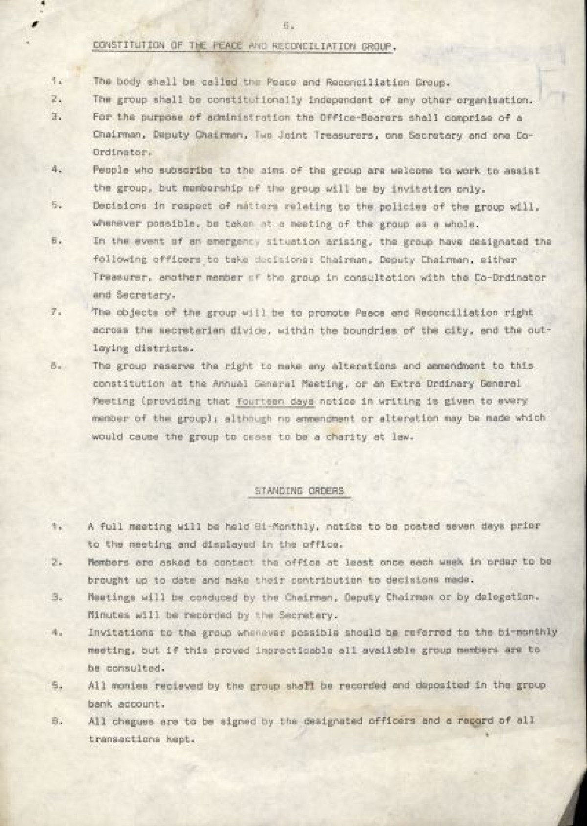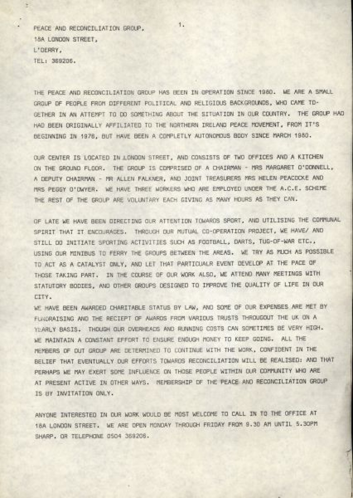 Peace and Reconciliation Group, comprising of chairman Margaret O'Donnell, Deputy Allen Falkner and Joint Treasurers Helen Peacocke and Peggy O'Dwyer. Featuring details of organisation structure, history and objectives.