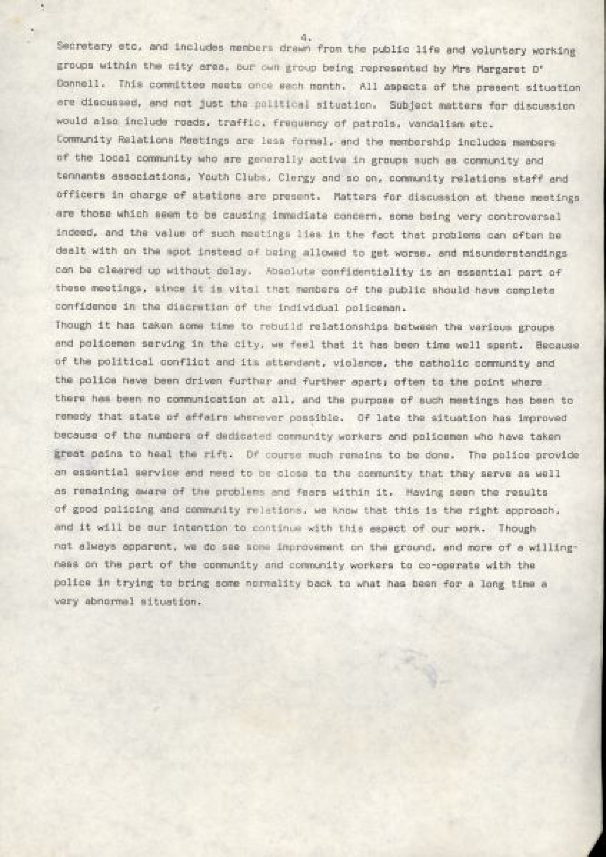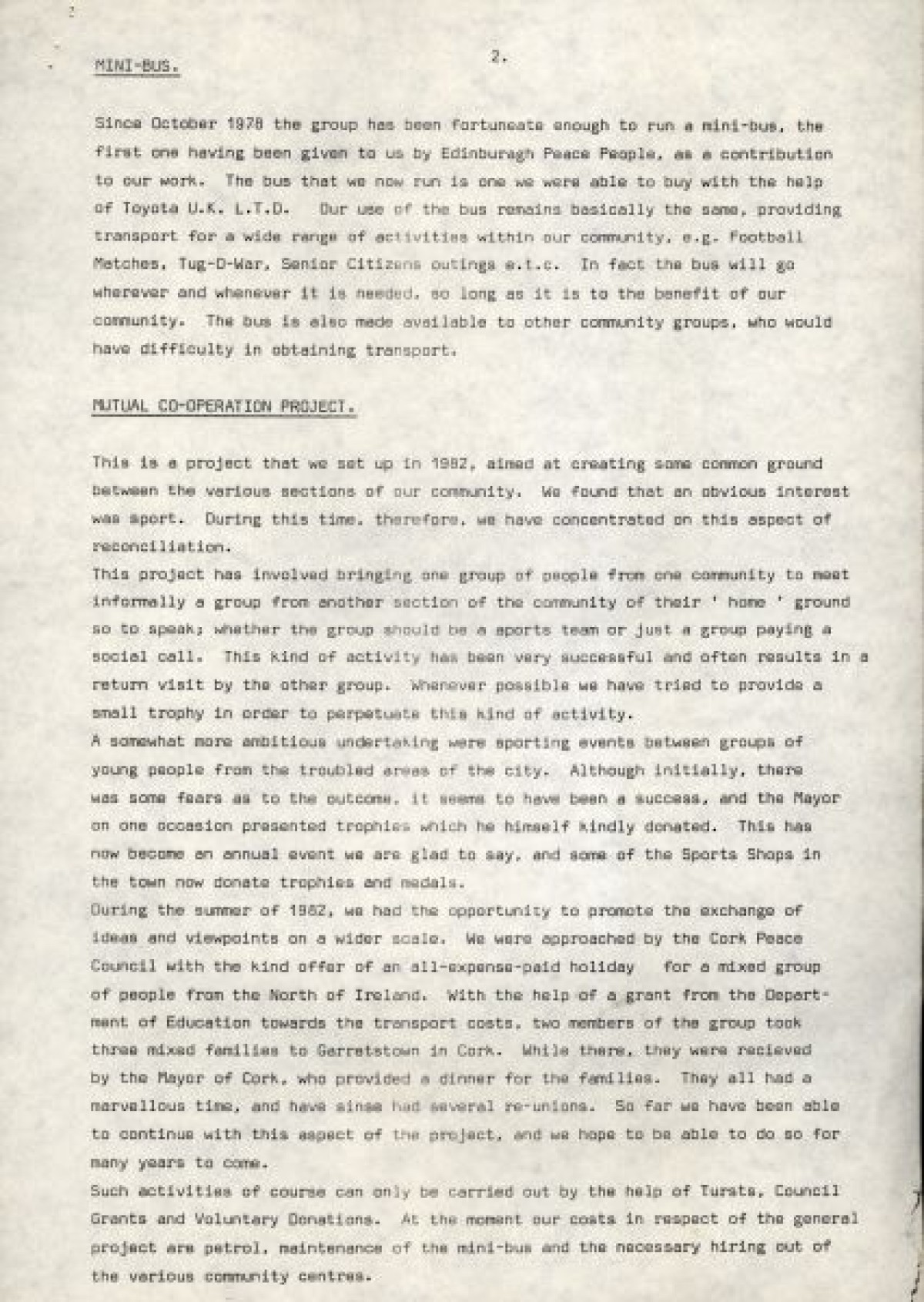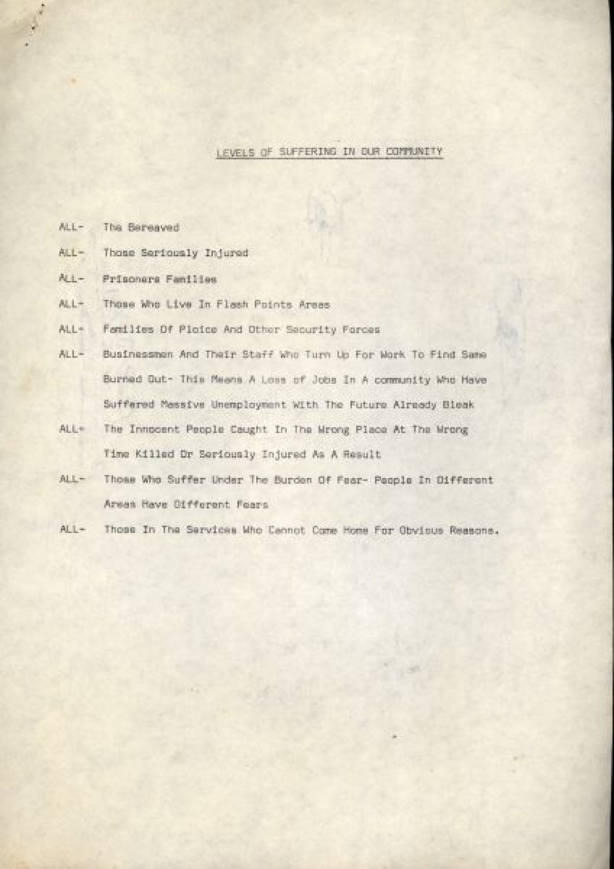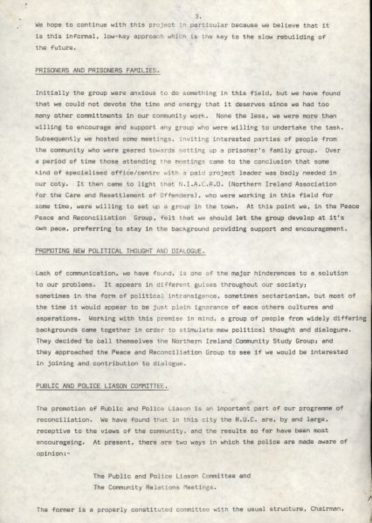 Peace and Reconciliation Group, comprising of chairman Margaret O'Donnell, Deputy Allen Falkner and Joint Treasurers Helen Peacocke and Peggy O'Dwyer. Featuring details of organisation structure, history and objectives.