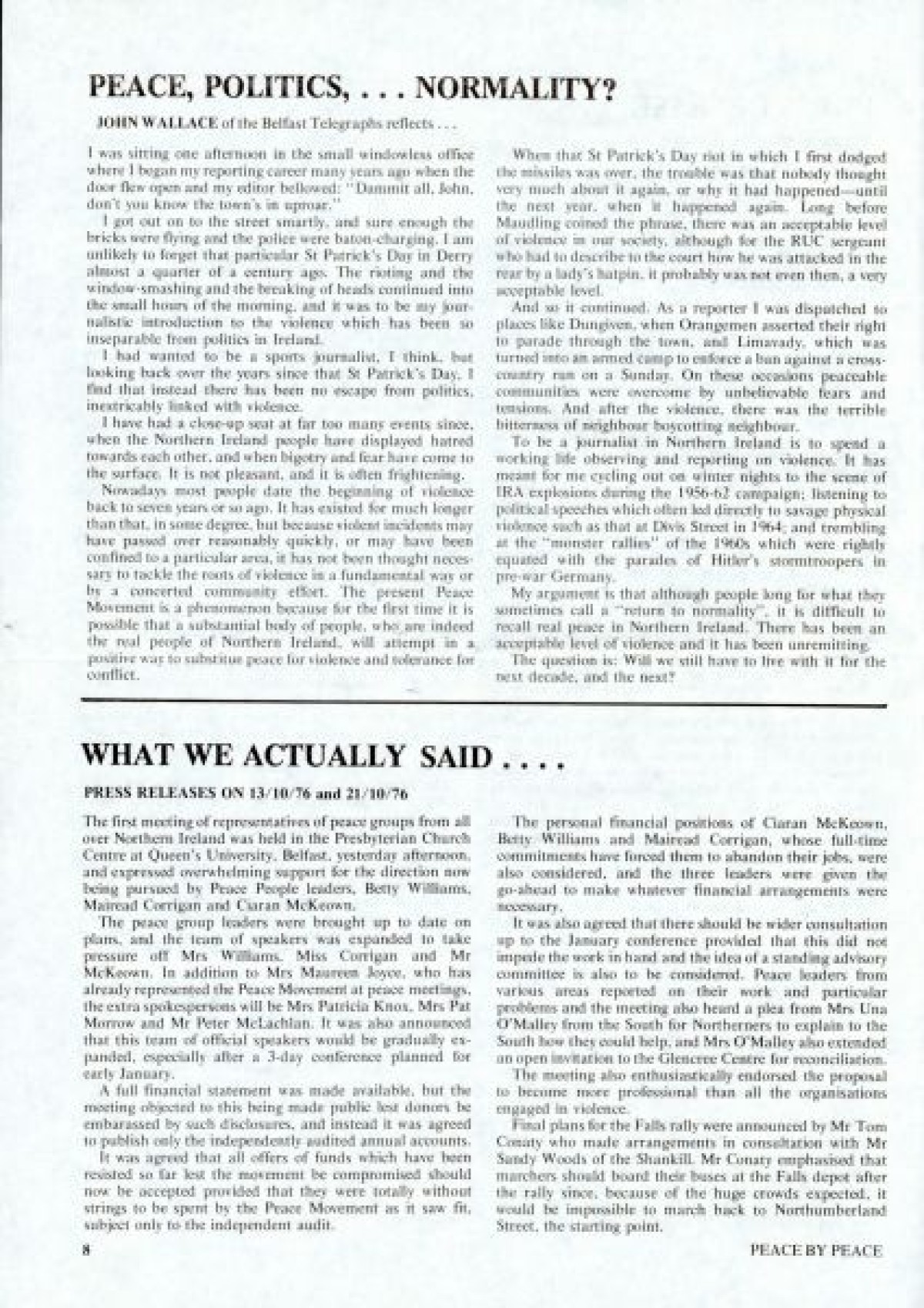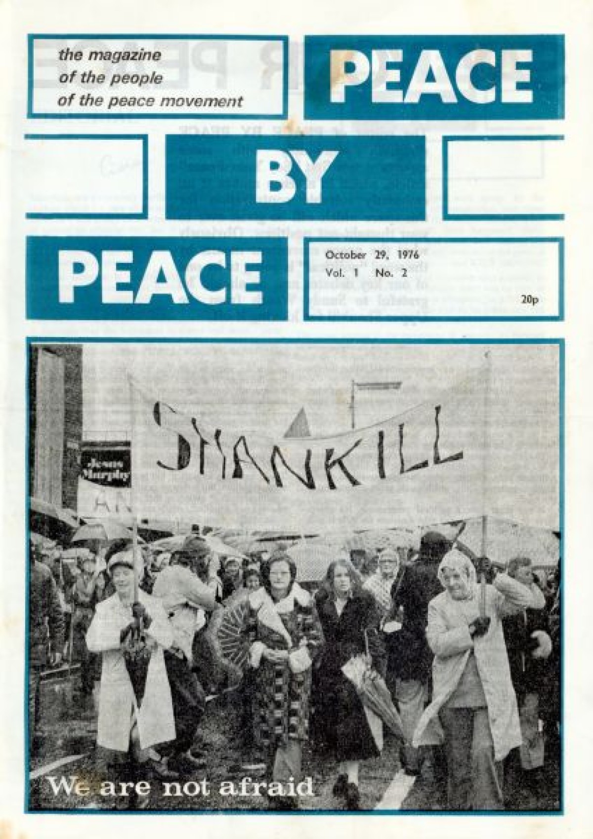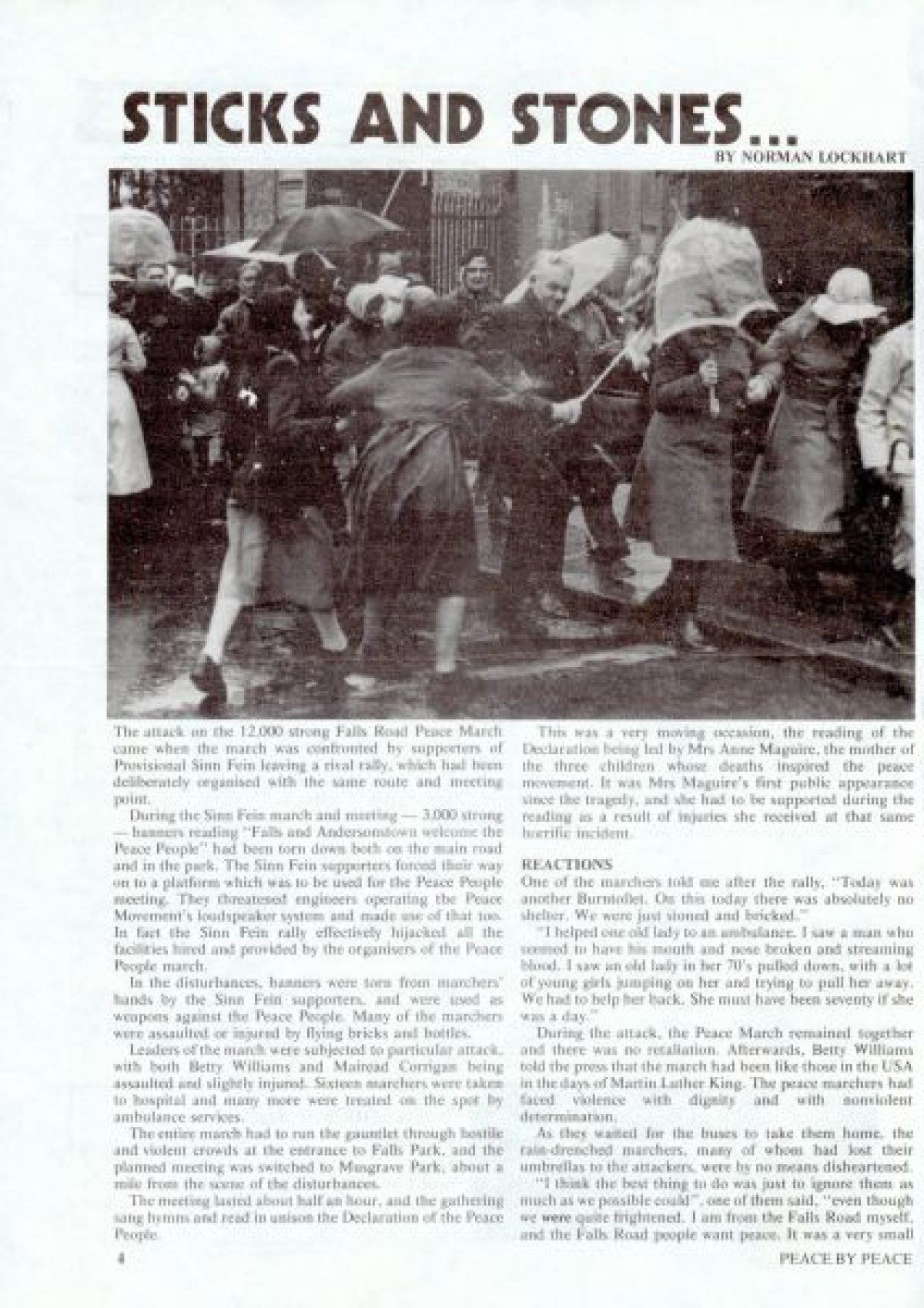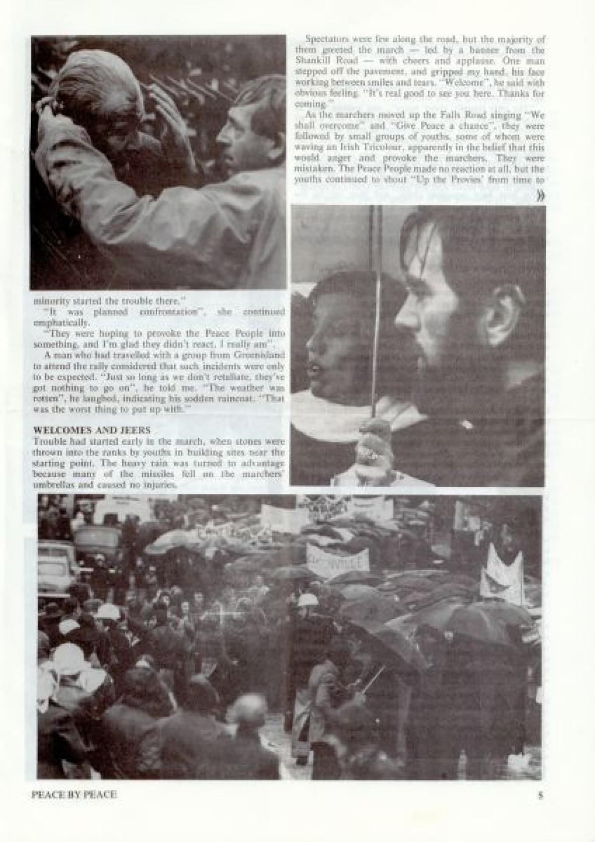 Peace by Peace, issue 2, volume 1, 29th October 1976, to promote the message of Peace People. Contains various articles relating to the peace movement, including "Say Your Peace," by Sandy Woods, suggesting priorities for the peace movement; an extract from Martin Luther King's "Pilgrimage to Nonviolence"; and a report on an attack during a Peace People march, accompanied by black and white photographs from the incident.