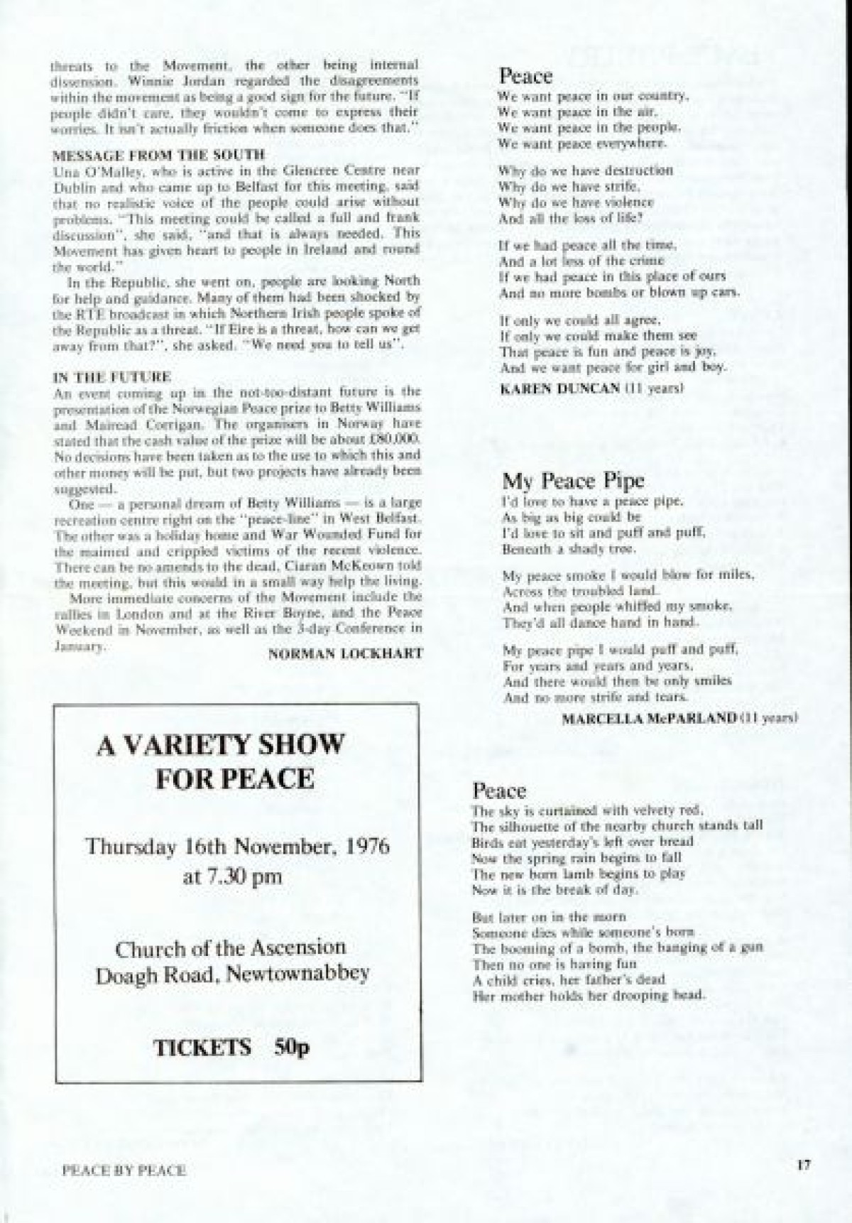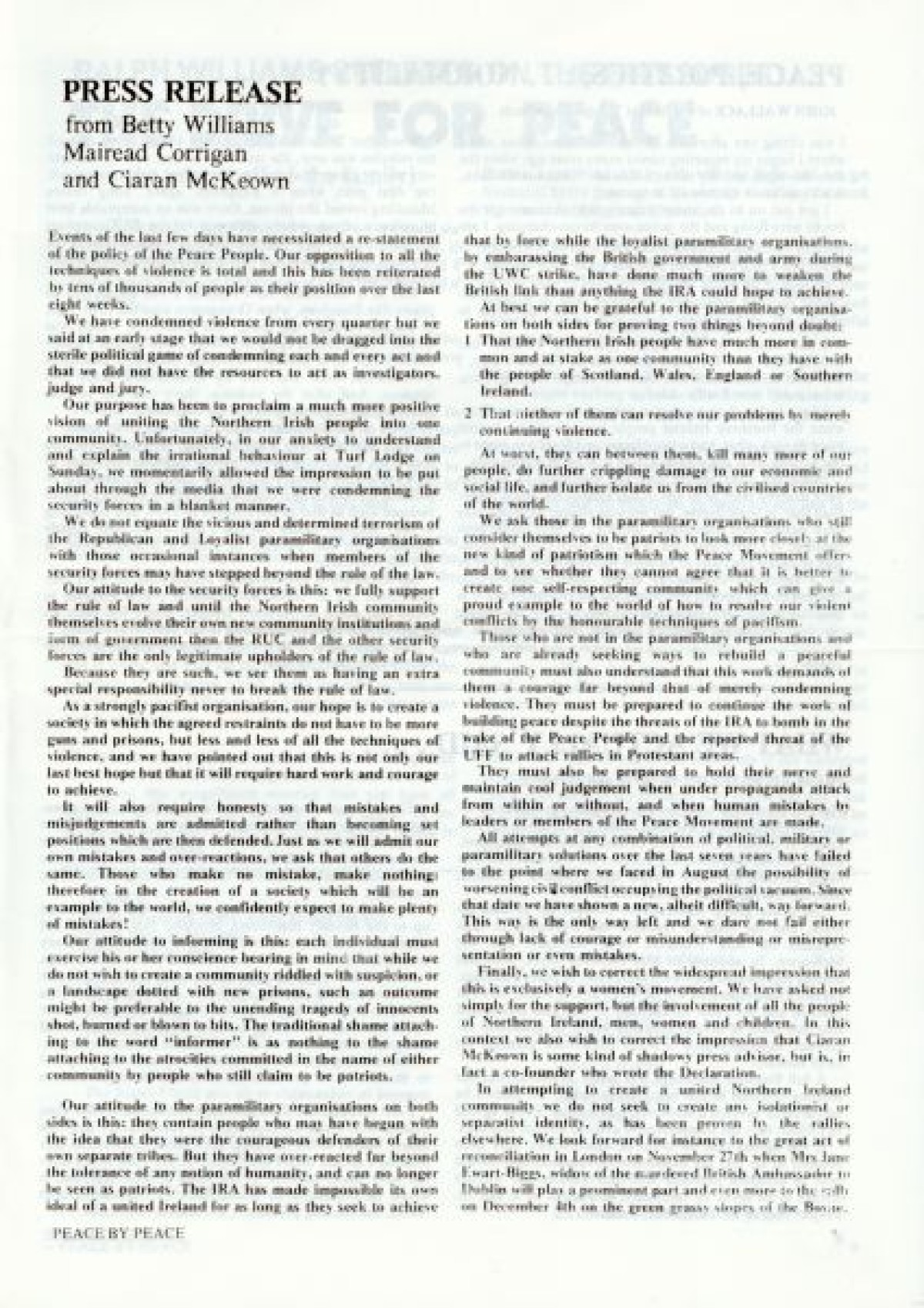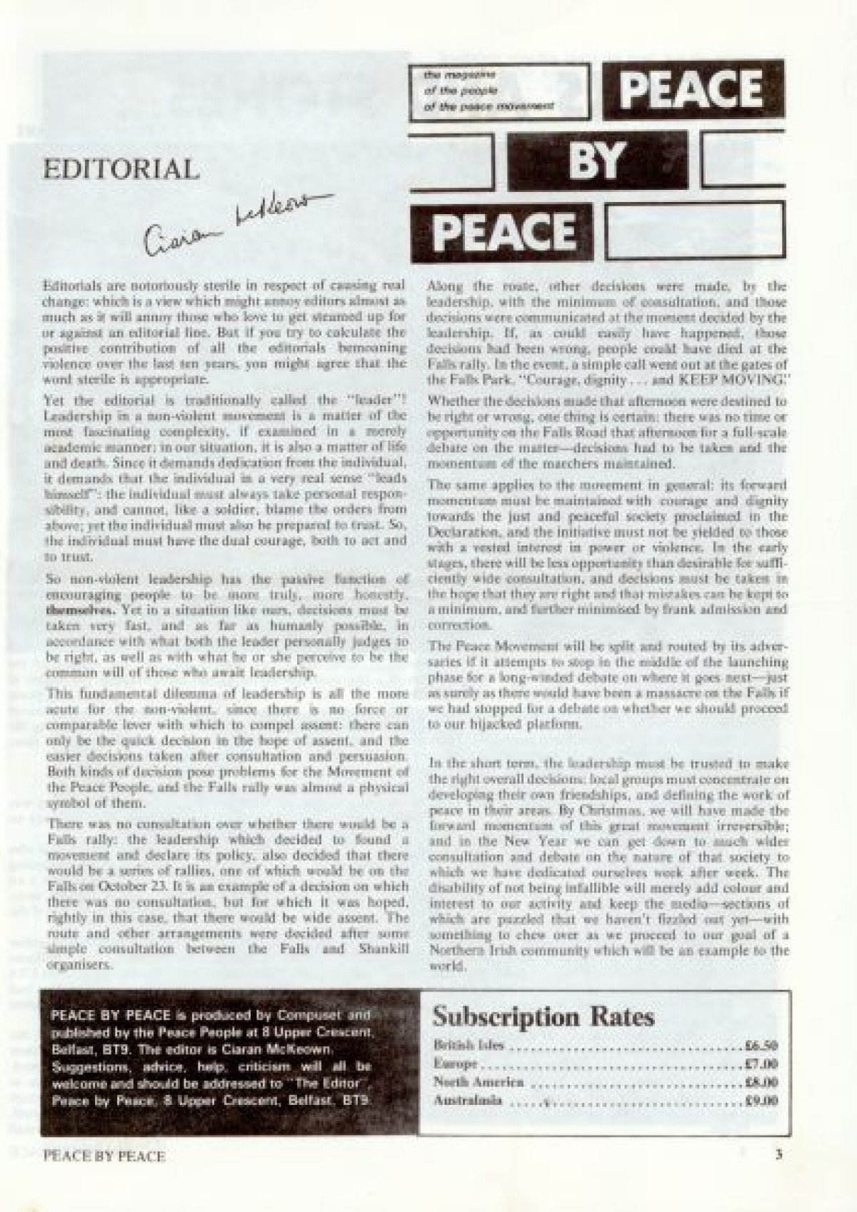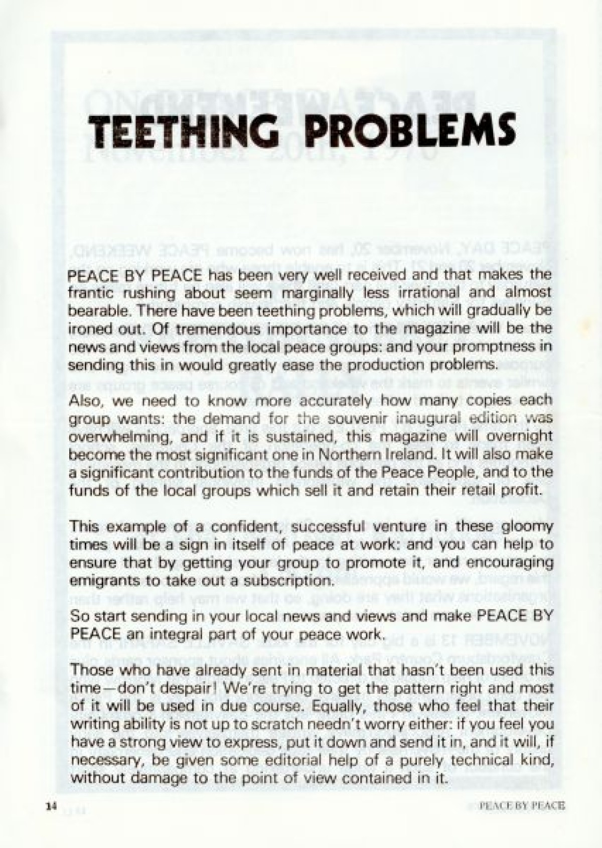 Peace by Peace, issue 2, volume 1, 29th October 1976, to promote the message of Peace People. Contains various articles relating to the peace movement, including "Say Your Peace," by Sandy Woods, suggesting priorities for the peace movement; an extract from Martin Luther King's "Pilgrimage to Nonviolence"; and a report on an attack during a Peace People march, accompanied by black and white photographs from the incident.