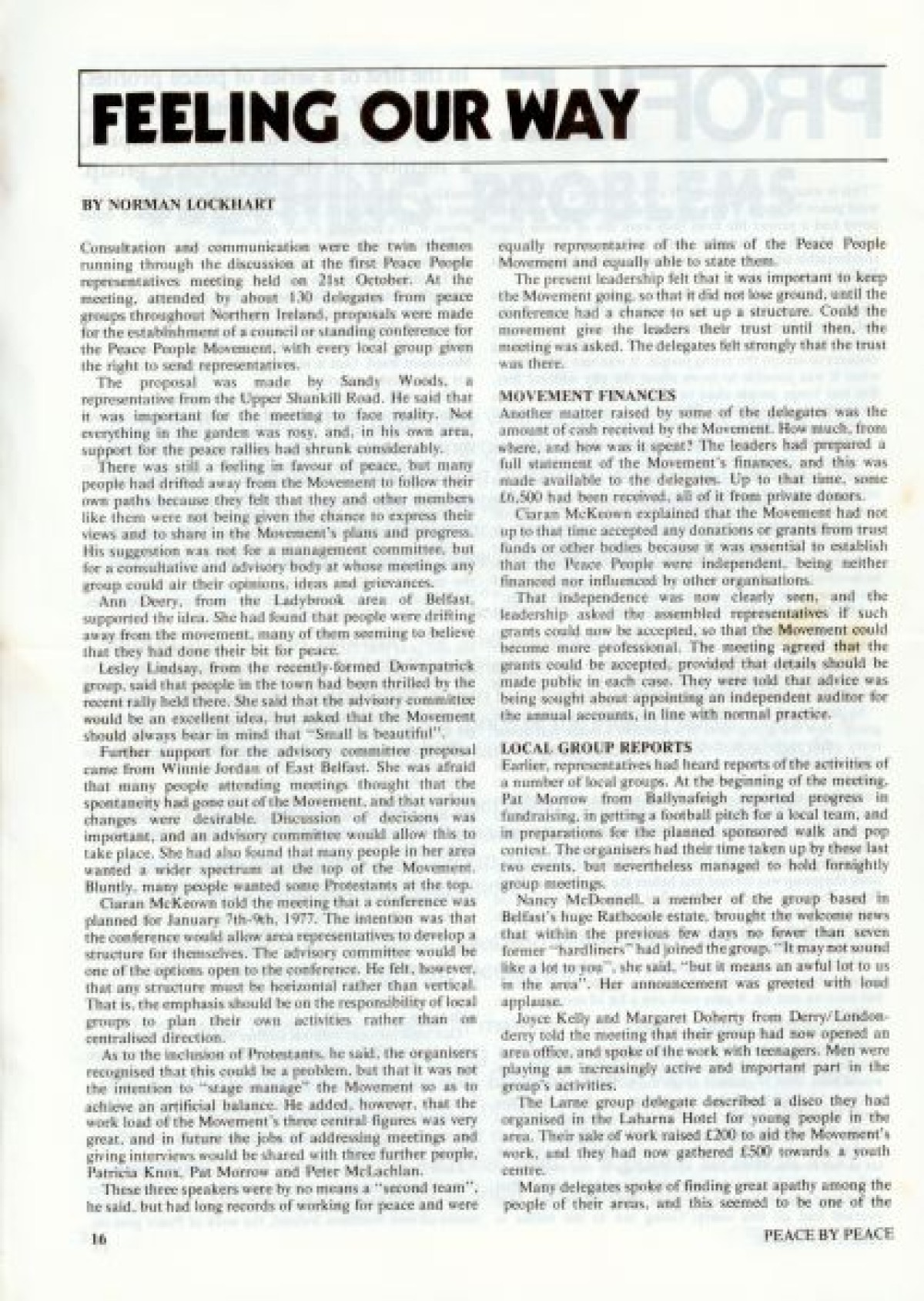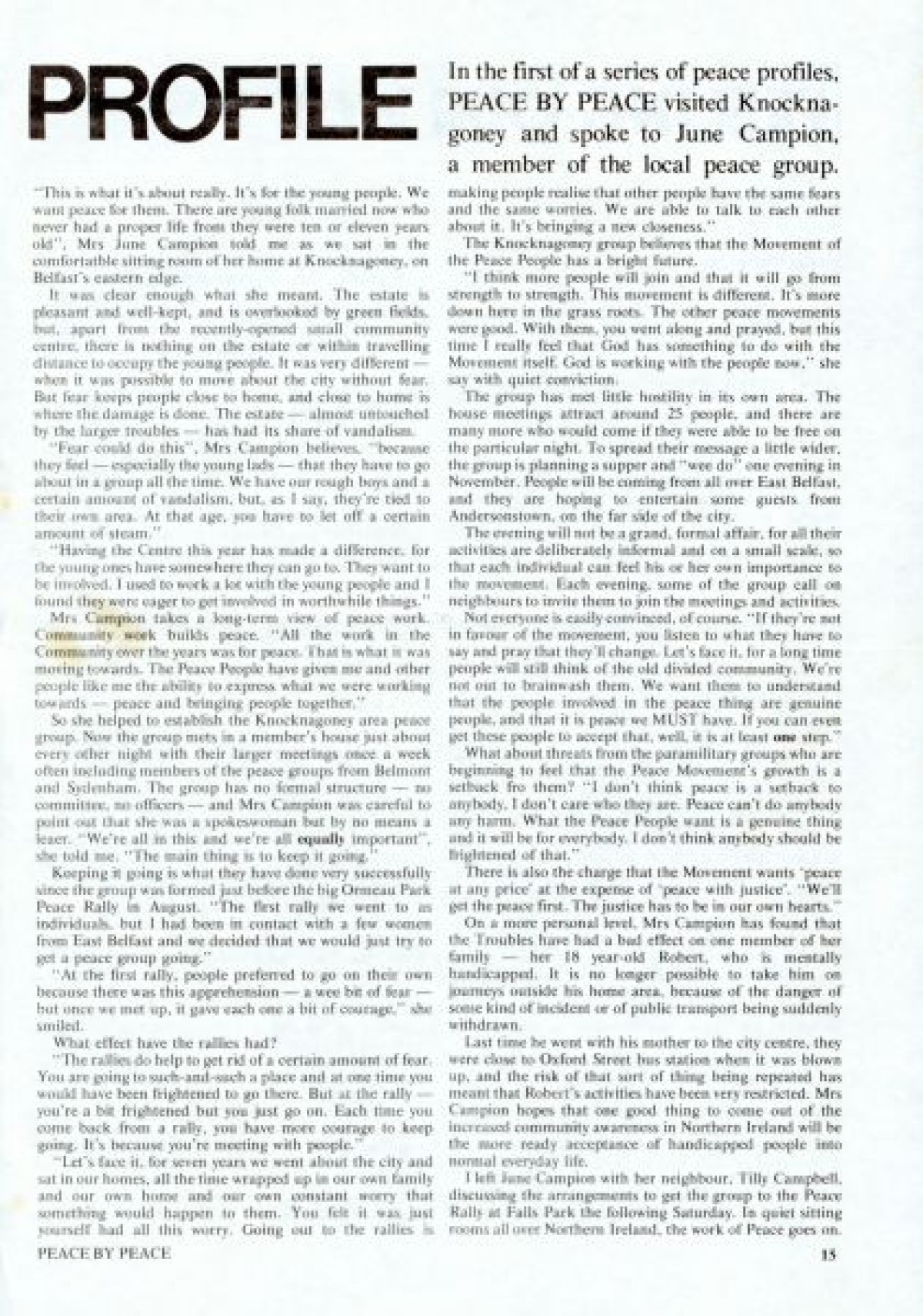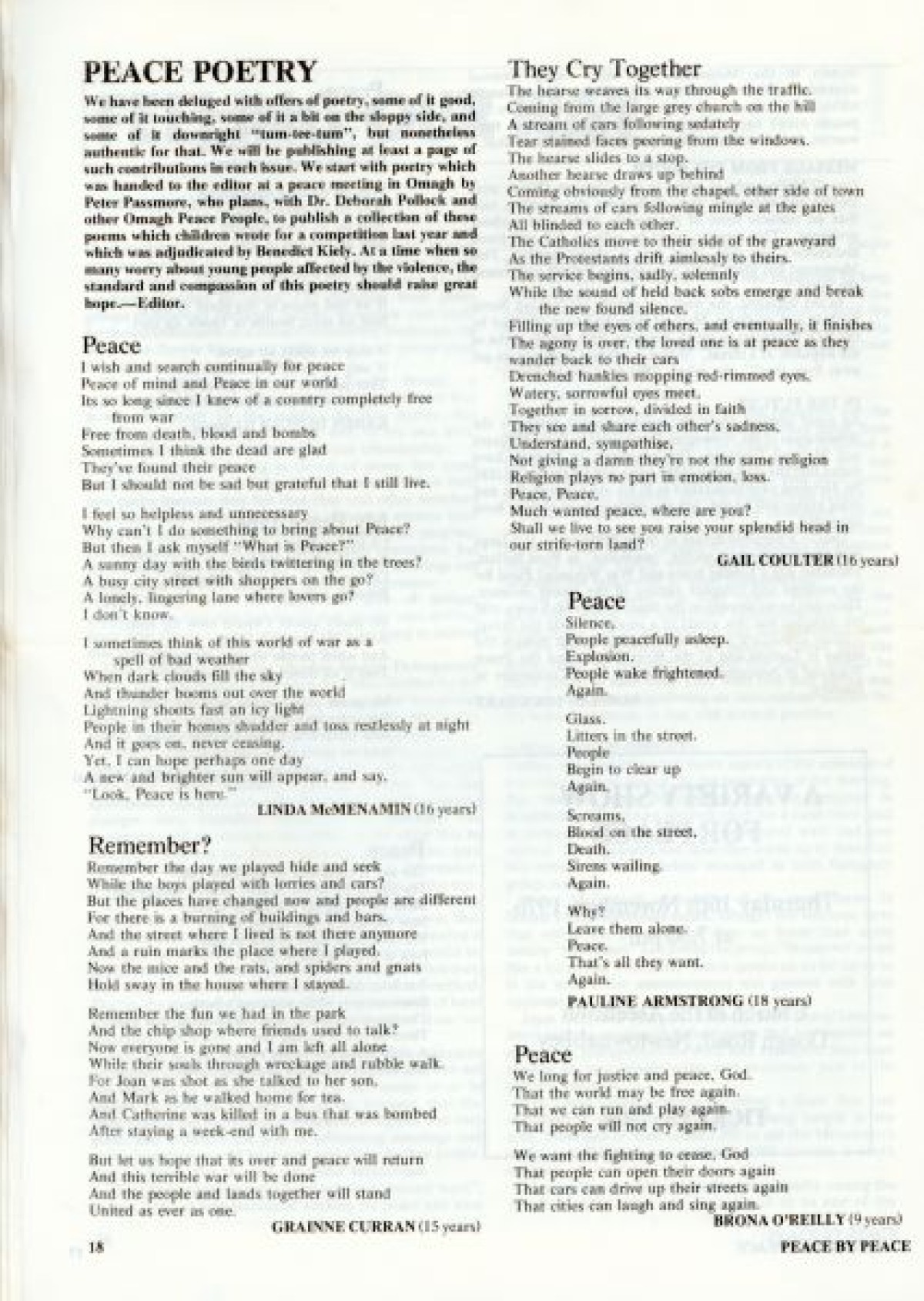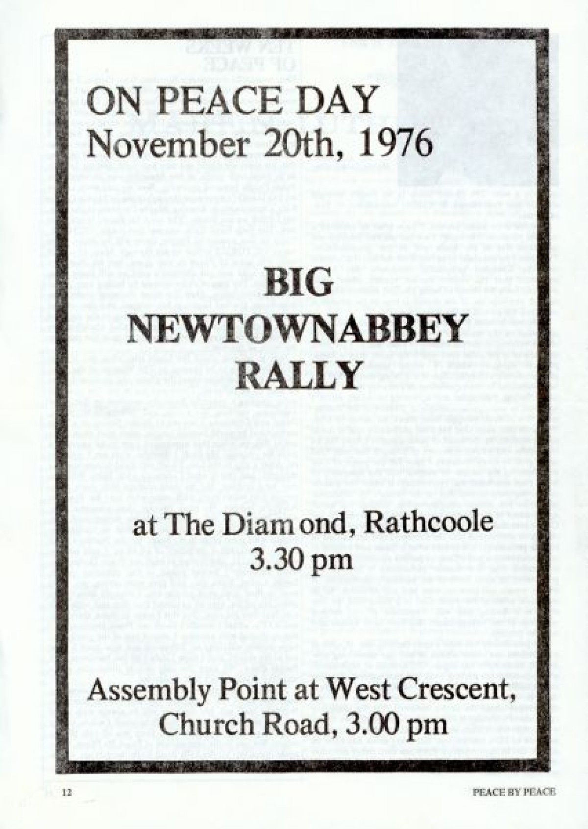 Peace by Peace, issue 2, volume 1, 29th October 1976, to promote the message of Peace People. Contains various articles relating to the peace movement, including "Say Your Peace," by Sandy Woods, suggesting priorities for the peace movement; an extract from Martin Luther King's "Pilgrimage to Nonviolence"; and a report on an attack during a Peace People march, accompanied by black and white photographs from the incident.
